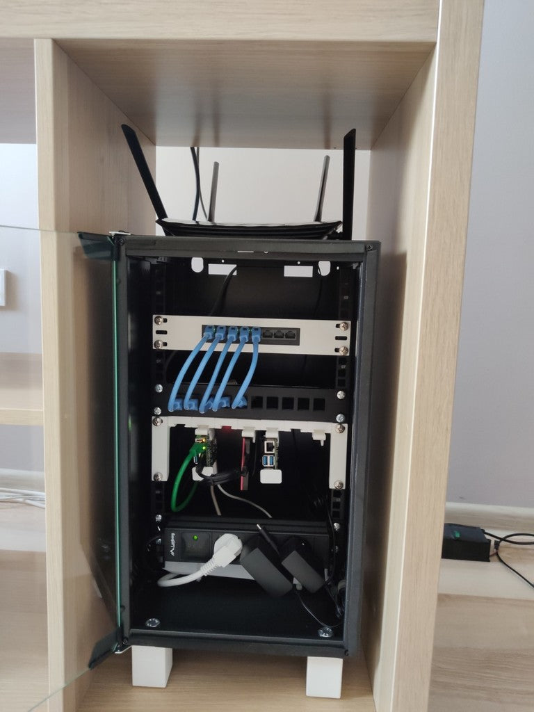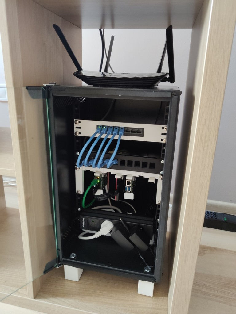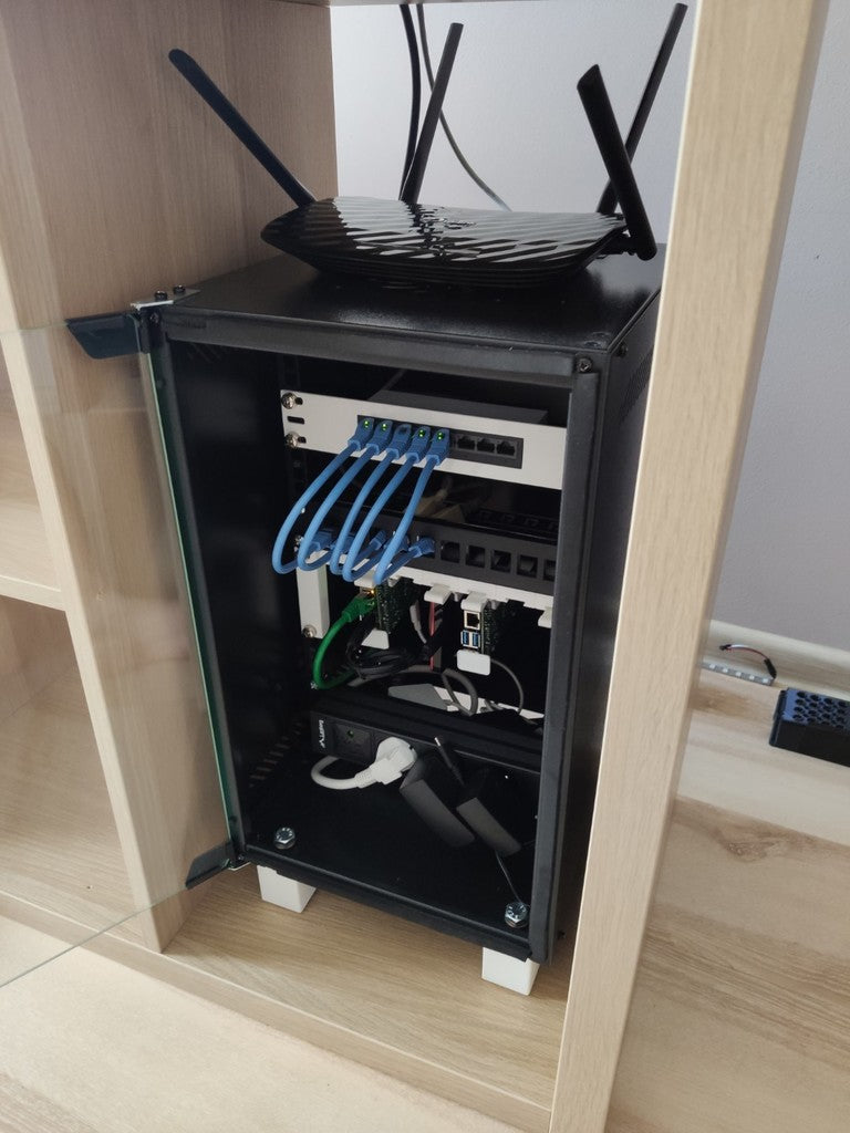 Een serverrek voor thuis, ontworpen voor gebruik met een behuizing van 10 inch. Gemaakt met speciale hefpoten die in een IKEA Kallax-plank passen. Perfect voor het organiseren van uw serverunits of Raspberry Pi-opstellingen.