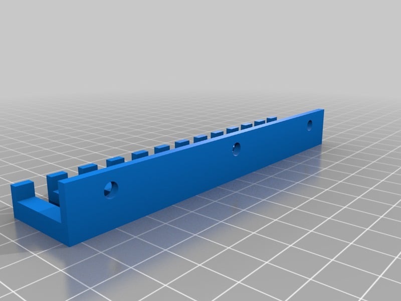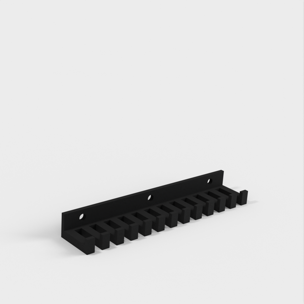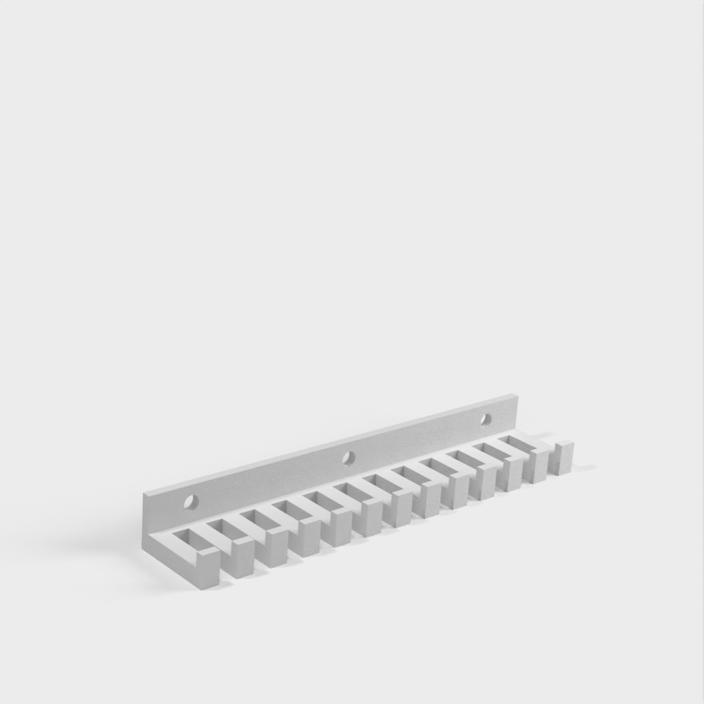 Een kleine kabelhouder met 12 sleuven is ontworpen om eenvoudig aan de zijkant van je werkbank te bevestigen voor kleinere kabels, zoals USB-kabels. Hij is 125 mm lang met 12 sleuven van 5 mm breed. De uiteinden hebben een verhoging van 4 mm zodat de kabels er niet afglijden.