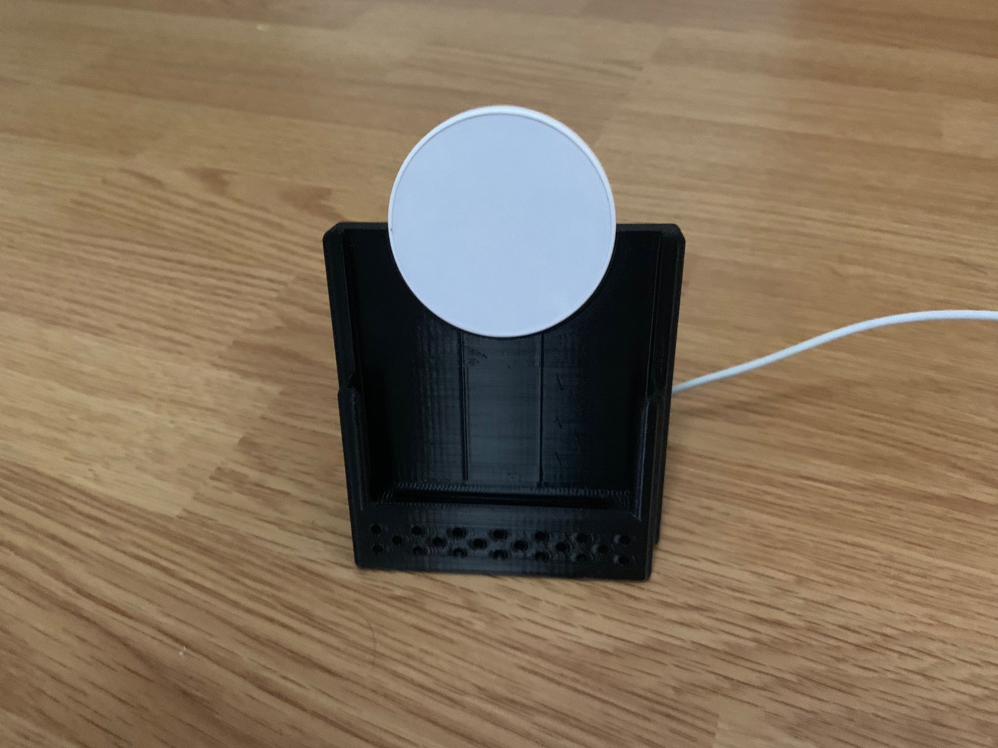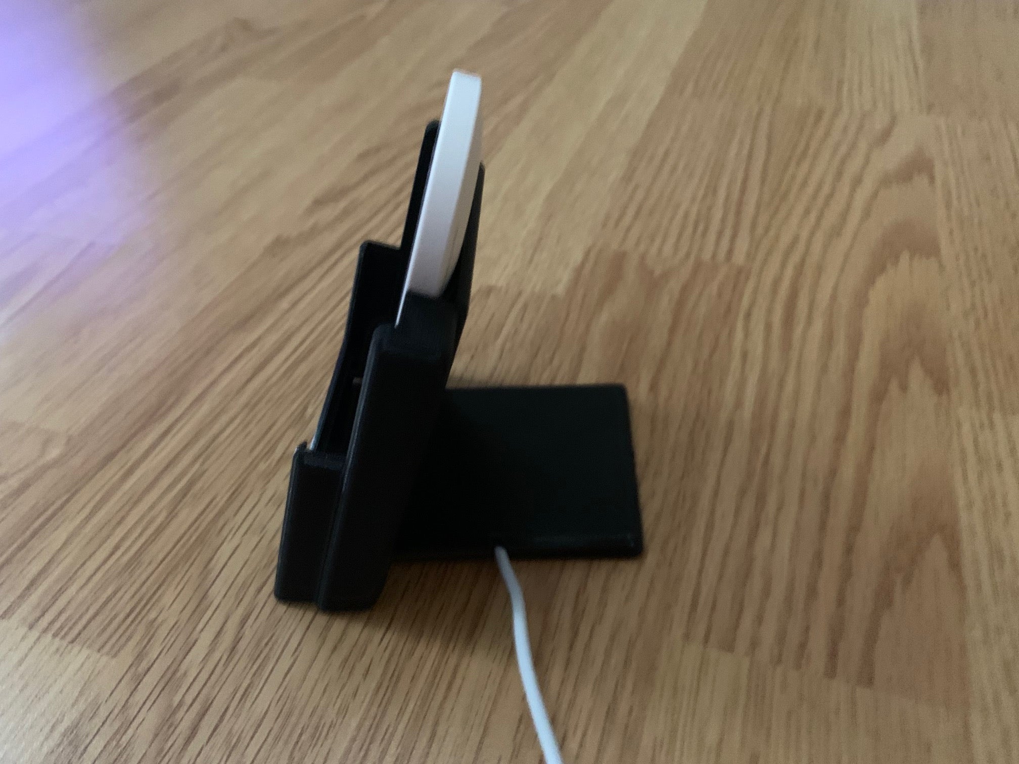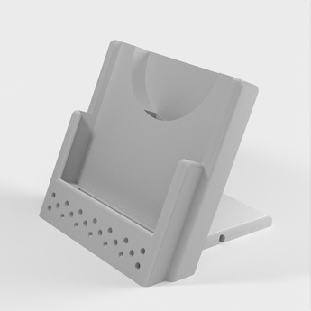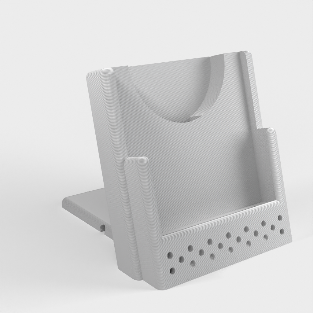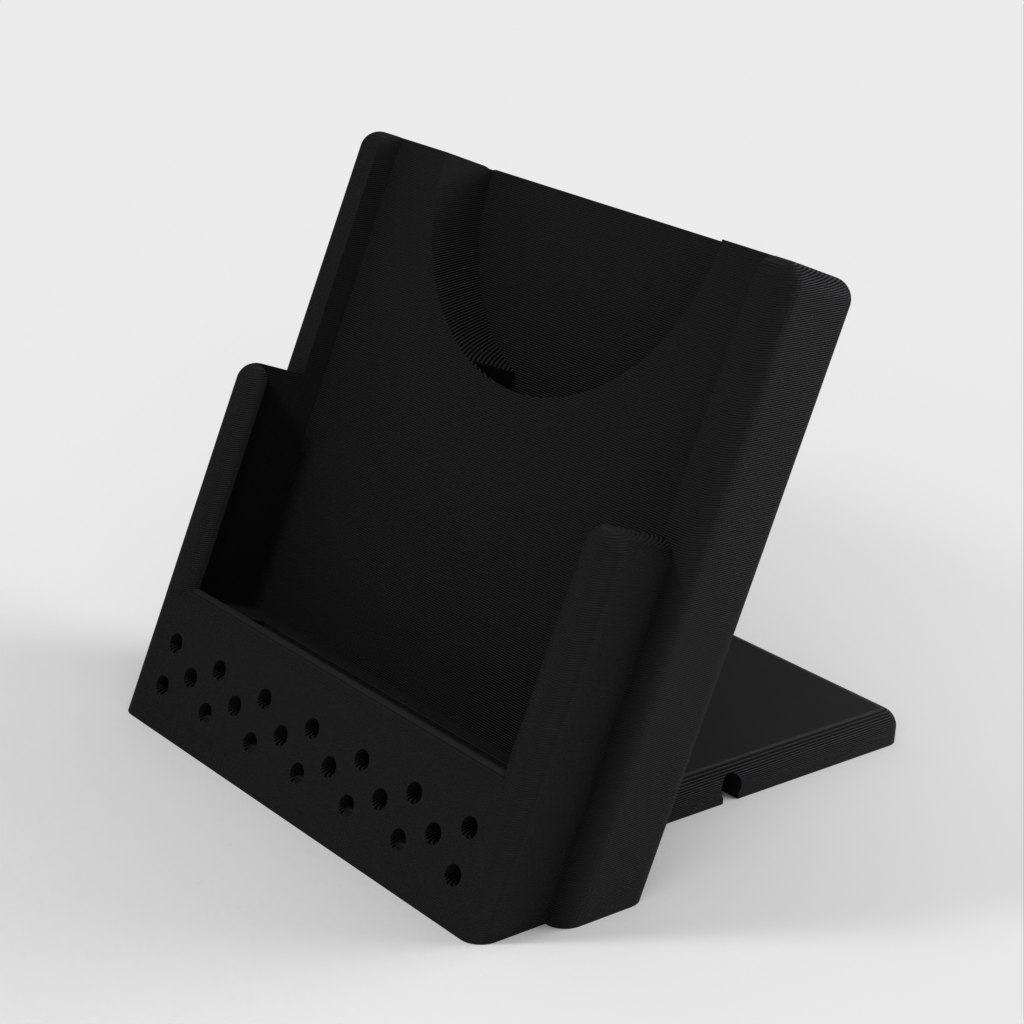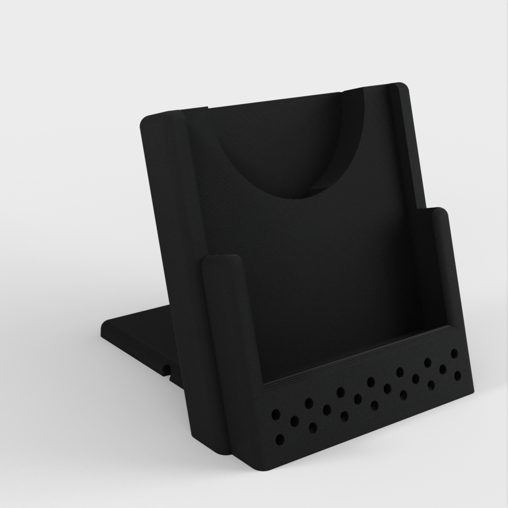 Hier is een aanpasbare draadloze telefoonoplaadstandaard. Het heeft een ontwerp met verstelbare kabelgeleiders waarmee je kunt kiezen of de kabel de lader links, rechts of naar achteren verlaat. Hij kan worden aangepast voor een iPhone XS met een oplader van derden, maar kan ook eenvoudig worden aangepast voor elke andere combinatie van telefoon en oplader.