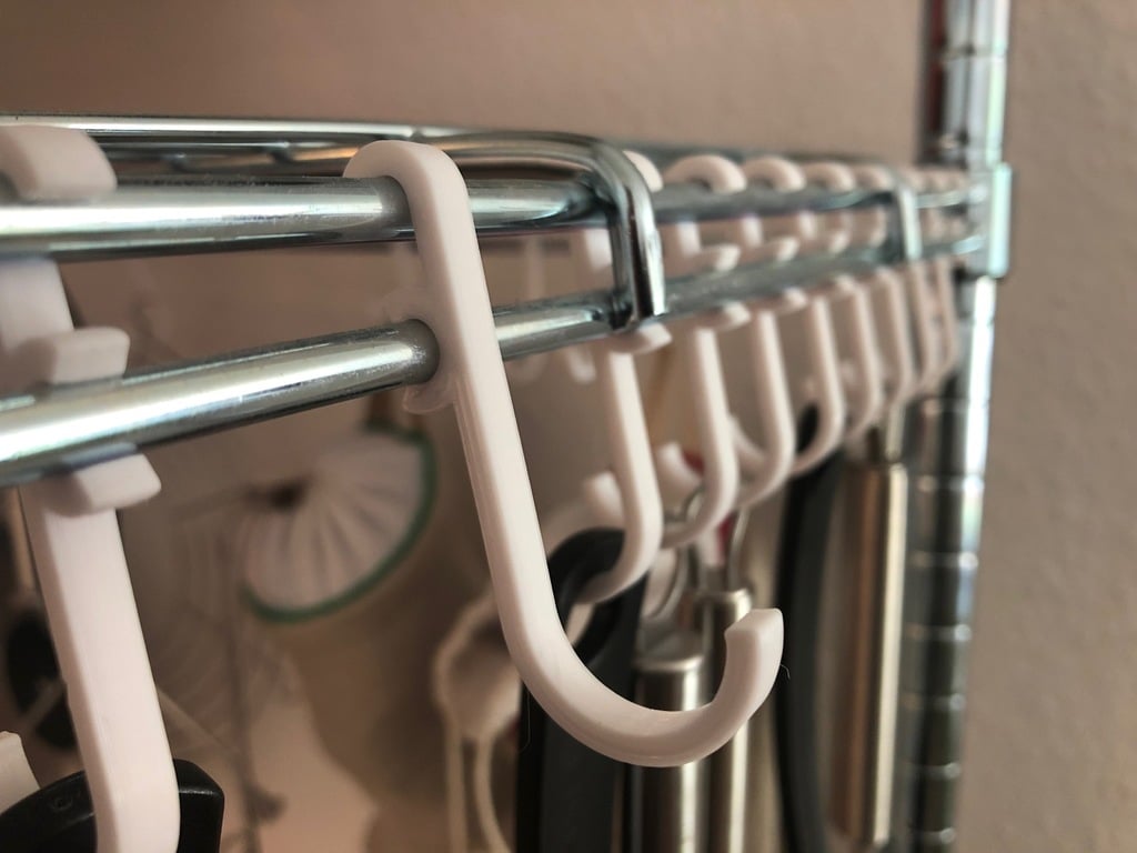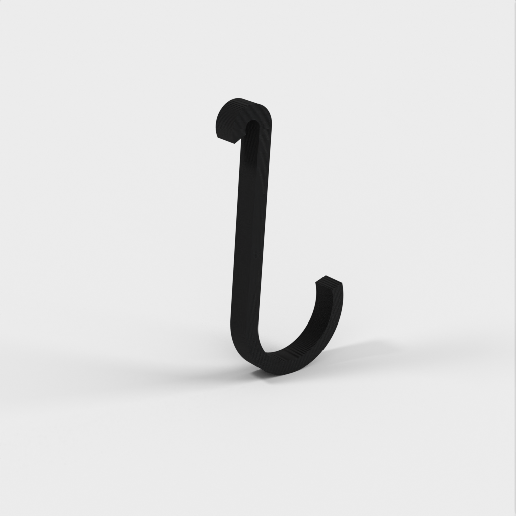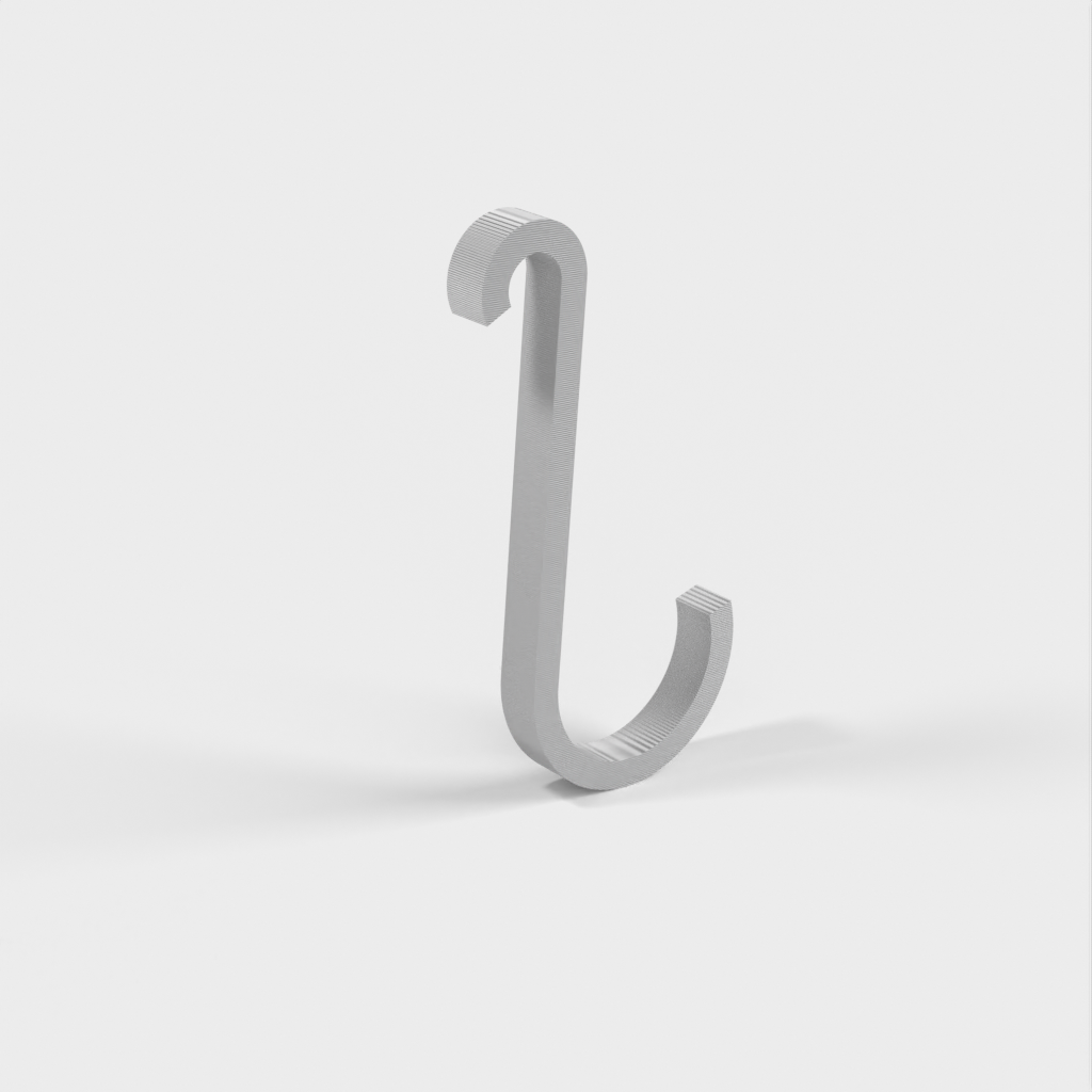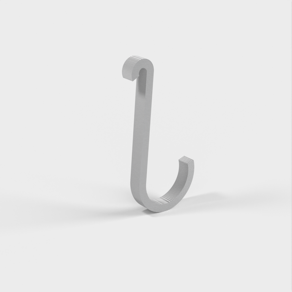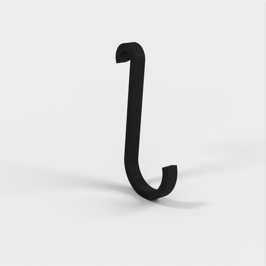 Een verstelbare haak die perfect past op de spijlen van de IKEA Omar plank. We gebruiken het om ons keukengerei aan op te hangen. De haak heeft een nauwsluitende pasvorm zodat hij er niet af valt of te veel verschuift bij het ophangen of pakken van spullen.