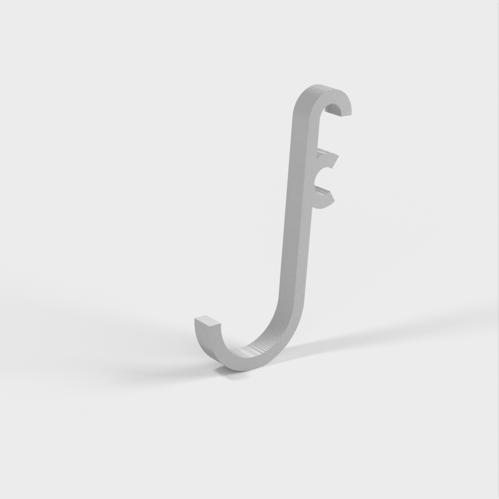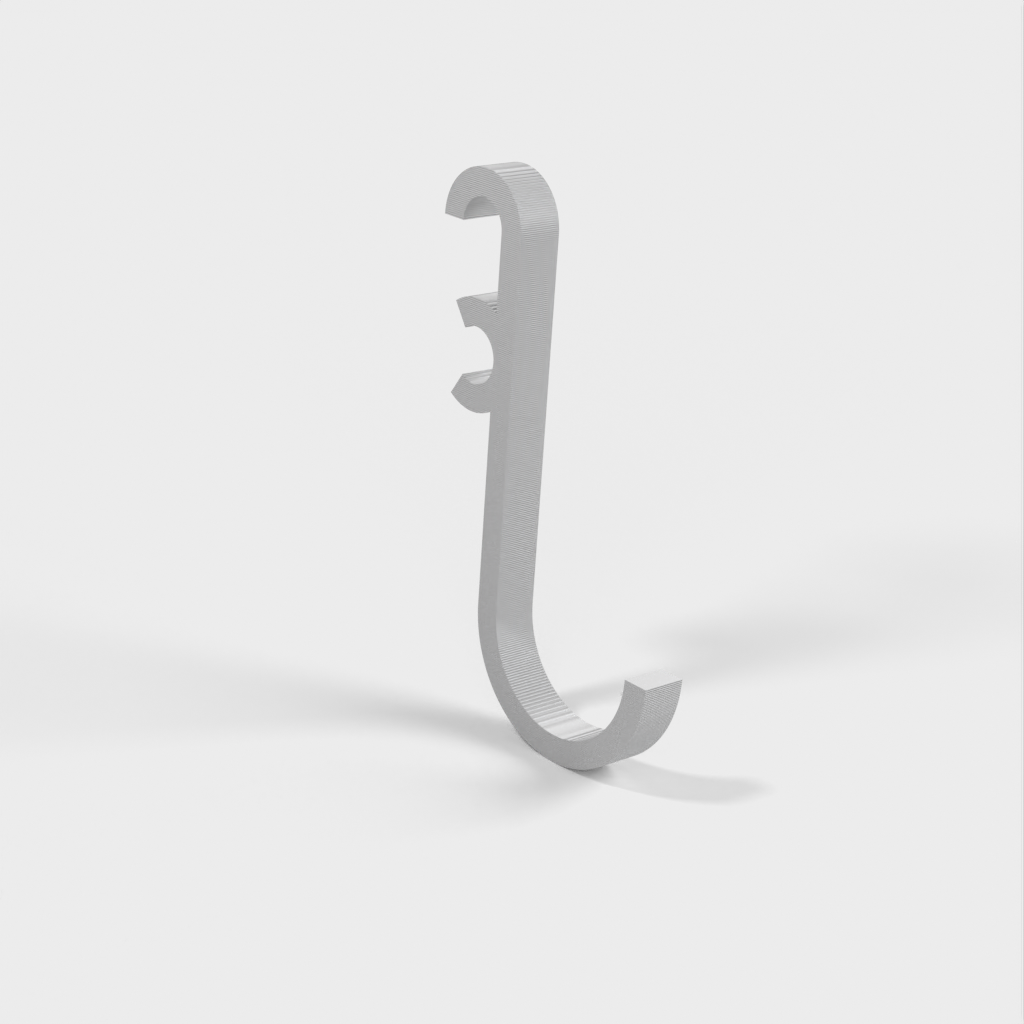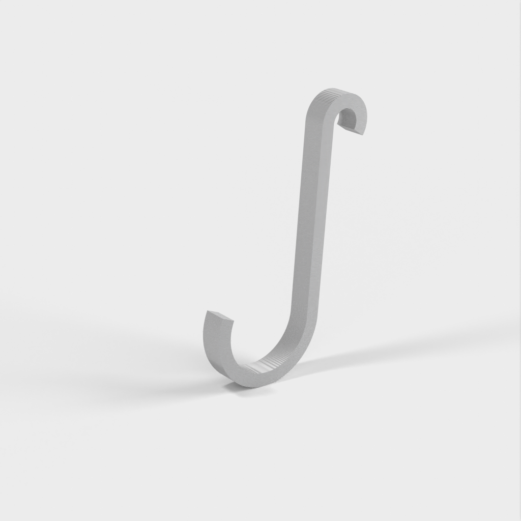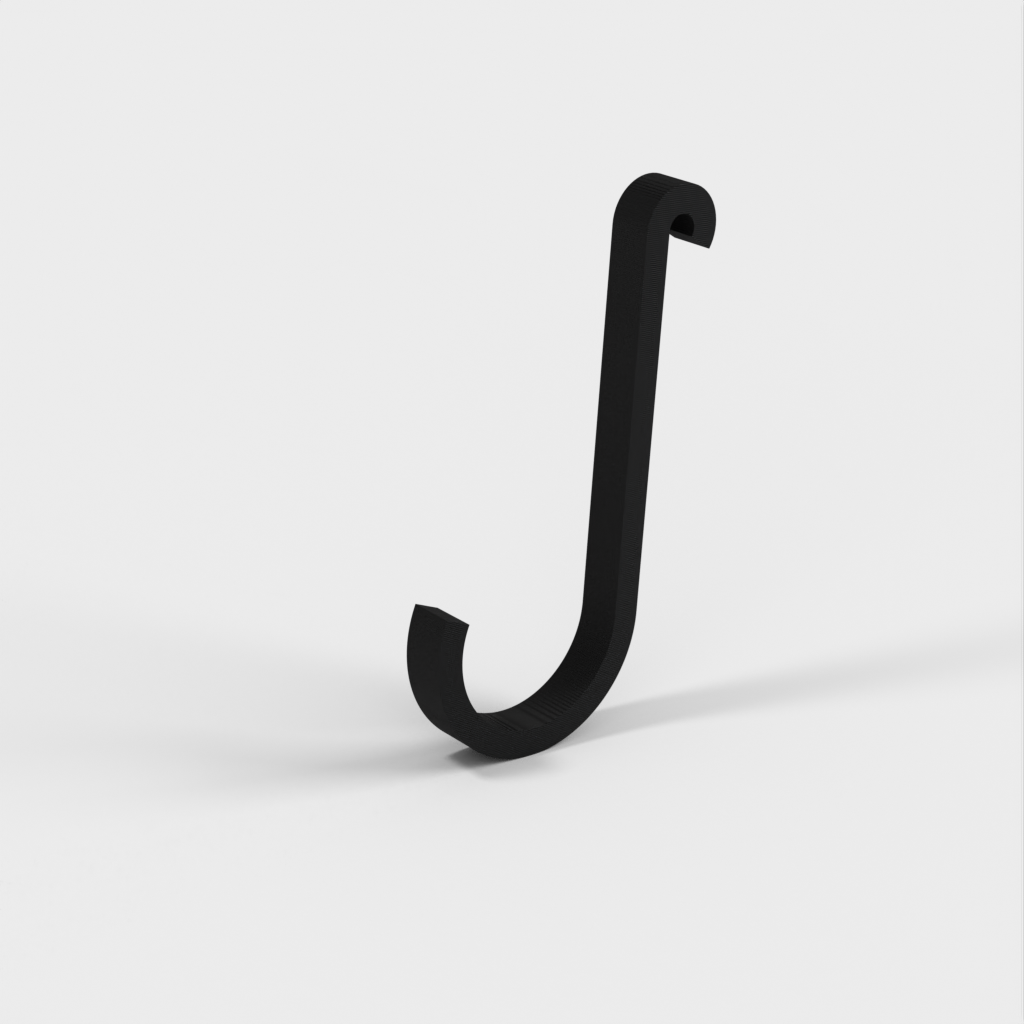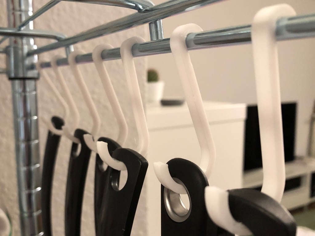 Een verstelbare haak die perfect past op de spijlen van de IKEA Omar plank. We gebruiken het om ons keukengerei aan op te hangen. De haak heeft een nauwsluitende pasvorm zodat hij er niet af valt of te veel verschuift bij het ophangen of pakken van spullen.