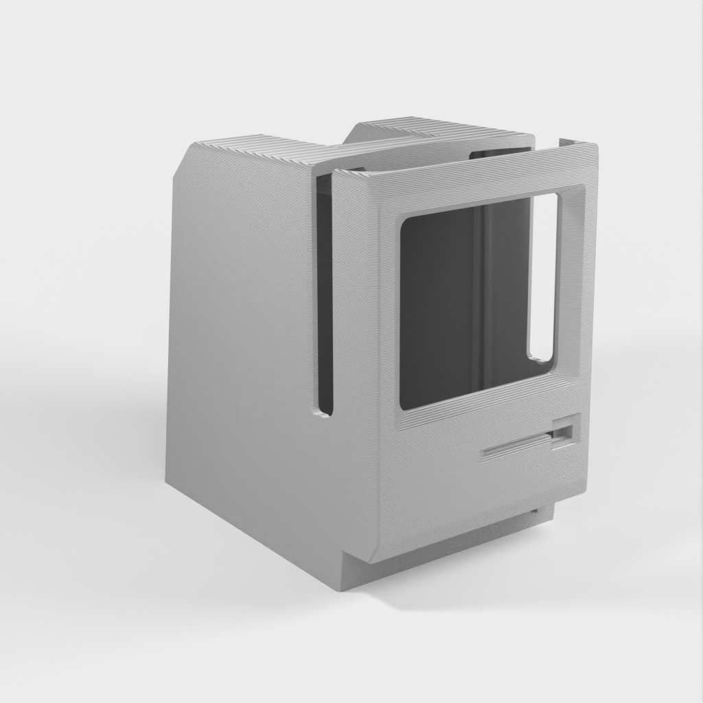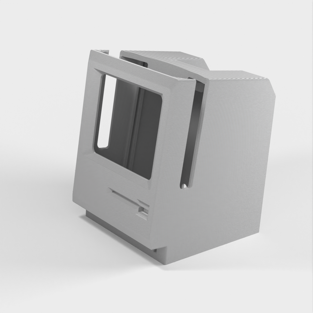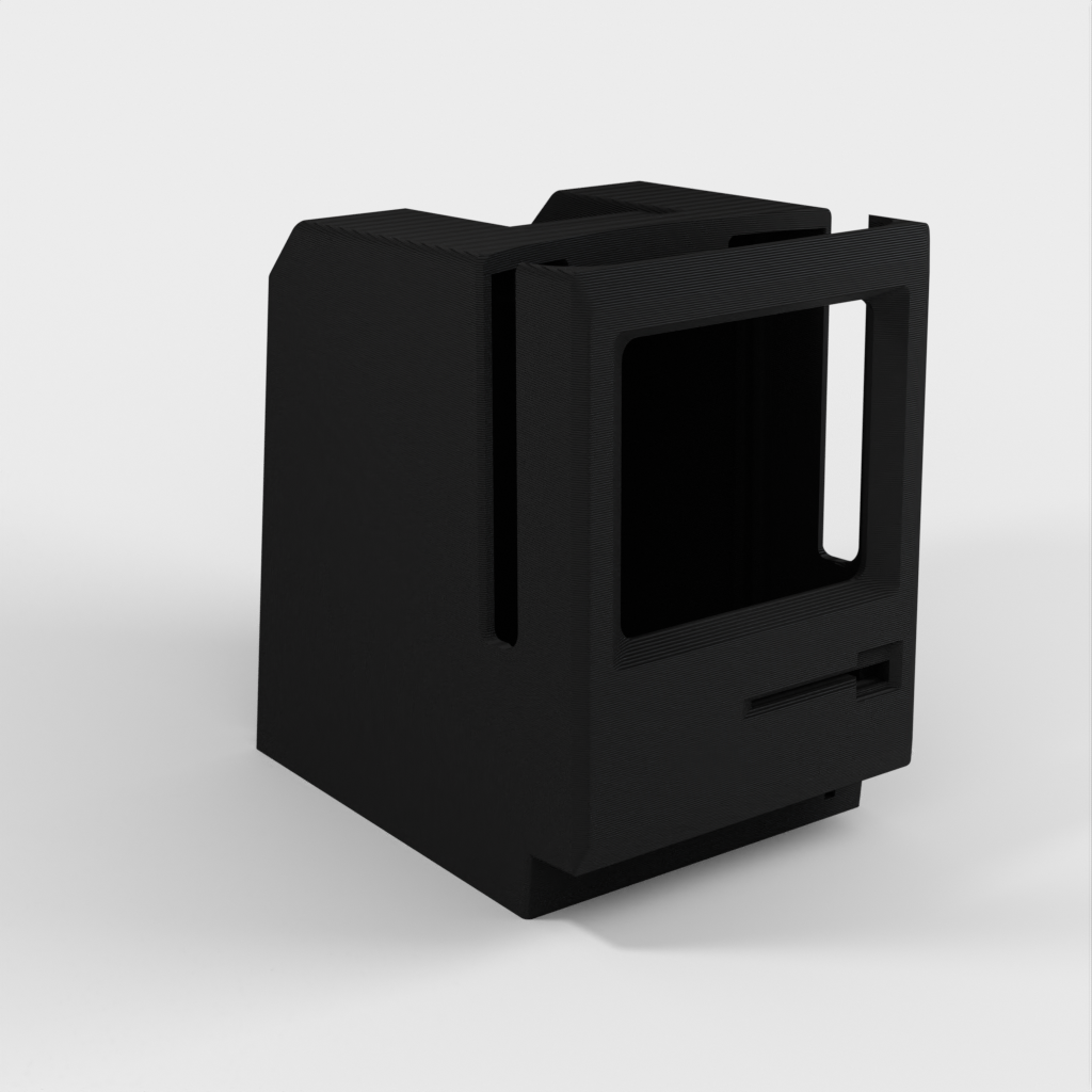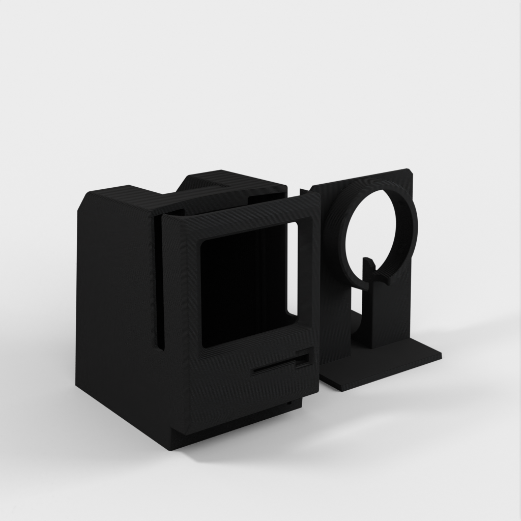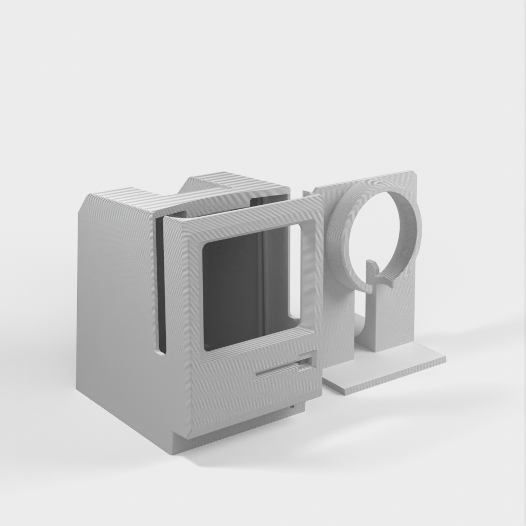 Apple Watch oplaaddock in klassieke Mac-stijl. Dit is een tweedelige oplaadstandaard voor de Apple Watch, waarbij deel 1 het draadloze oplaadmechanisme op zijn plaats houdt en deel 2 er bovenop schuift en een plek biedt om je Apple Watch neer te zetten. Aan de zijkanten van het omhulsel zitten sleuven die het horloge stevig bij het bandje houden, terwijl de magnetische oplader het horloge op zijn plaats houdt om op te laden. Het display loopt gelijk met het scherm van de Mac, zodat je het display kunt zien als het horloge in de nachtstand staat.