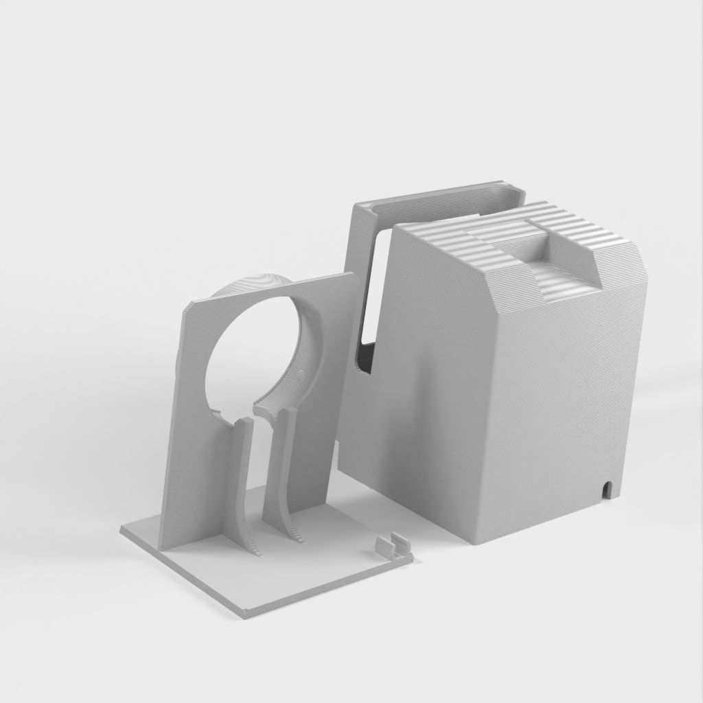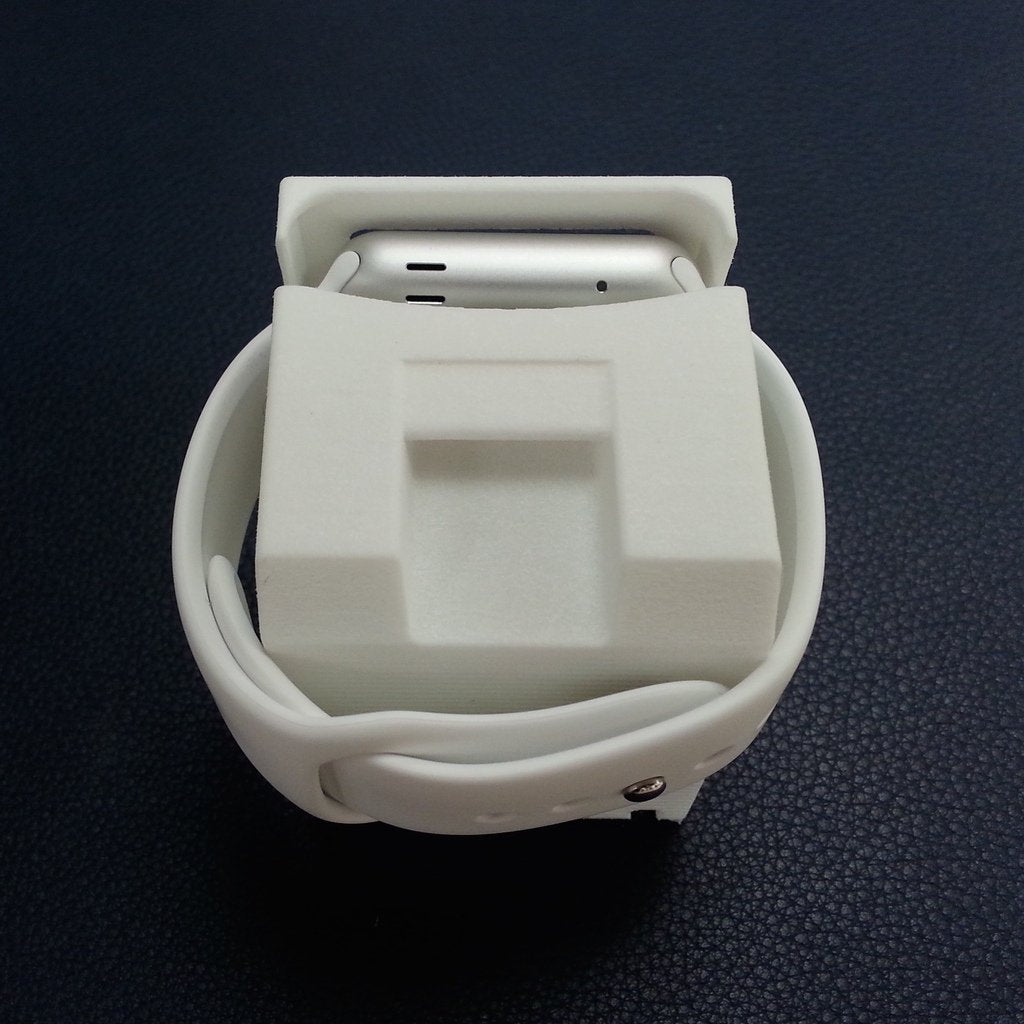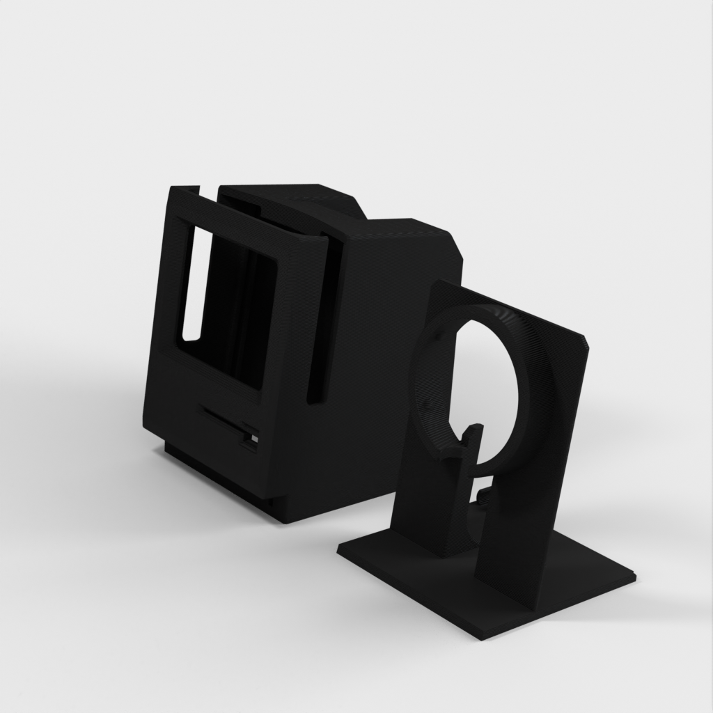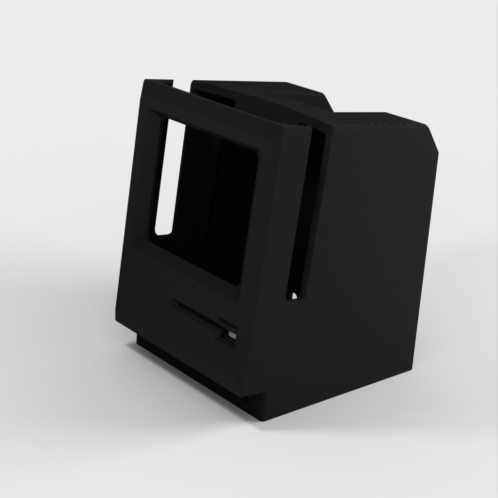 Apple Watch oplaaddock in klassieke Mac-stijl. Dit is een tweedelige oplaadstandaard voor de Apple Watch, waarbij deel 1 het draadloze oplaadmechanisme op zijn plaats houdt en deel 2 er bovenop schuift en een plek biedt om je Apple Watch neer te zetten. Aan de zijkanten van het omhulsel zitten sleuven die het horloge stevig bij het bandje houden, terwijl de magnetische oplader het horloge op zijn plaats houdt om op te laden. Het display loopt gelijk met het scherm van de Mac, zodat je het display kunt zien als het horloge in de nachtstand staat.