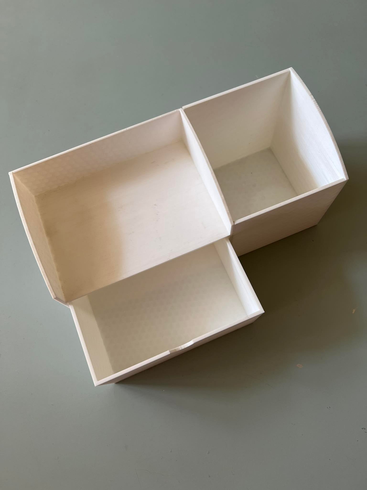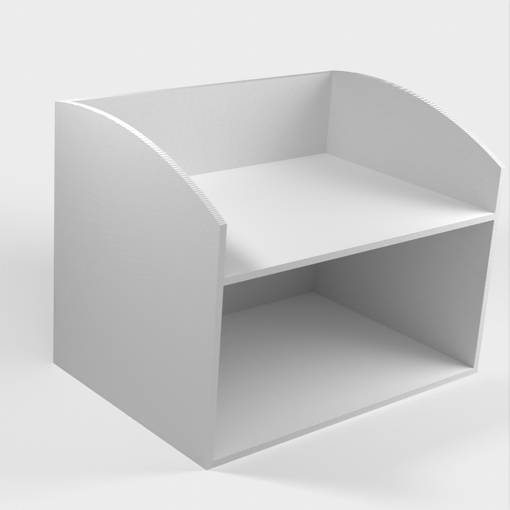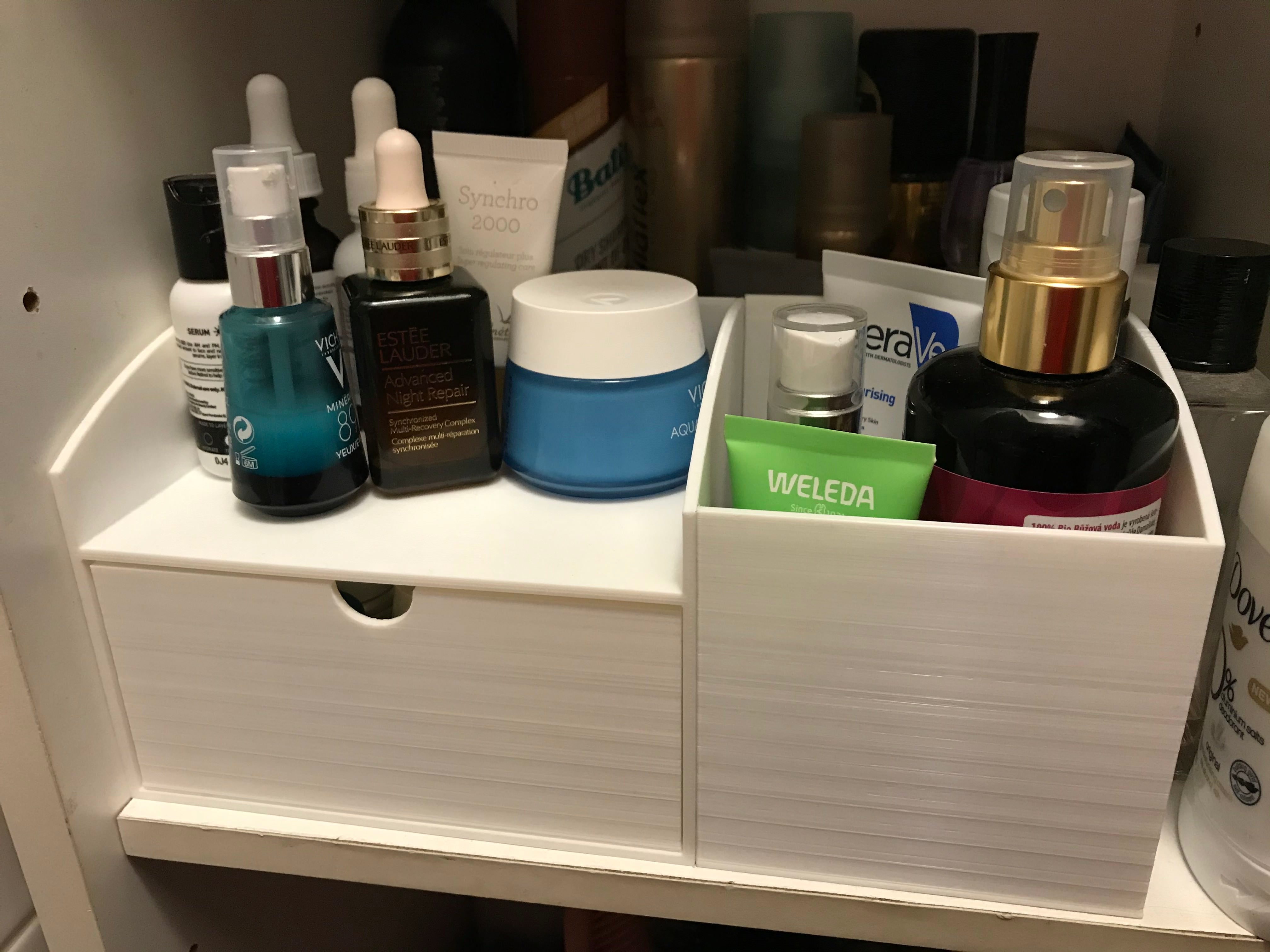 Dit is een organiser voor de badkamer, geprint met PLA. Geprint met 0,2 mm laaghoogte, 0,4 mm spuitmond, 20% infill en er zijn geen steunen nodig. Elk deel is apart geprint en daarna aan elkaar gelijmd. Geprint op Ender 3v2.