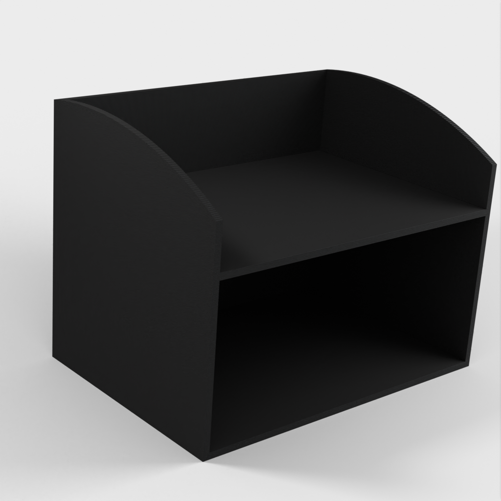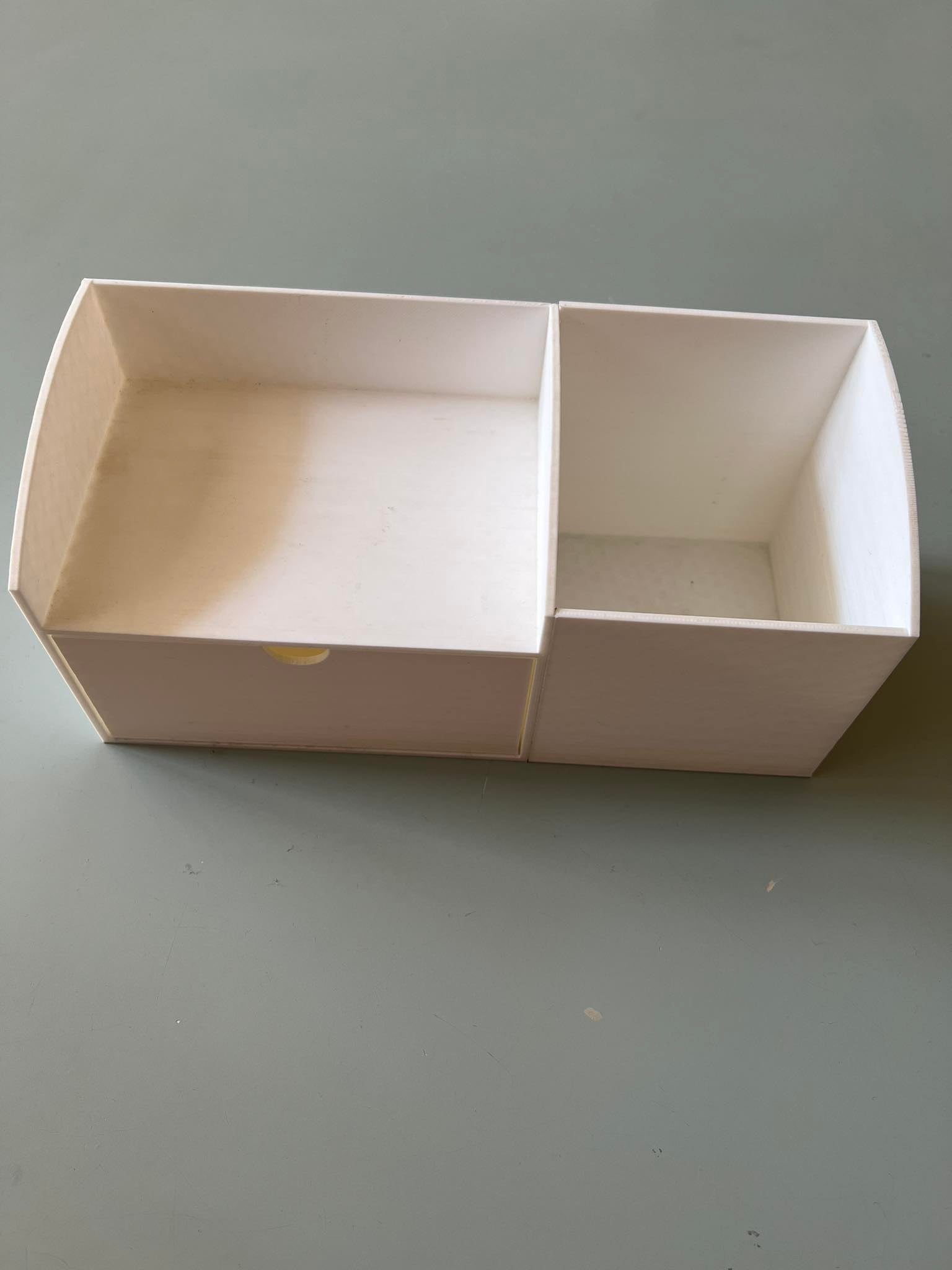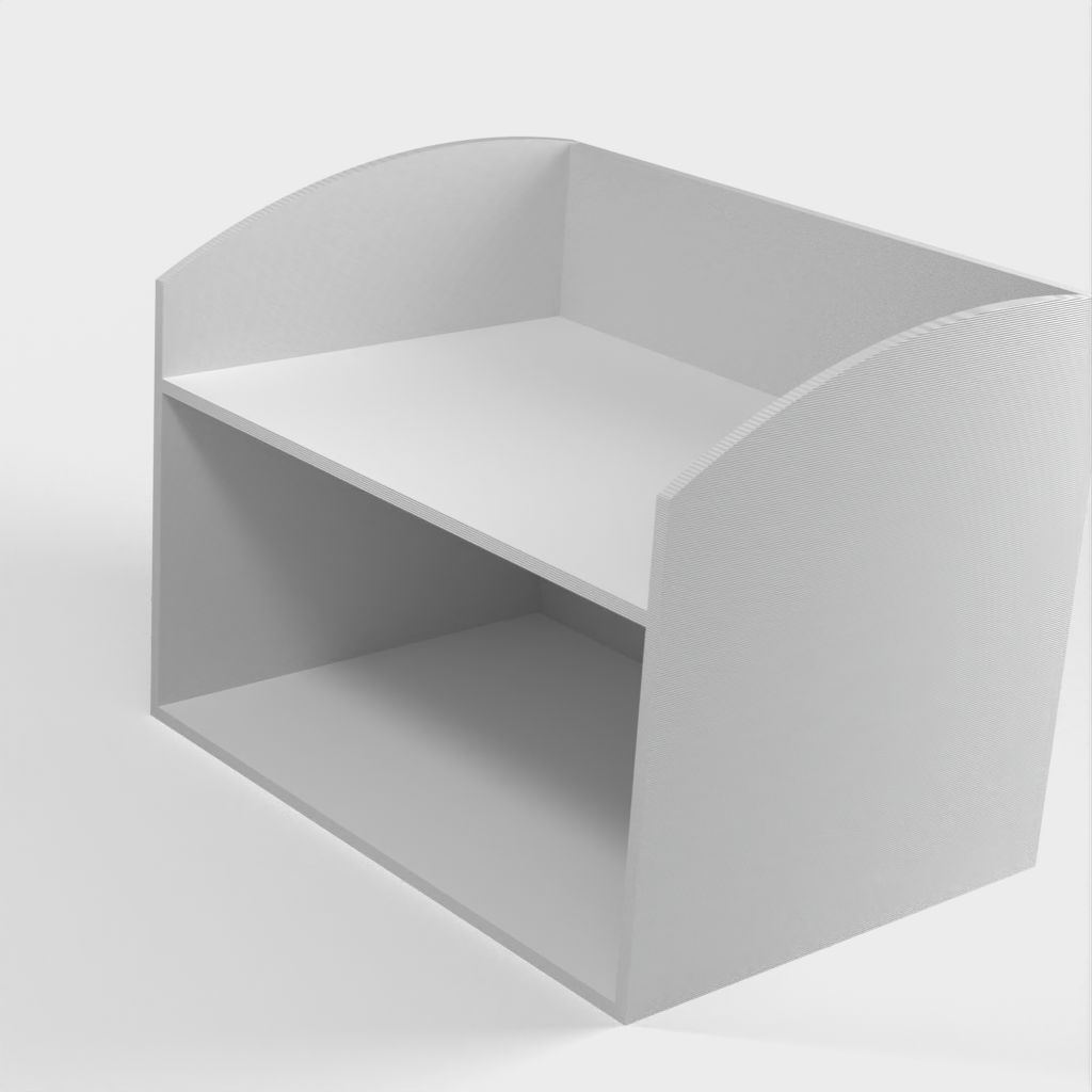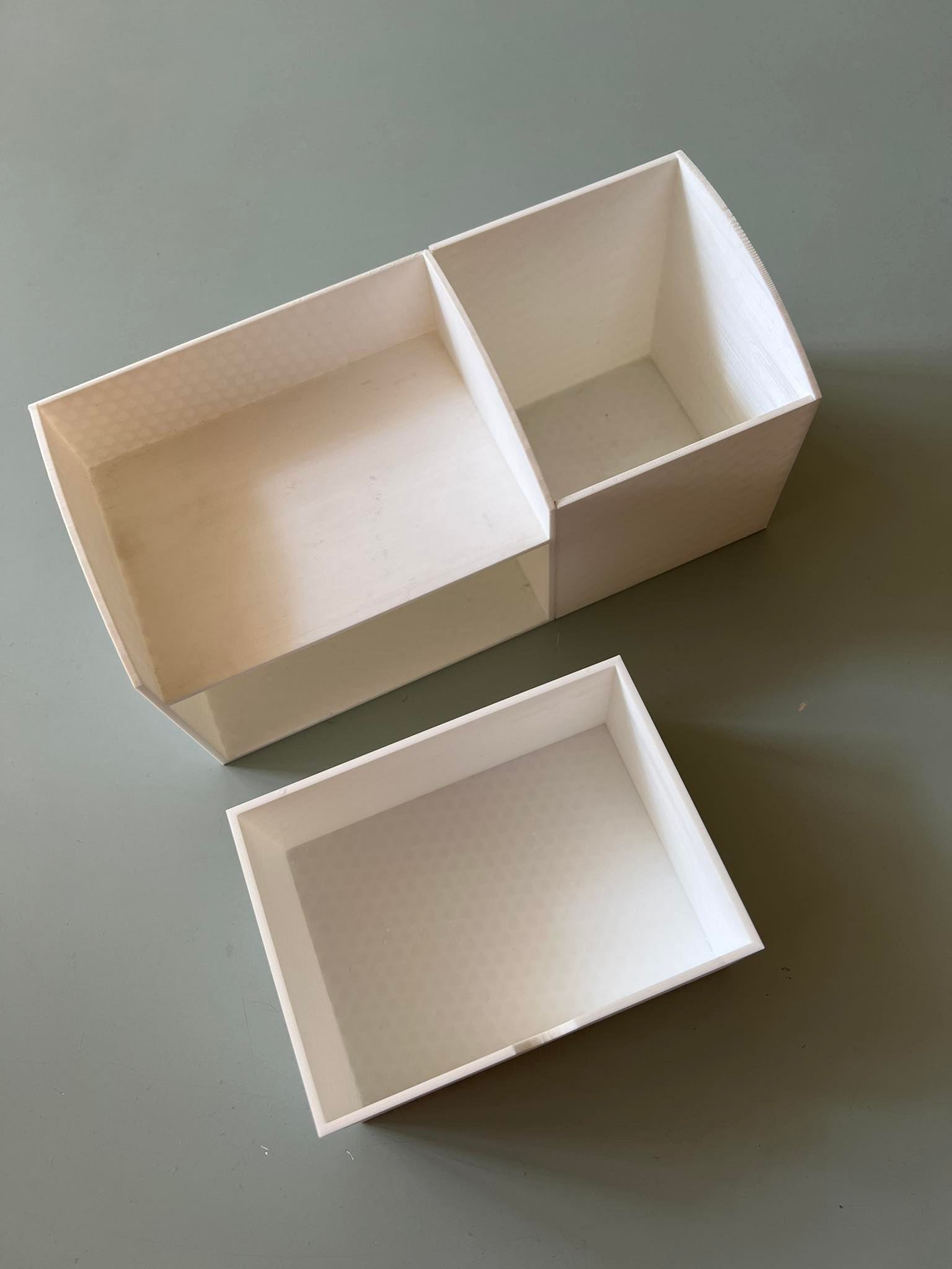 Dit is een organiser voor de badkamer, geprint met PLA. Geprint met 0,2 mm laaghoogte, 0,4 mm spuitmond, 20% infill en er zijn geen steunen nodig. Elk deel is apart geprint en daarna aan elkaar gelijmd. Geprint op Ender 3v2.