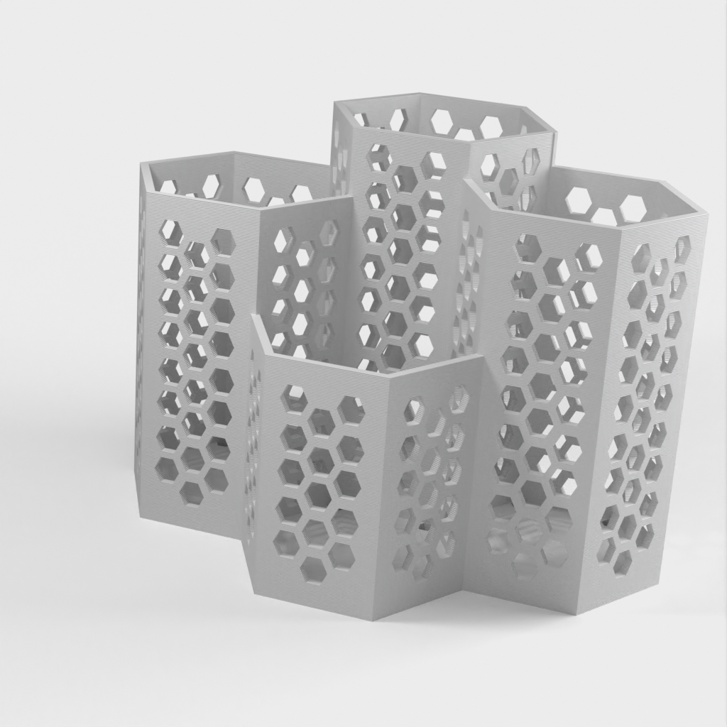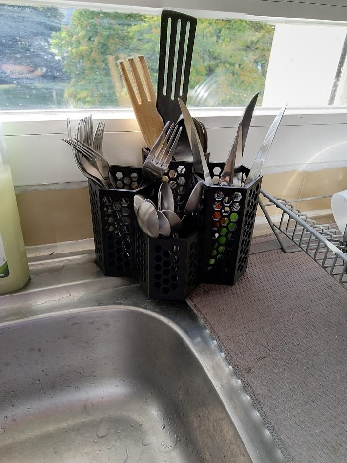 Een praktische bestekbak verdeeld in vier vakken: een voor kleine lepels, een voor vorken, een voor messen en een groter vak voor grotere lepels en ander keukengerei. Kleine gaatjes in de bodem helpen het water af te voeren.