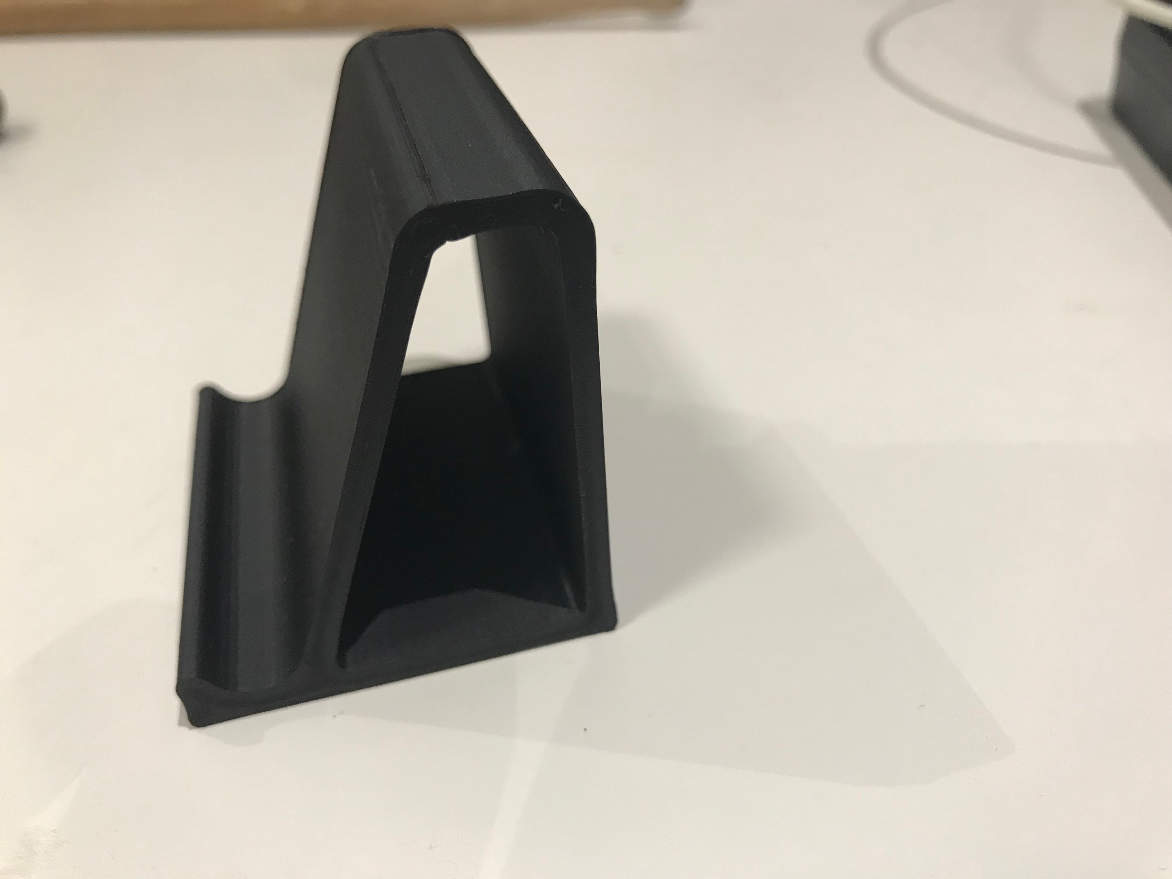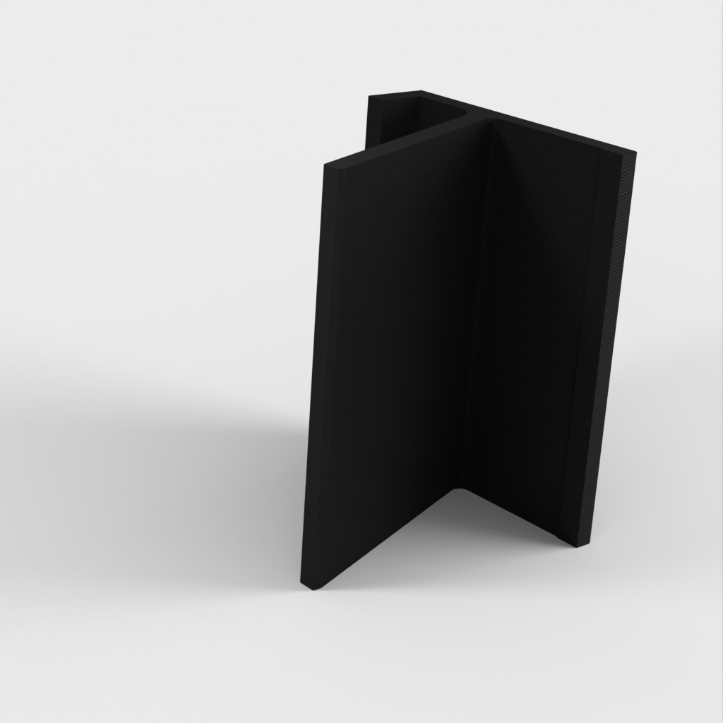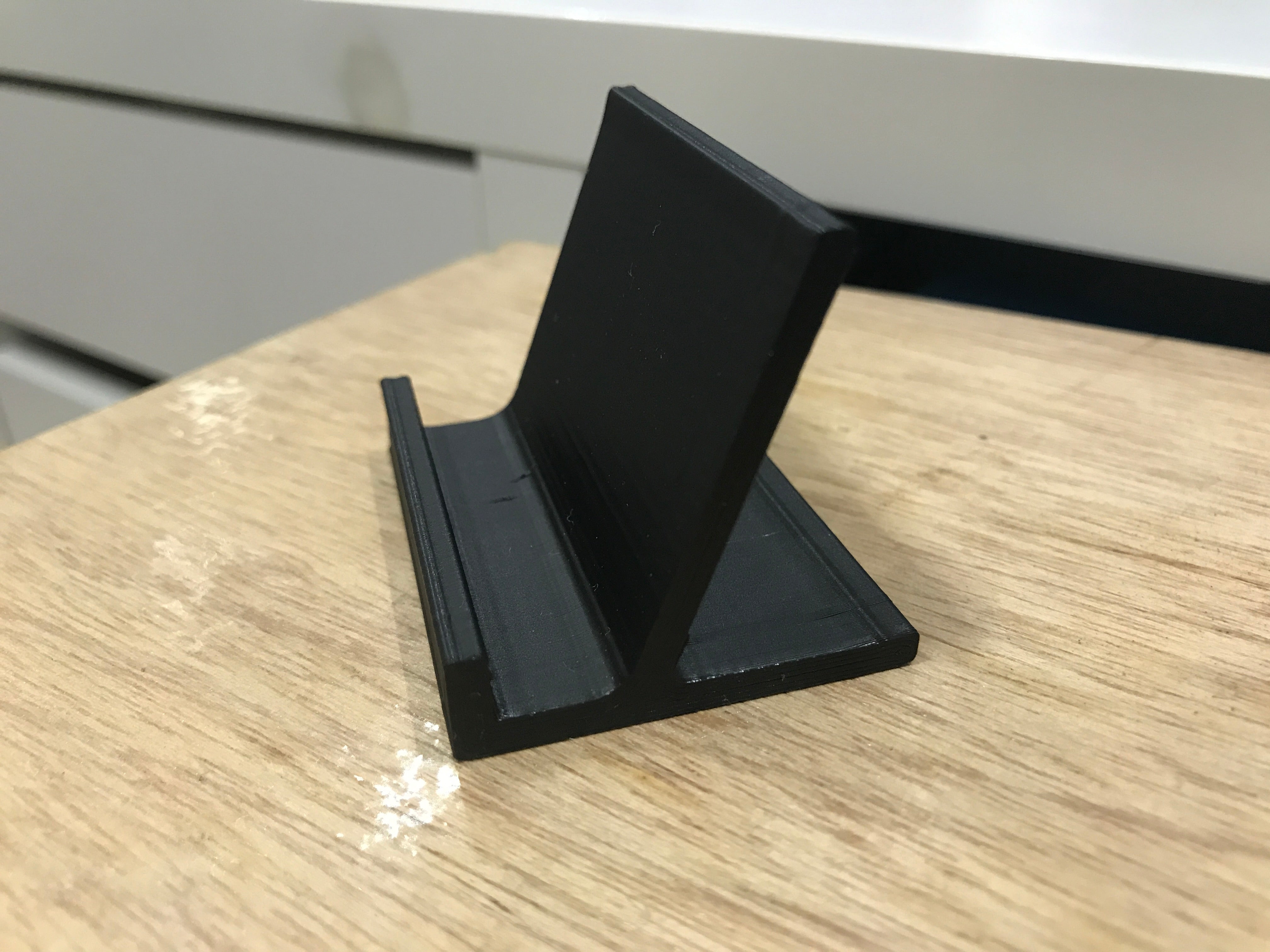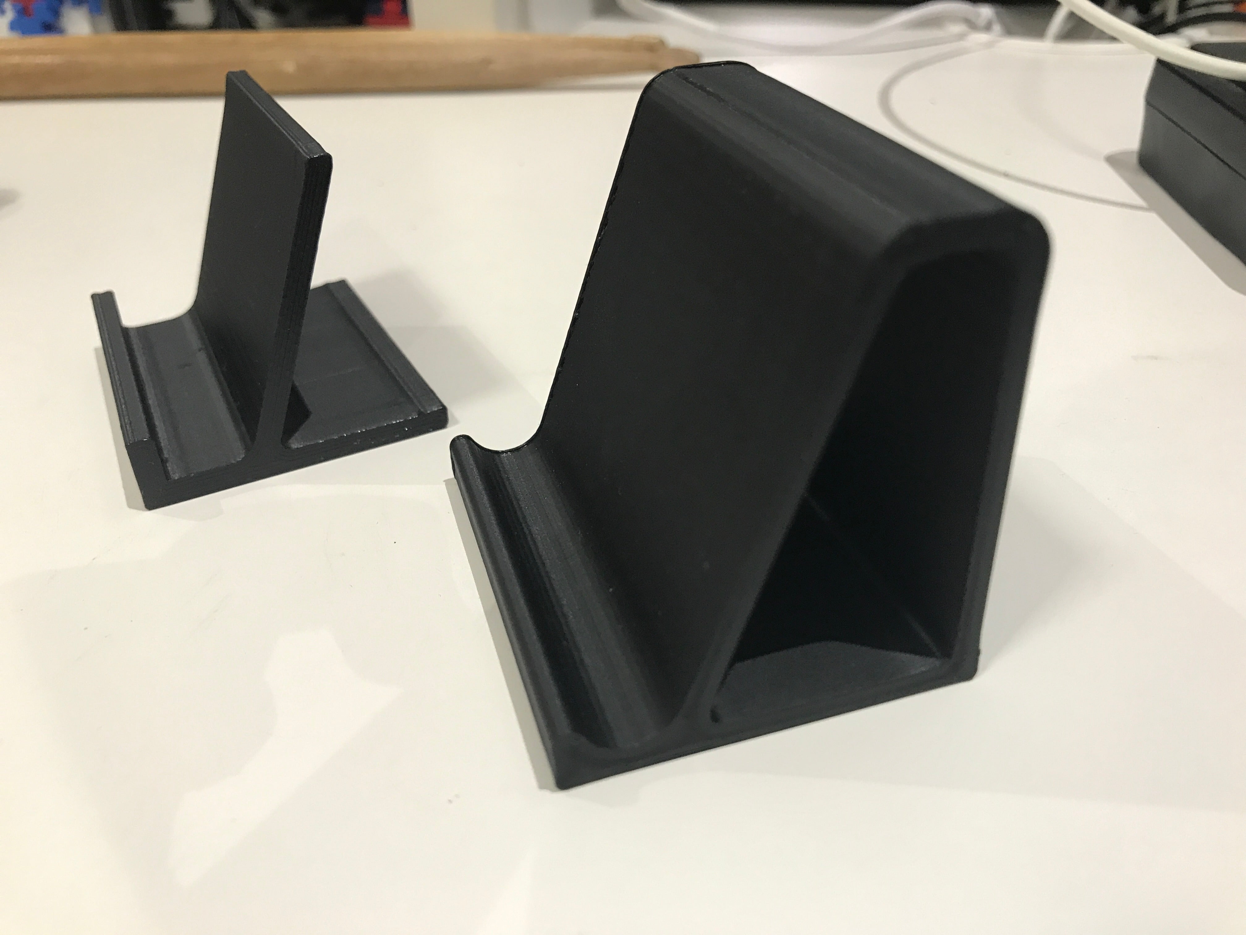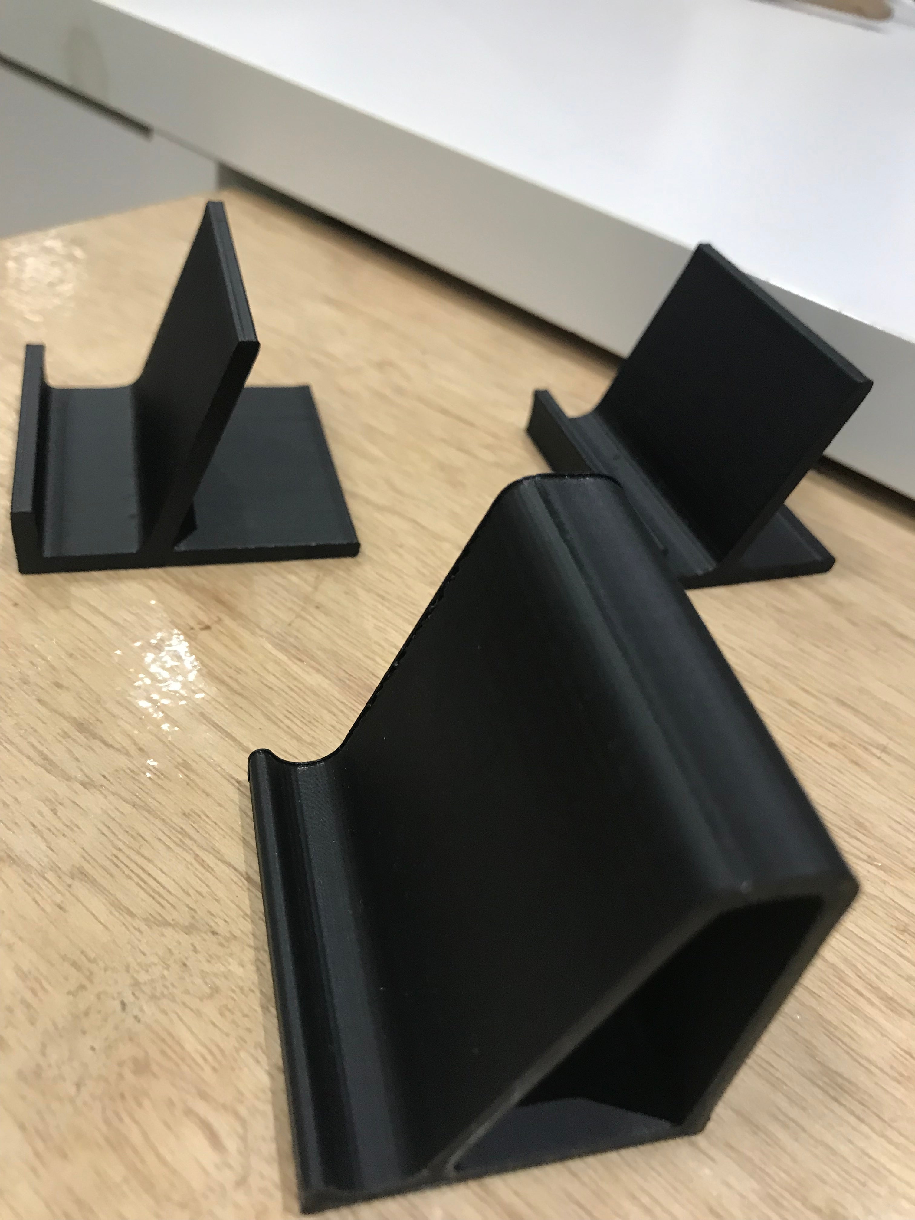 Dit is een eenvoudige telefoonstandaard die op vrijwel alle telefoons en tablets past. Deze standaard is er in twee verschillende versies, een sterkere versie voor op reis die een ondersteunde achterkant heeft, en een andere versie die filament en tijd bespaart, maar niet zo goed is om mee te nemen omdat hij kan breken.