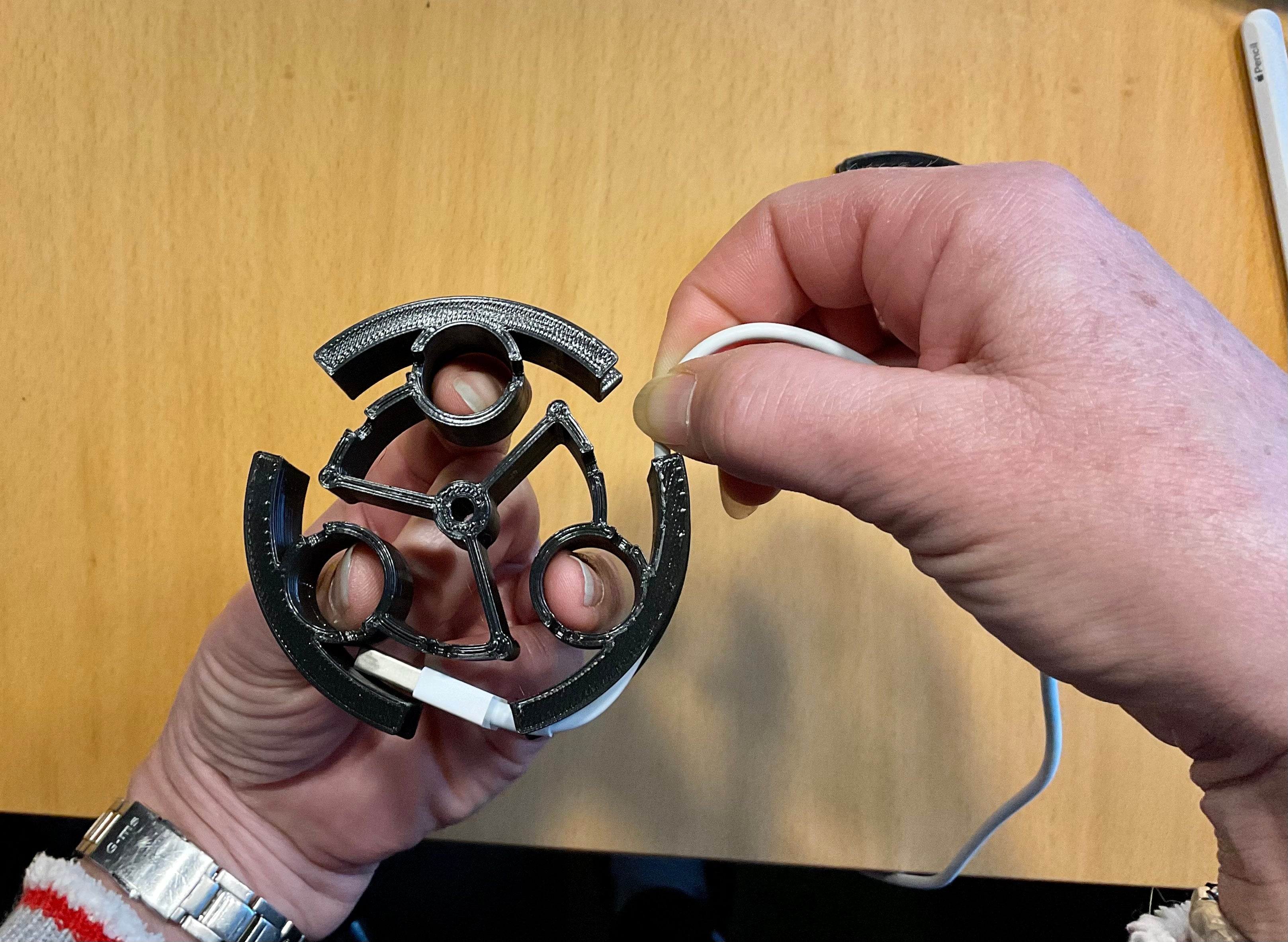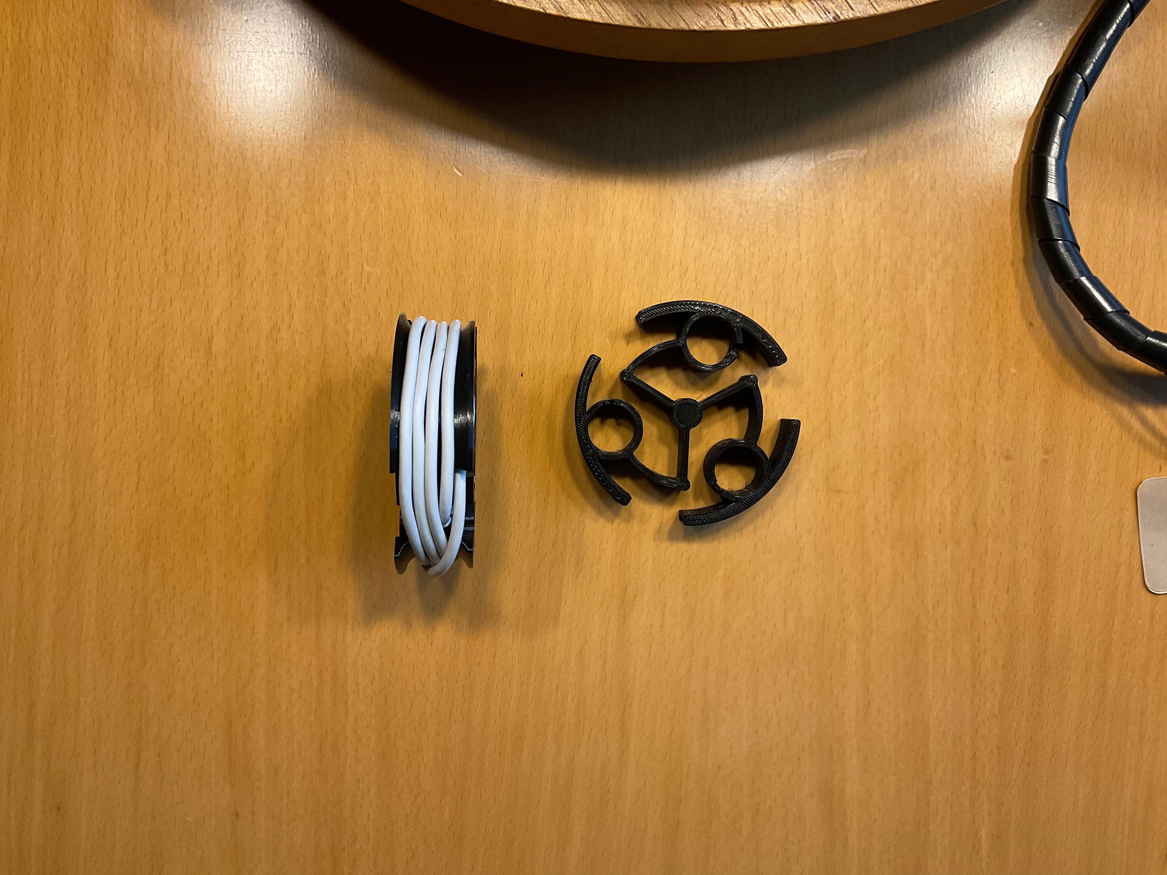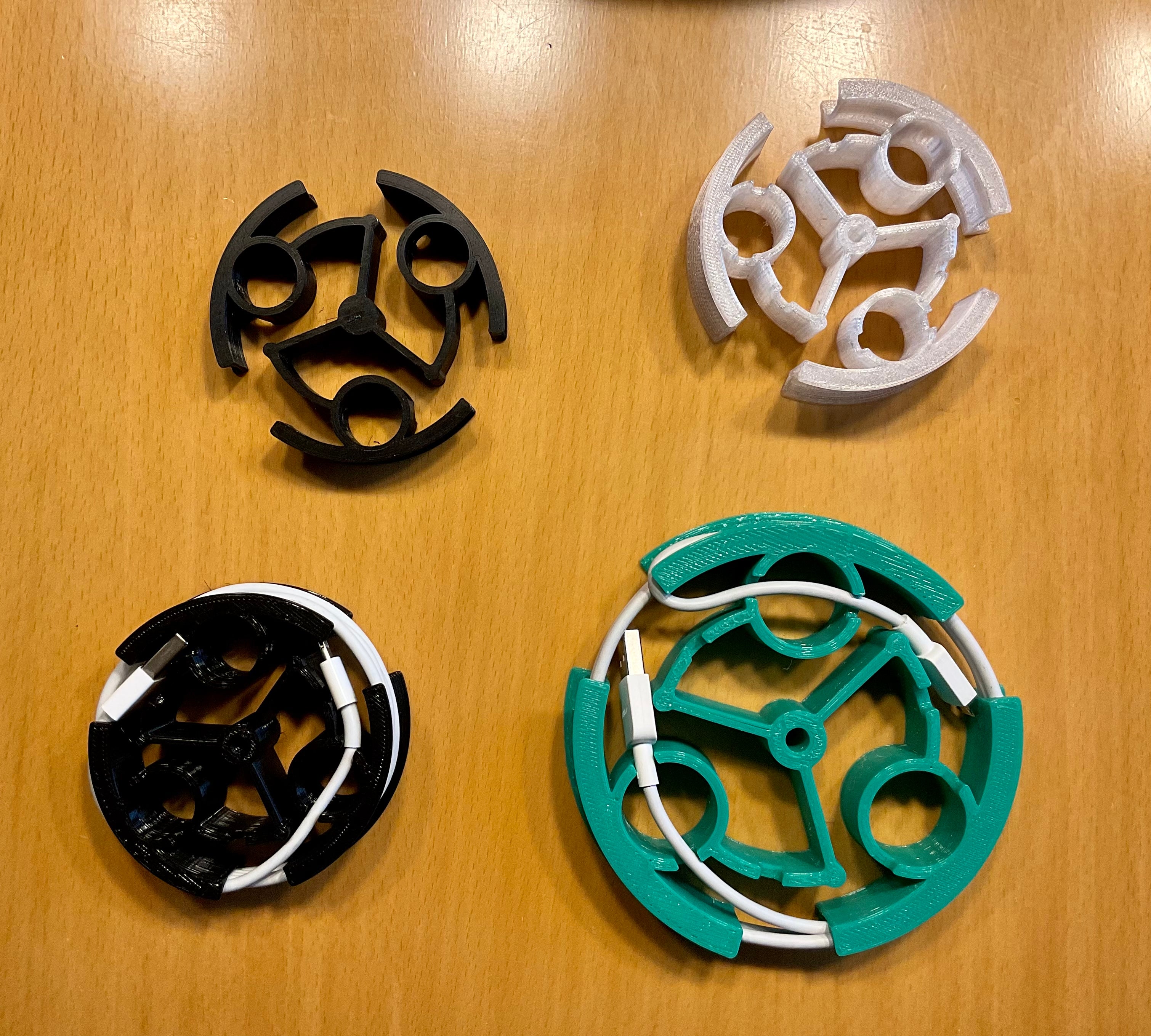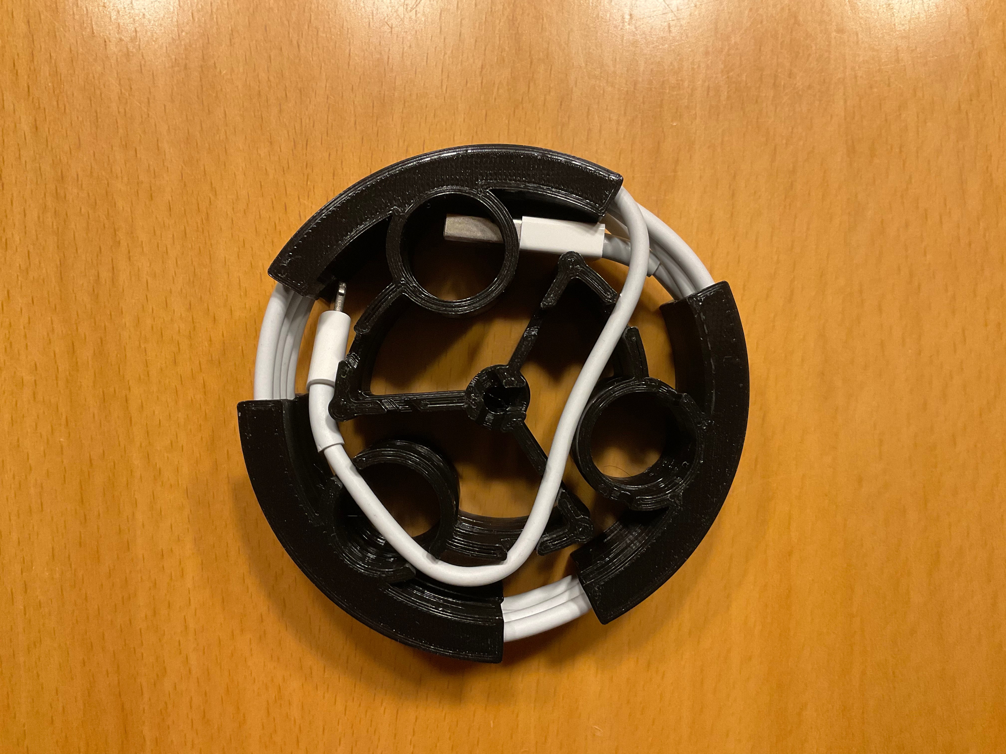 Dit is een flexibele kabelorganiser voor telefoon- of tabletkabels. Het is zo ontworpen dat het gemakkelijk als één geheel kan worden geprint zonder dat er ondersteuning nodig is en het kan gemakkelijk worden geschaald op basis van de lengte en dikte van de kabel.