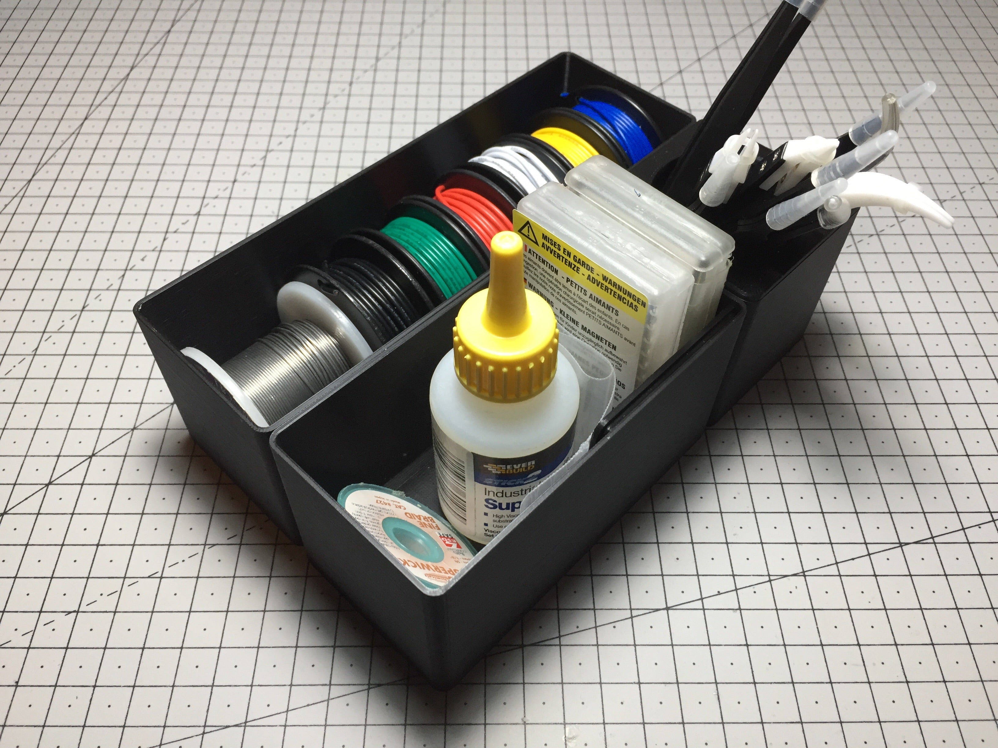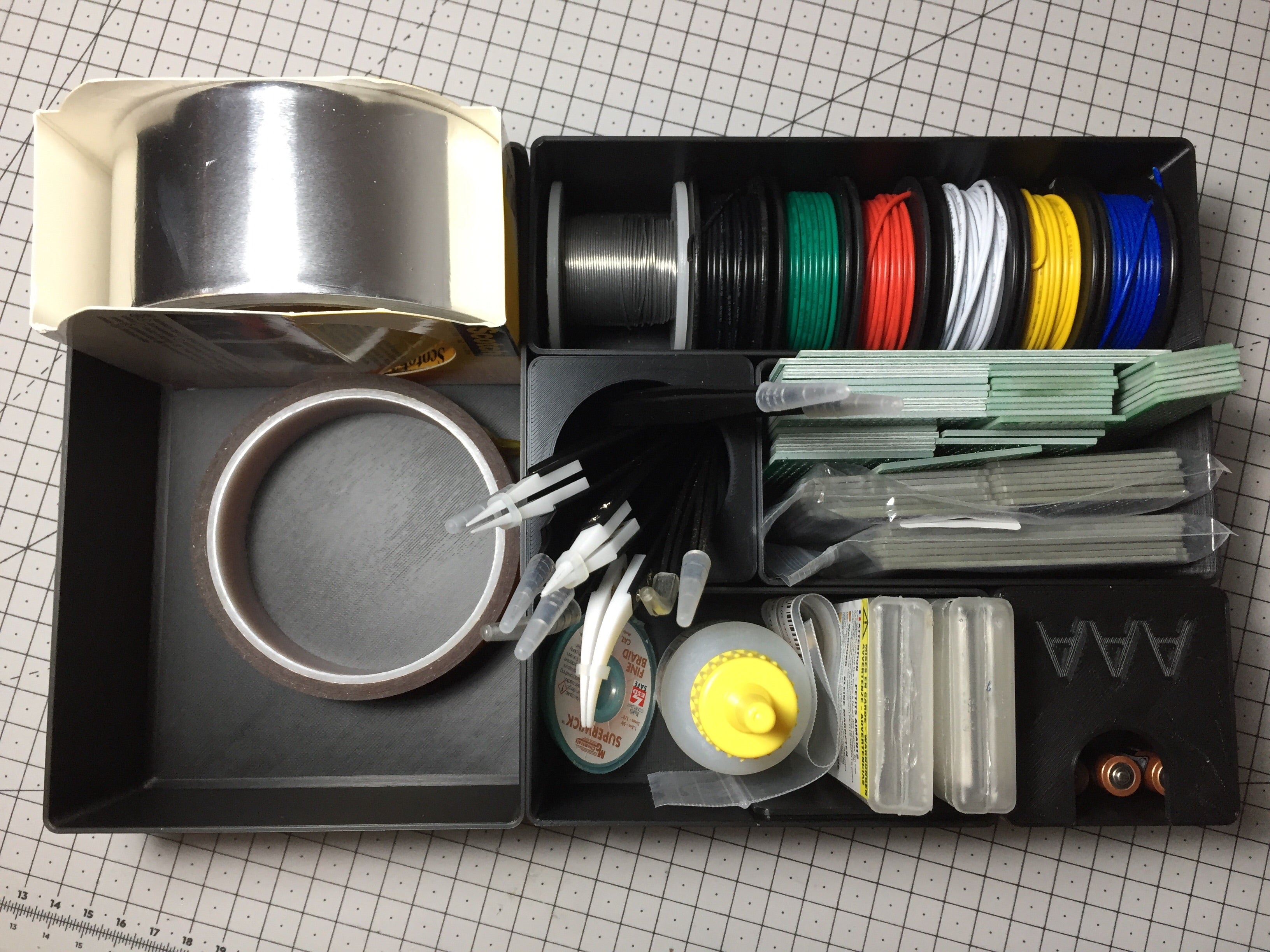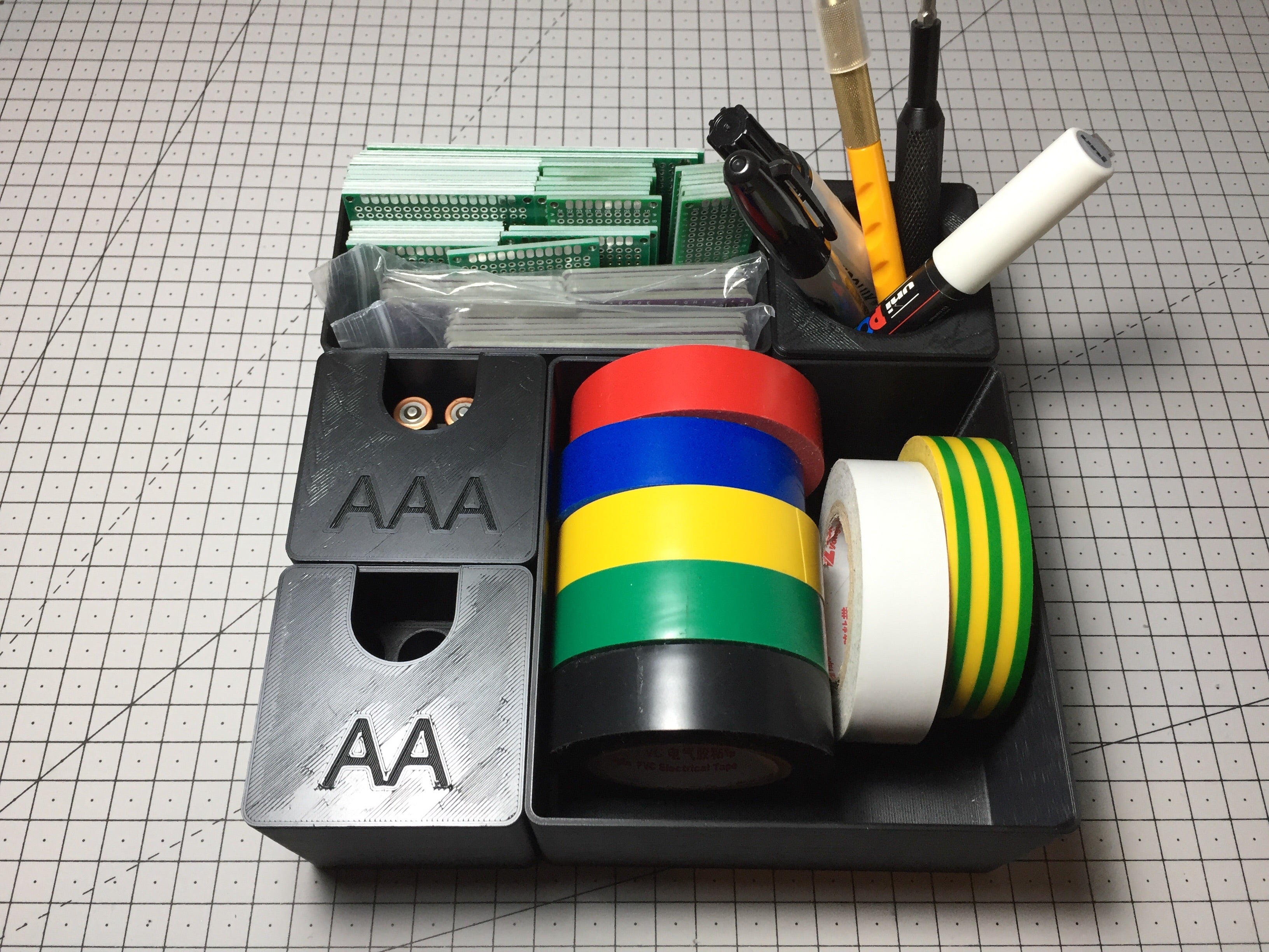 De interne afmetingen van het systeem komen overeen met de afmetingen van de Alex lade, waardoor het makkelijk te implementeren en te gebruiken is. Dit project omvat modules in verschillende maten, variërend van 1x1, 2x1, 2x2 tot 4x2. Verder zijn er ook twee aangepaste 1x1 modules voor AA- en AAA-batterijen en twee soorten deksels - een die de module gewoon afsluit en een andere die ze in een potloodhouder verandert.