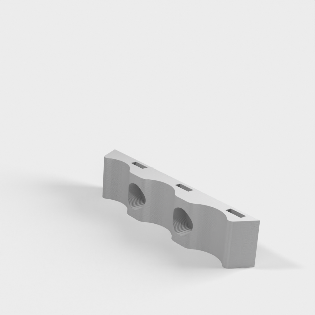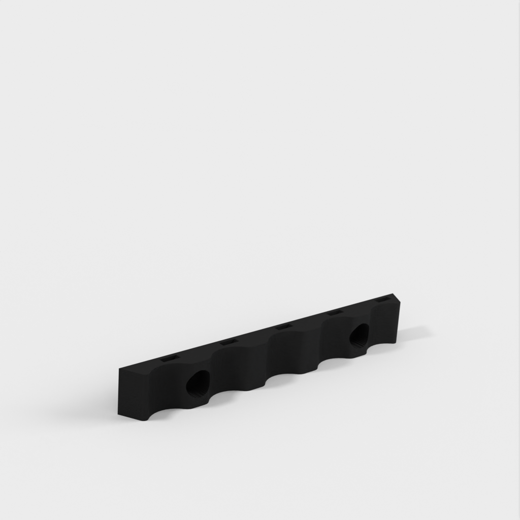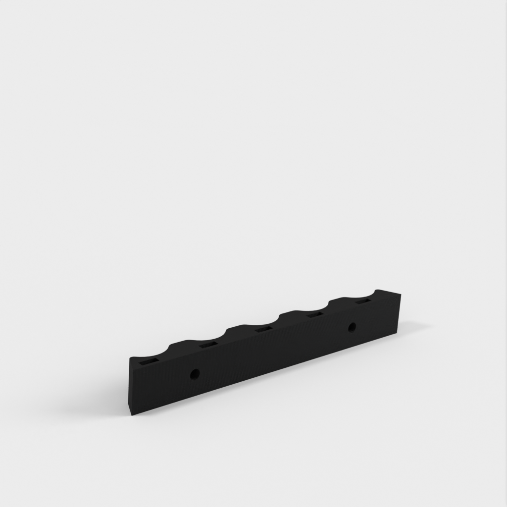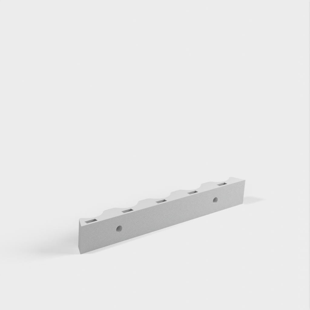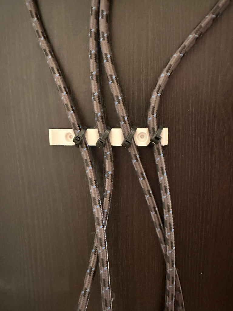 Deze kabelopberger is ontworpen om 2, 3 of 5 kabels op hun plaats te houden. Hij kan op elk oppervlak worden bevestigd met schroeven of plakstrips. Gebruik kabelbinders zoals op de afbeelding om je kabels in sleuven te ordenen.