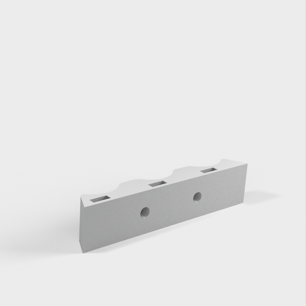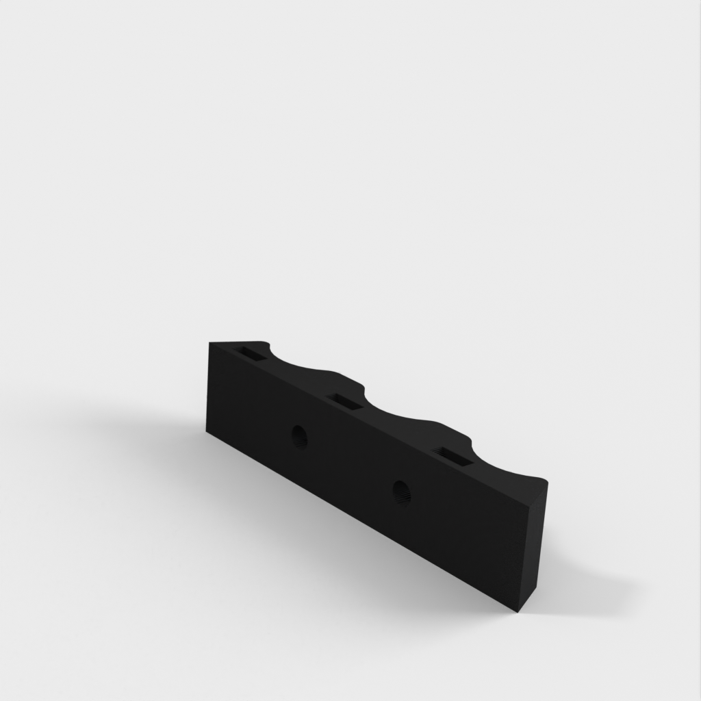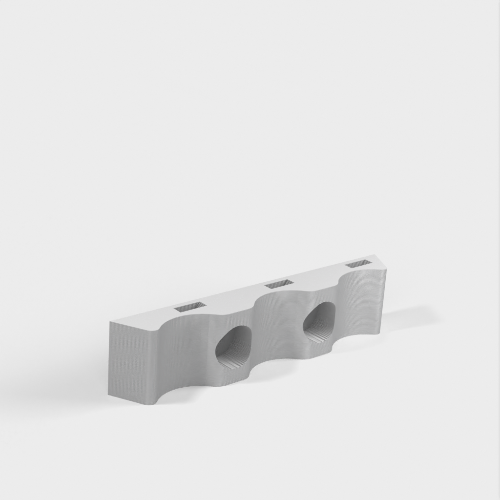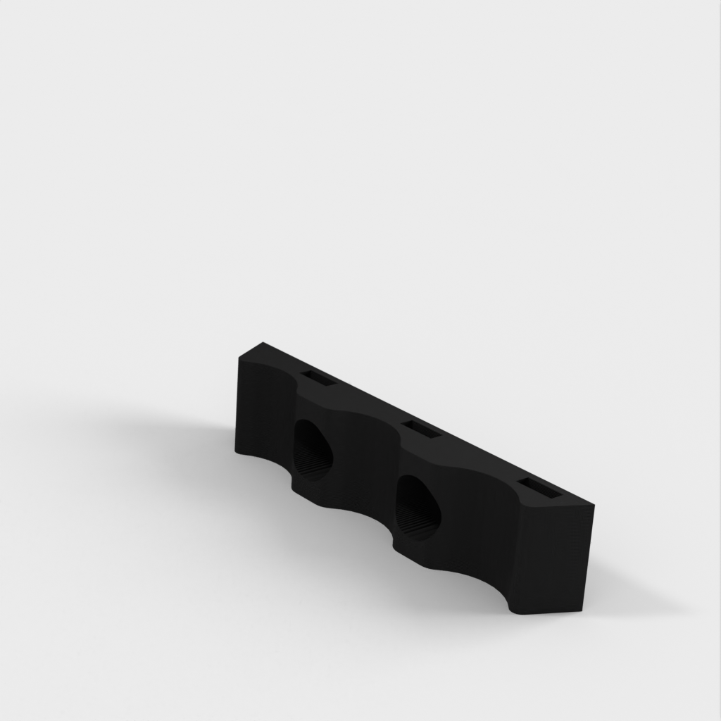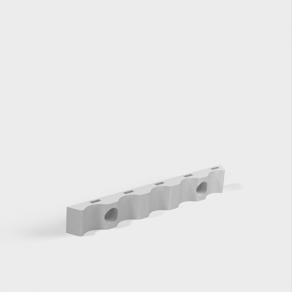 Deze kabelopberger is ontworpen om 2, 3 of 5 kabels op hun plaats te houden. Hij kan op elk oppervlak worden bevestigd met schroeven of plakstrips. Gebruik kabelbinders zoals op de afbeelding om je kabels in sleuven te ordenen.