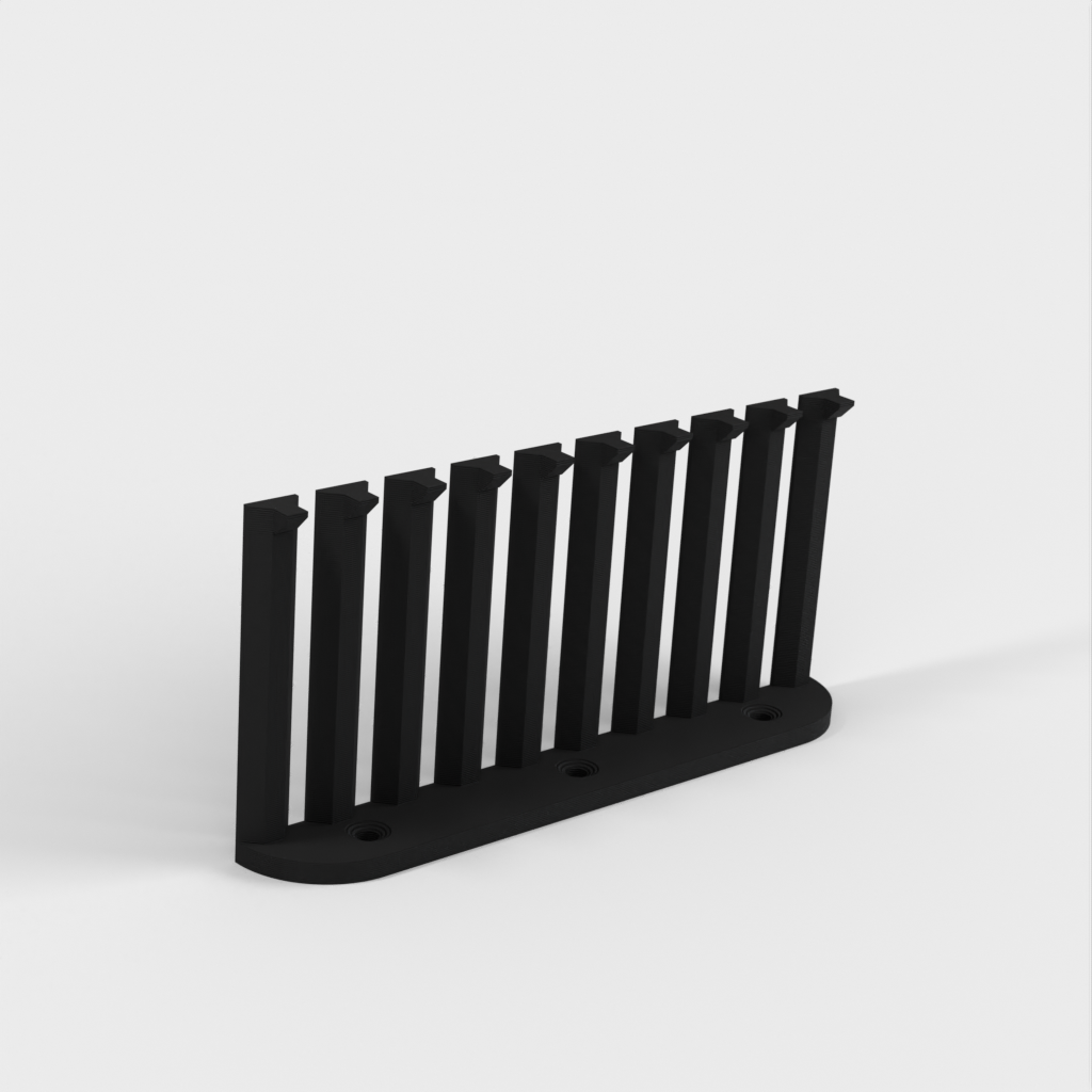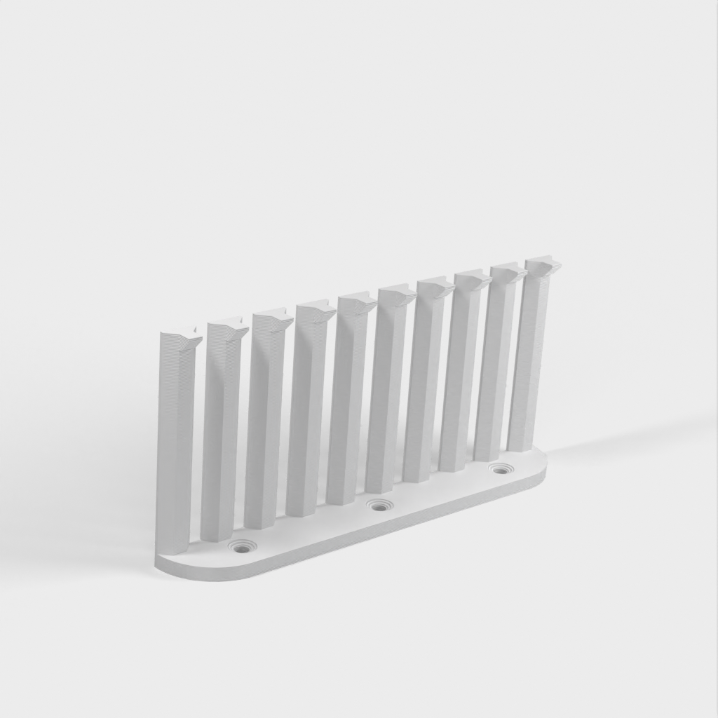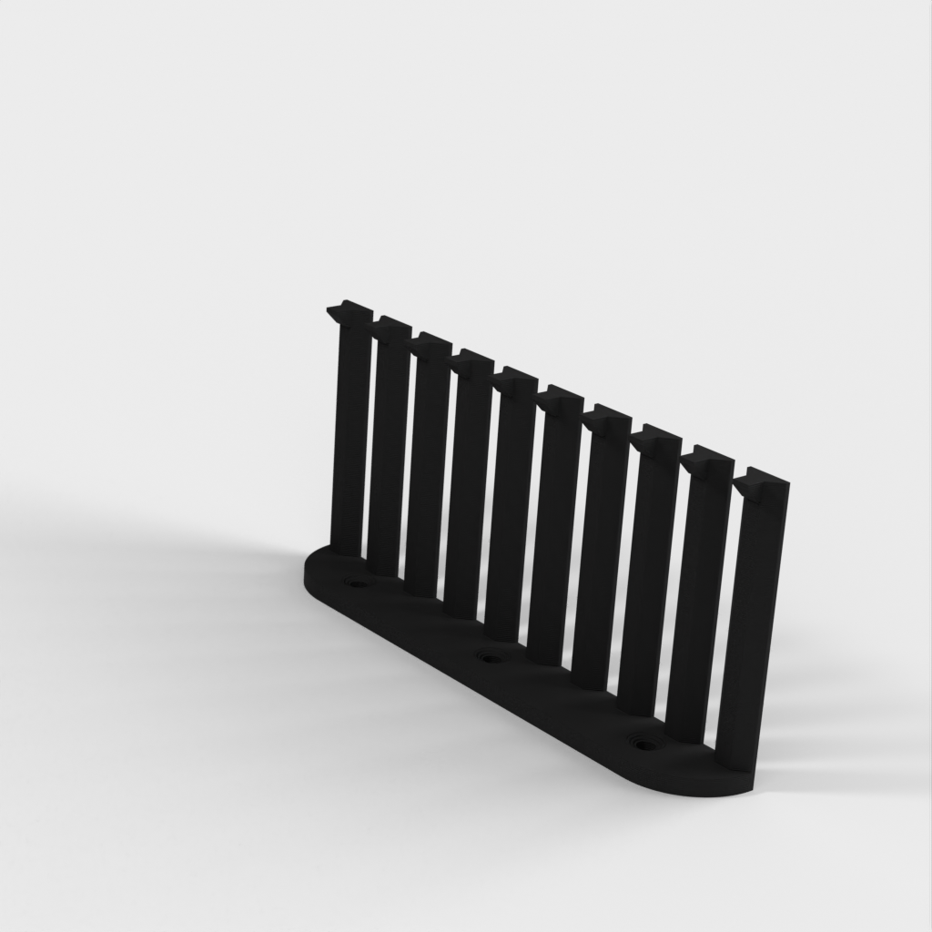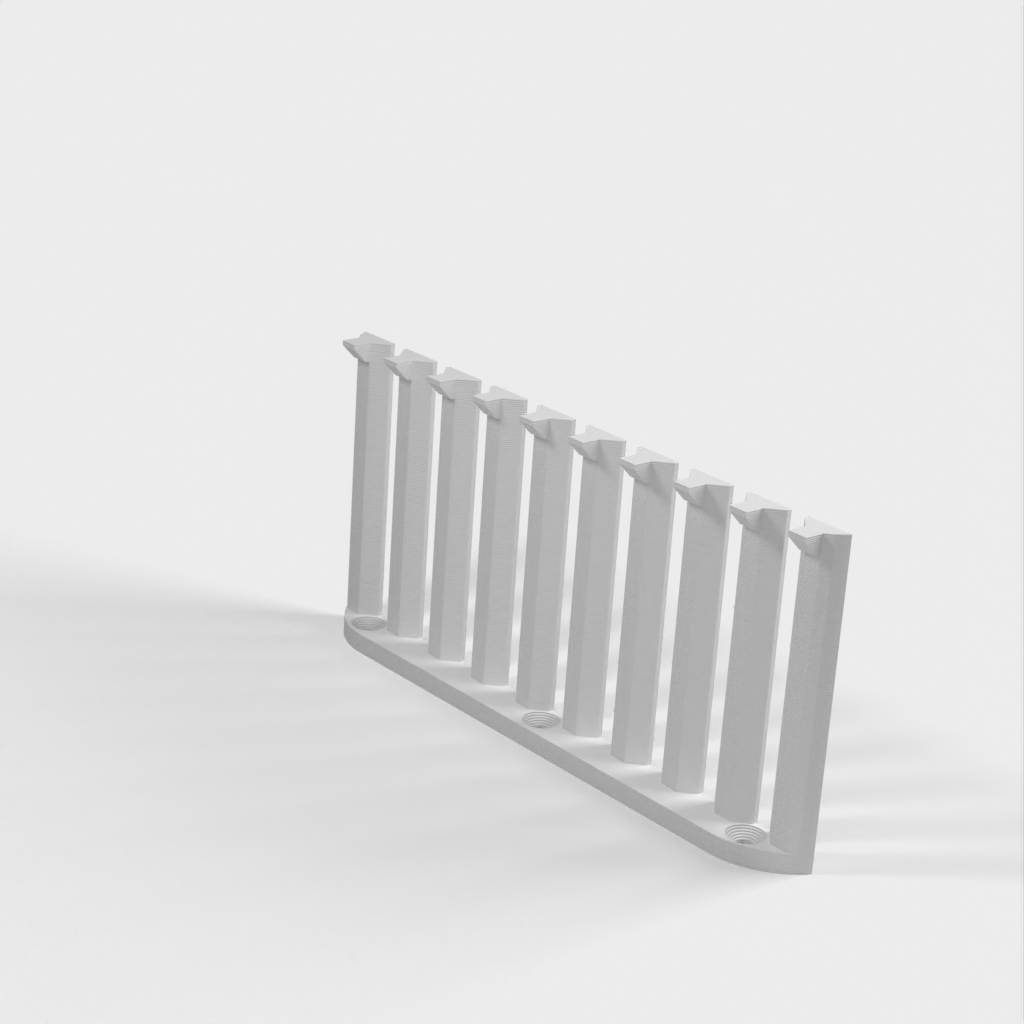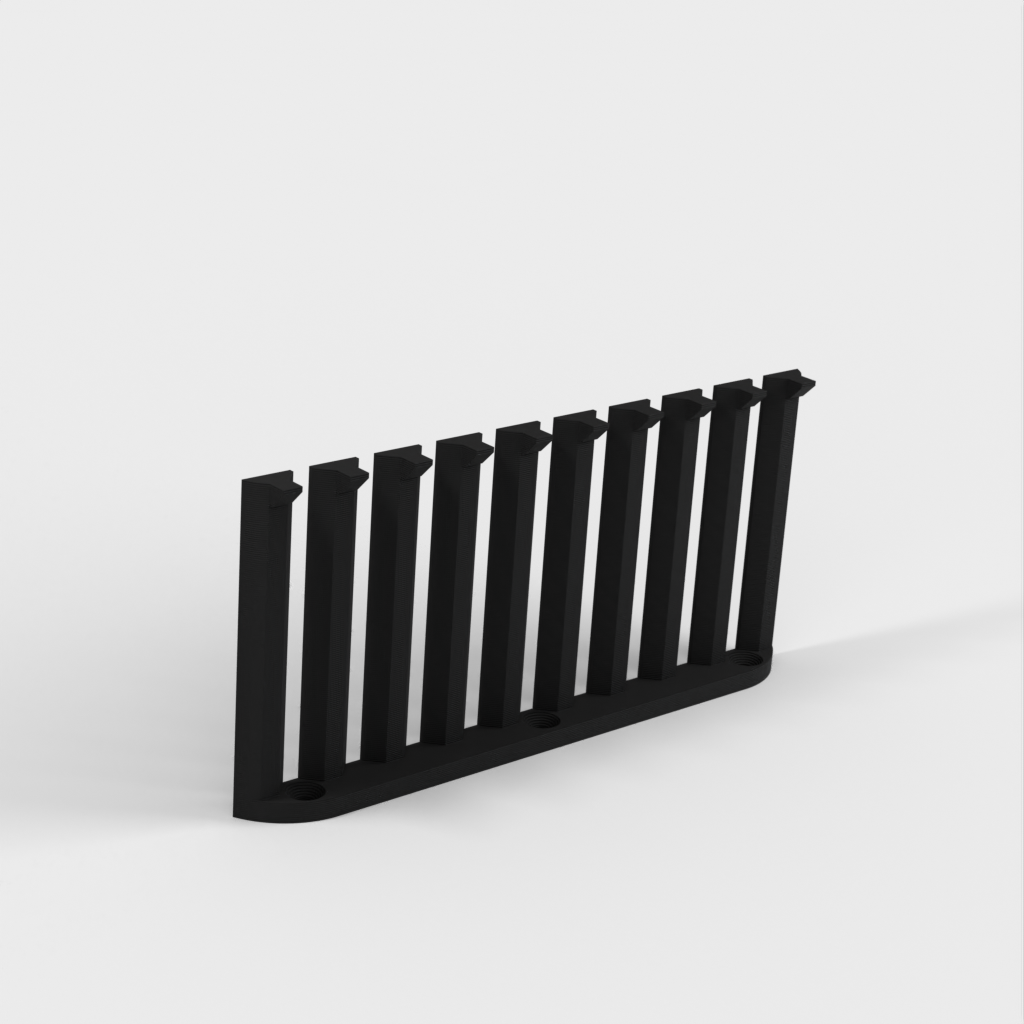 Dit is een parametrische kabelorganiser, ontworpen om je kabels efficiënt te organiseren. Met 10 armen biedt het ruimte voor 9 kabels met 4 mm afstand tussen elke kabel. Het huidige ontwerp is verbeterd met een lagere montagehoogte aan de achterkant vergeleken met versie 1. De schroeven zijn ontworpen om eenvoudig te installeren met verzonken M4 schroeven. Het is perfect voor elk laboratorium of werkplek waar kabels georganiseerd moeten worden.