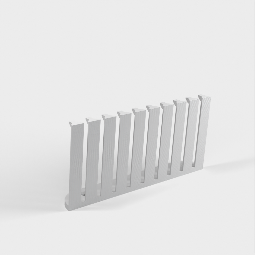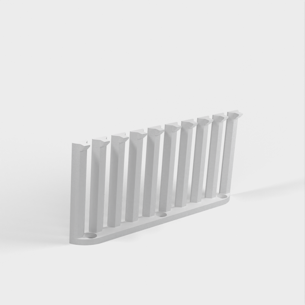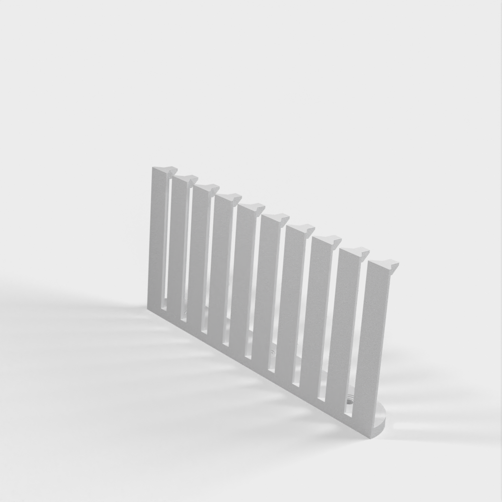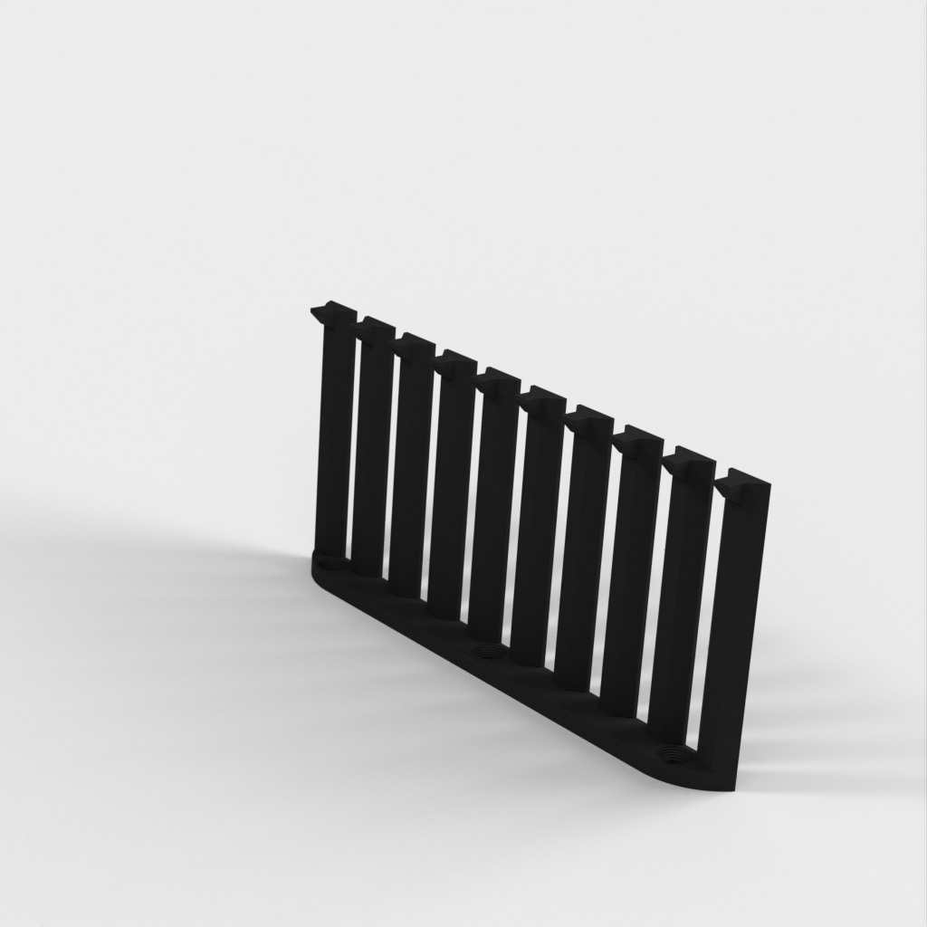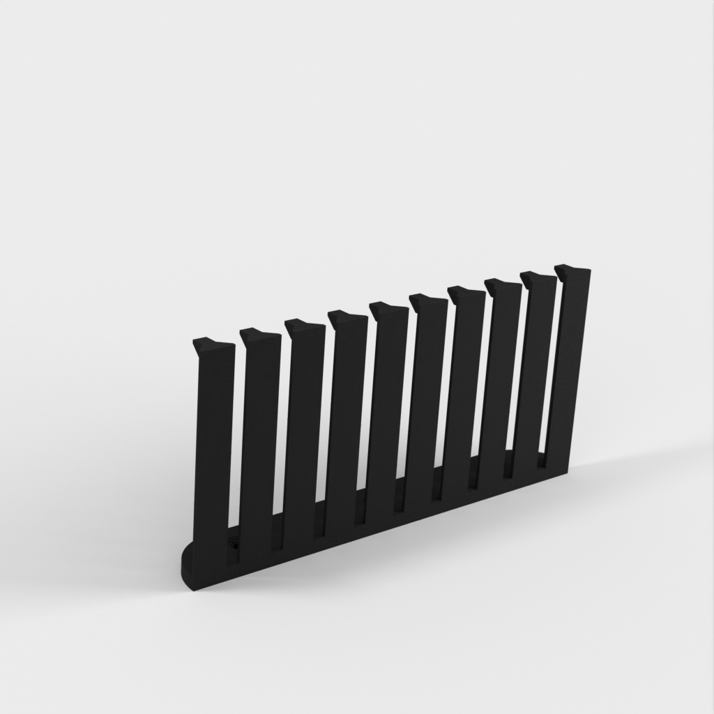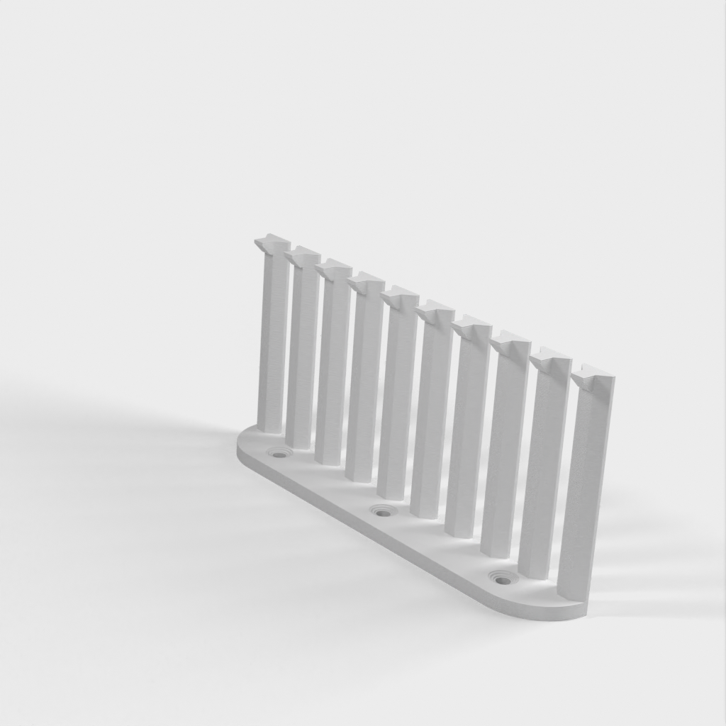 Dit is een parametrische kabelorganiser, ontworpen om je kabels efficiënt te organiseren. Met 10 armen biedt het ruimte voor 9 kabels met 4 mm afstand tussen elke kabel. Het huidige ontwerp is verbeterd met een lagere montagehoogte aan de achterkant vergeleken met versie 1. De schroeven zijn ontworpen om eenvoudig te installeren met verzonken M4 schroeven. Het is perfect voor elk laboratorium of werkplek waar kabels georganiseerd moeten worden.