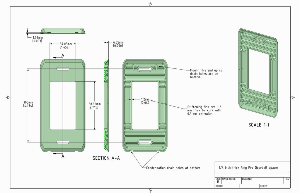 Eenvoudige wandplaat voor Ring Doorbell Pro, die helpt om meer ruimte achter de deurbel te creëren. Deze wandplaat wordt geleverd met een afstandsstuk van 1/4 inch (6,35 mm) voor extra diepte. Het afstandsstuk is vooral handig als er onvoldoende ruimte is voor alle benodigde apparatuur achter uw Ring Doorbell Pro. De dikte van het afstandsstuk is 1/4 inch en de schroefgatafstand is aangepast aan de Ring Pro met een afstand van 105 mm.