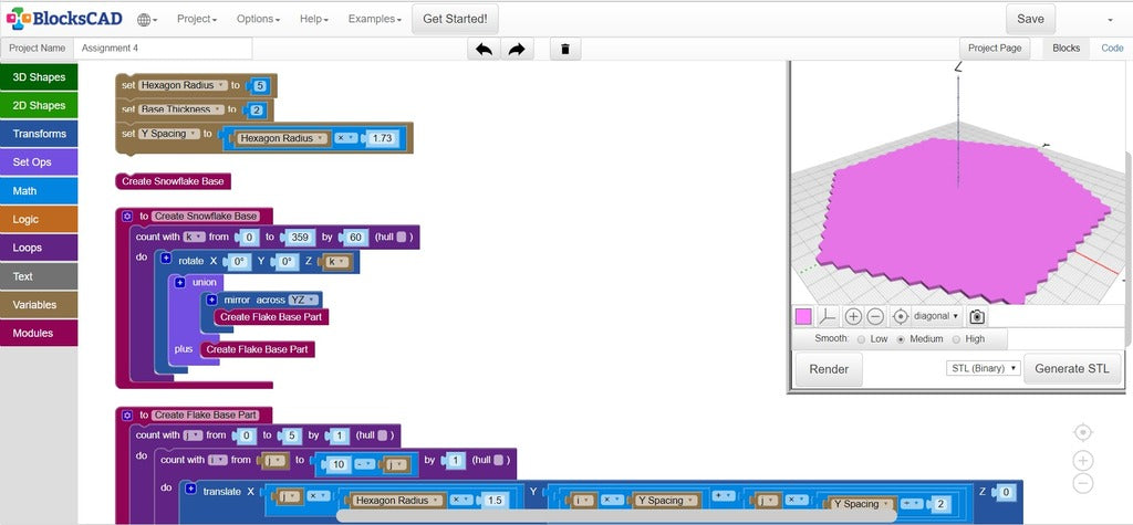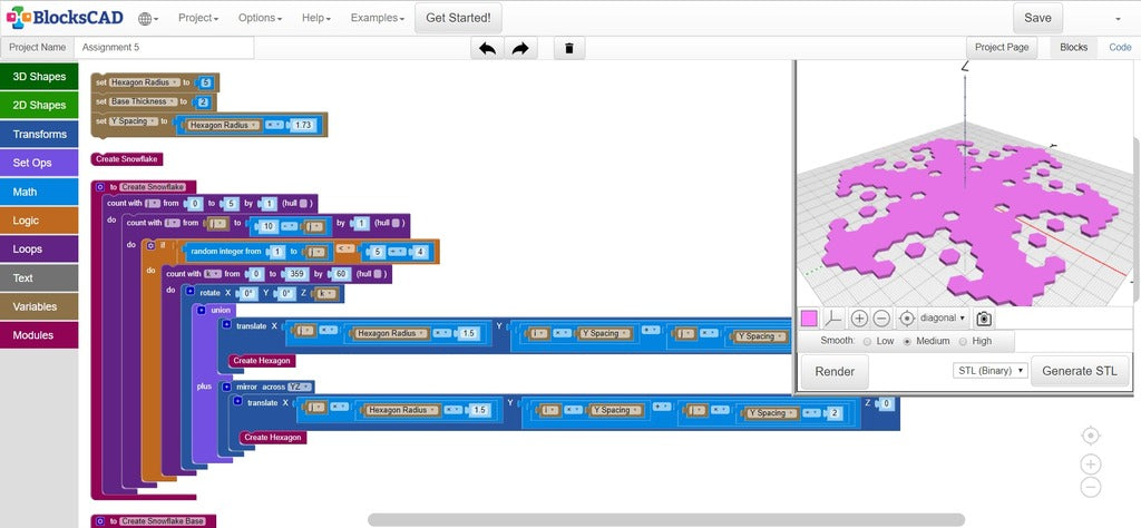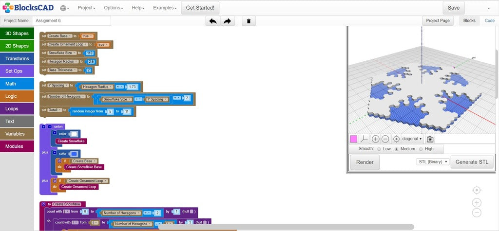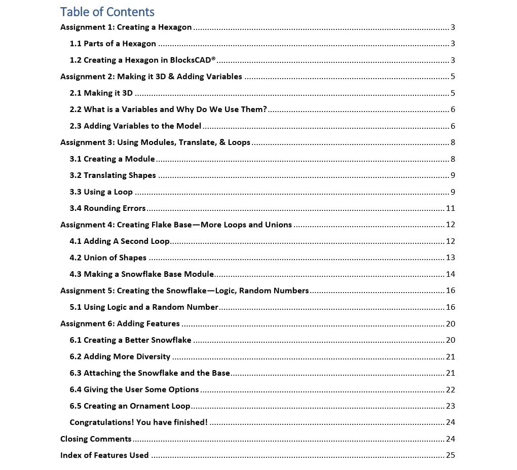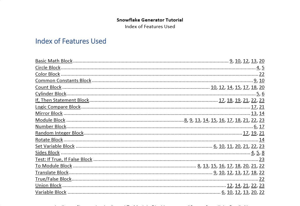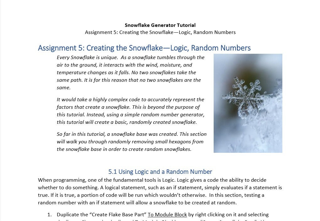 Deze tutorial over sneeuwvlokgeneratoren is gemaakt als onderdeel van de BlocksCAD® Snowflake Challenge. De tutorial is ontworpen om de interesse van leerlingen in STEM (wetenschap, technologie, techniek en wiskunde) te vergroten. Het bestaat uit een stap-voor-stap handleiding om een willekeurige sneeuwvlokgenerator te maken. Met zeven XLF-bestanden, waaronder het voltooide bestand 'Snowflake Generator.xlm', verschillende afbeeldingen en vier STL-bestanden, kunnen leerlingen zien hoe hun werk eruit zal zien als 3D-geprinte sneeuwvlokken.
