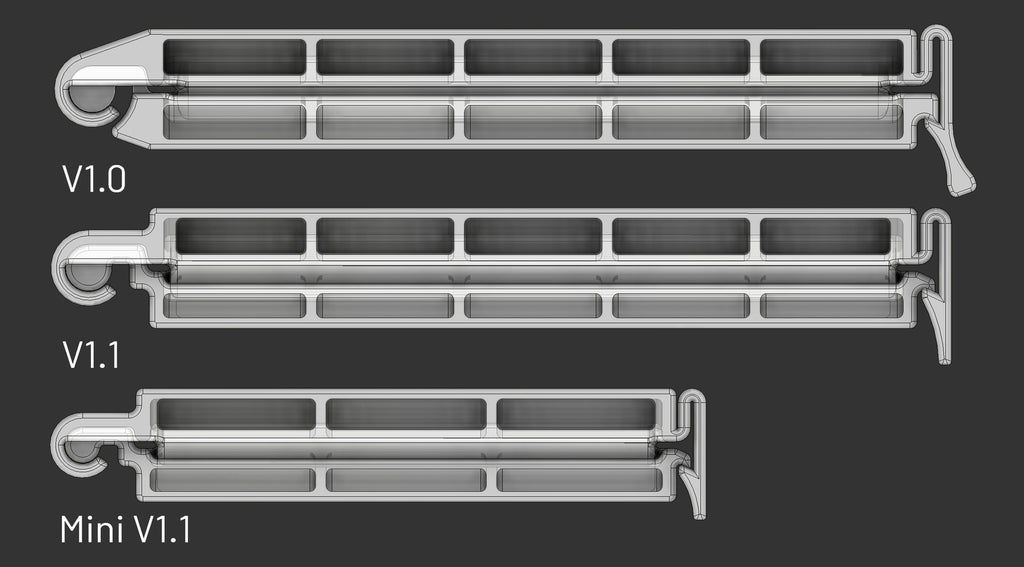 In 2021 werd een miniversie toegevoegd, die een 68 mm breed clipgebied heeft, ongeveer 50% minder materiaal gebruikt dan V1.1 en strakker clipt (0,25 mm holte vs. 0,5 mm) om kleine en dunne zakjes effectiever te sealen.