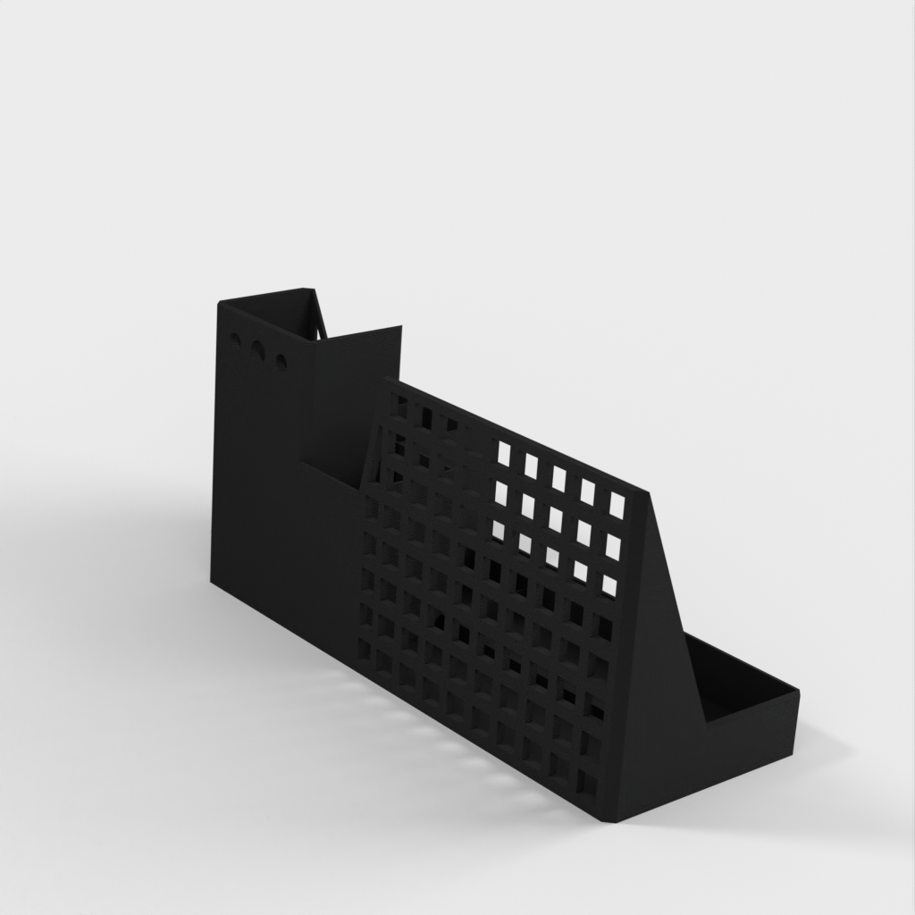 Tabletstandaard en bureau-organizer, ontworpen om je werkruimte effectief te organiseren. Het heeft speciaal ontworpen sleuven om je tablet veilig vast te houden en biedt ook extra opbergruimte voor je kantoorbenodigdheden.
