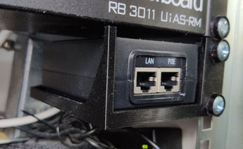 De PoE-wandadapter kan worden gemonteerd met twee M3-schroeven, waarna je de adapter erop kunt bevestigen. Spiegel hem als je hem aan de linkerkant van je rack wilt monteren.