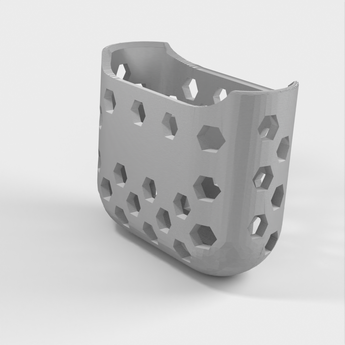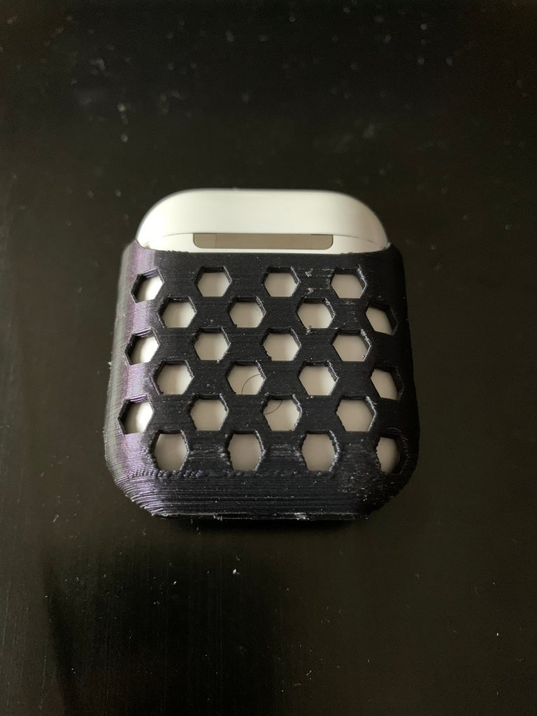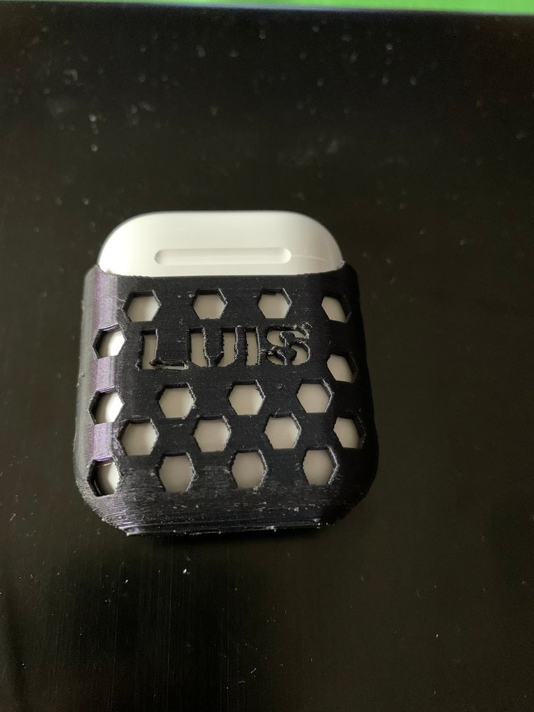 Een Airpods v2 zeshoekig hoesje. Er zijn twee versies van het bestand, met en zonder een plek om je naam in te voegen.