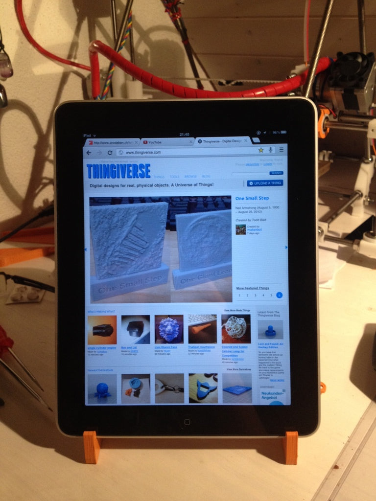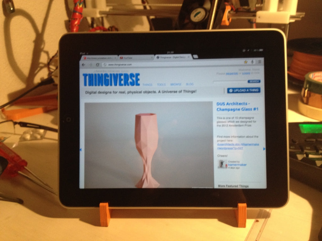 Dit is een eenvoudig af te drukken en compacte iPad-standaard. De standaard is zo ontworpen dat je hem gemakkelijk uit elkaar kunt halen, waardoor je ruimte kunt besparen. Print gewoon twee pagina's en een balk, druk ze op elkaar en je hebt een kant-en-klare standaard!