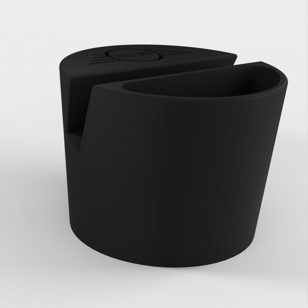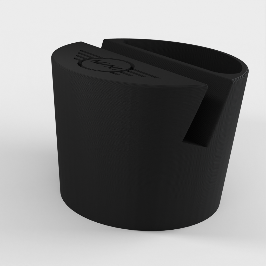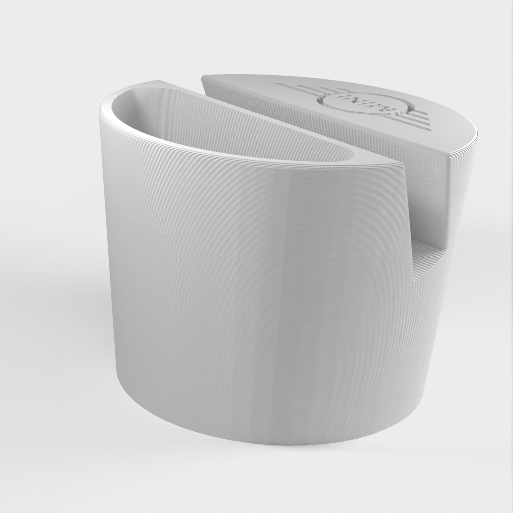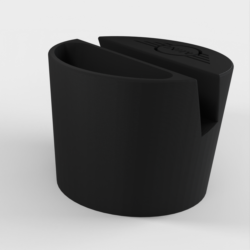 Telefoonhouder voor een Mini Cooper auto, ontworpen om in de bekerhouder te passen. De telefoonhouder is geschikt voor telefoons tot 11 mm dik en 75 mm breed. Met Mini-logo en een uitsparing voor kleine voorwerpen zoals afstandsbedieningen. Helpt je auto georganiseerd te houden en zorgt ervoor dat je telefoon altijd binnen handbereik is.
