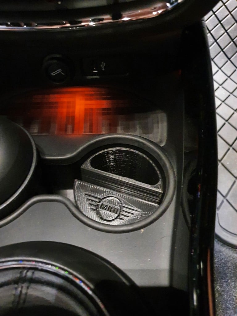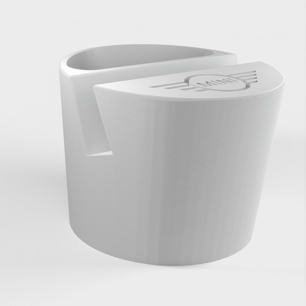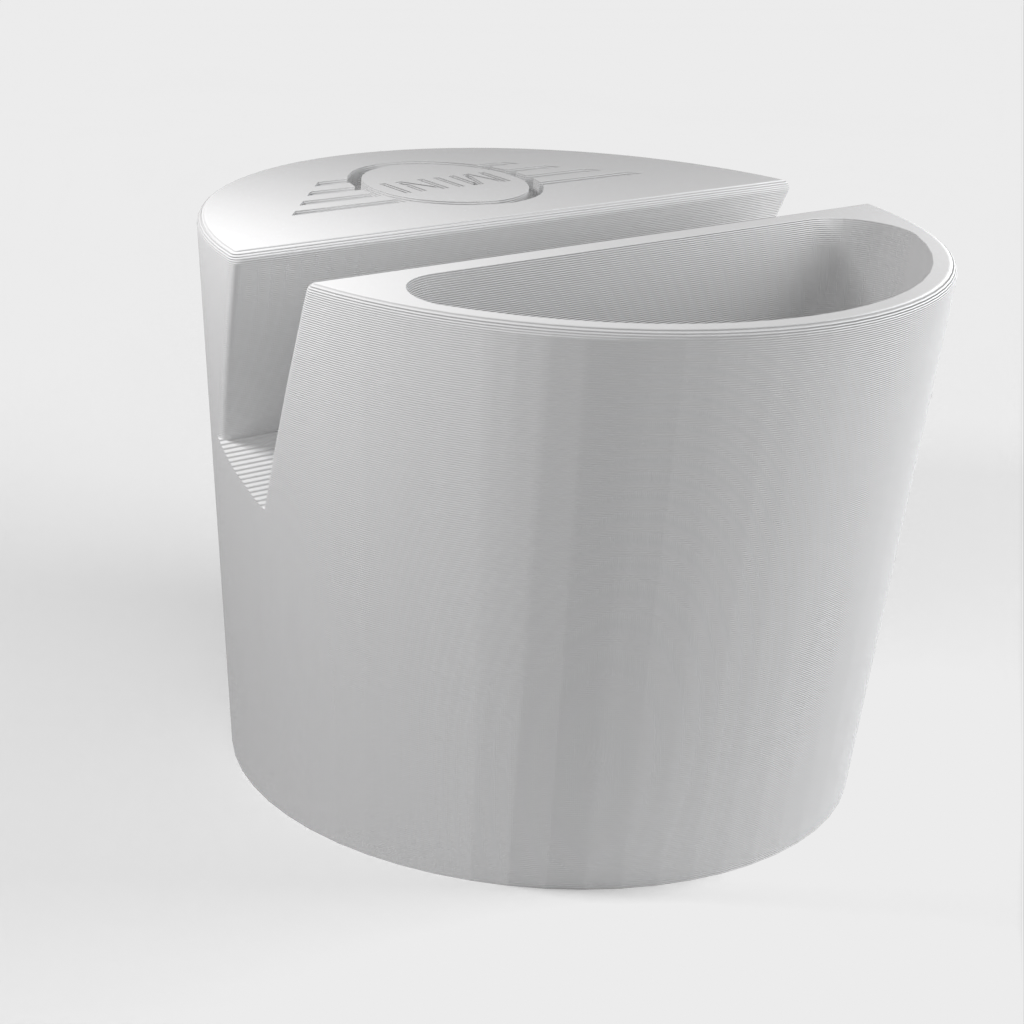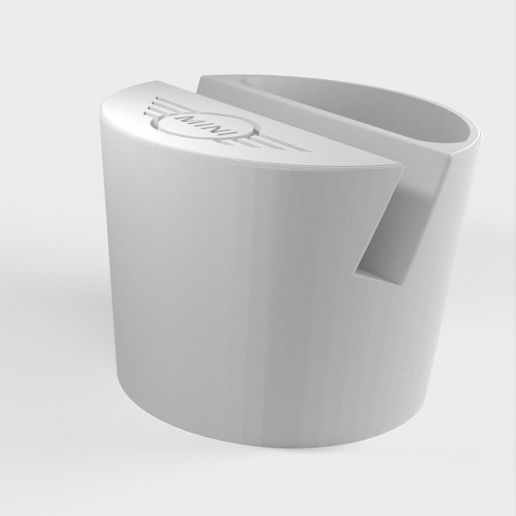 Telefoonhouder voor een Mini Cooper auto, ontworpen om in de bekerhouder te passen. De telefoonhouder is geschikt voor telefoons tot 11 mm dik en 75 mm breed. Met Mini-logo en een uitsparing voor kleine voorwerpen zoals afstandsbedieningen. Helpt je auto georganiseerd te houden en zorgt ervoor dat je telefoon altijd binnen handbereik is.