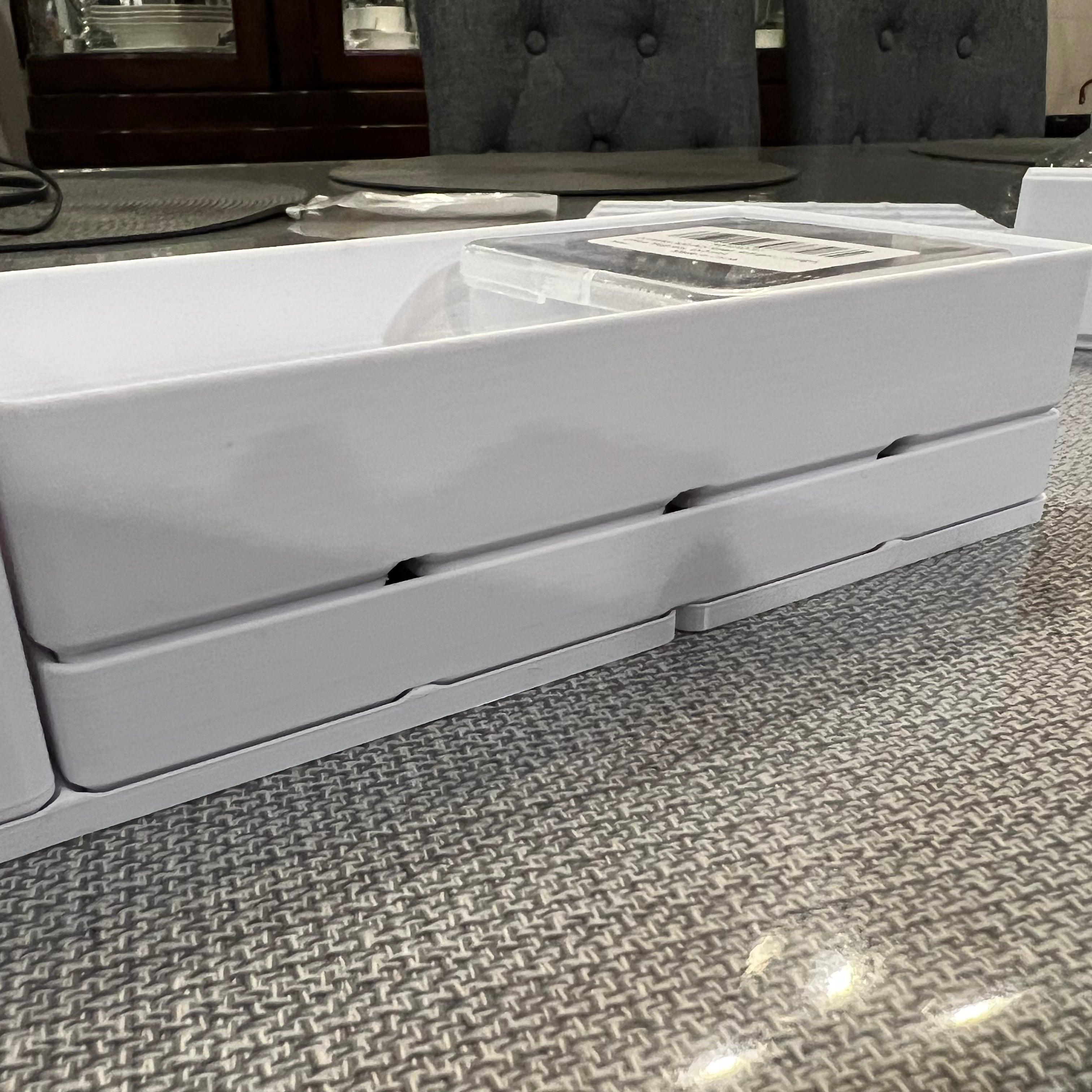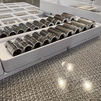 Deze organizer is ontworpen om 1/4" doppen van een Harbor Freight set vast te houden en biedt een gestructureerde opslagoplossing. Het is compatibel met het Gridfinity-systeem, waardoor een georganiseerde en modulaire opstelling in je gereedschapskist of lade mogelijk is. De houder is gemaakt met nauwkeurige afmetingen, zodat je SAE- en metrische doppen veilig op hun plaats blijven zonder rond te rollen, terwijl ze toch gemakkelijk te verwijderen zijn. De diepte van deze module is geoptimaliseerd, zodat je er extra Gridfinity-opslagoplossingen bovenop kunt plaatsen, waardoor je 1x4 ruimtegebruik maximaal wordt benut. Het ondersteunt een breed scala aan dopsleutelmaten, waaronder de meest voorkomende SAE (3/16" tot 9/16") en metrische (5 mm tot 14 mm) maten.