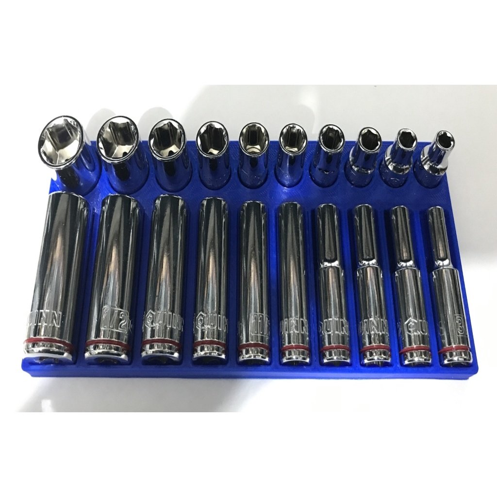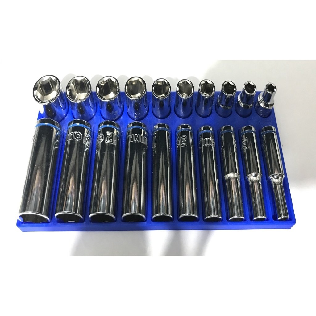 Deze organizers voor 1/4" doppen zijn ontworpen om de organisatie in uw gereedschapskist te verbeteren, zowel voor metrische als SAE-maten. Ze helpen om uw doppen systematisch op te bergen, waardoor ze gemakkelijker te vinden en te gebruiken zijn tijdens het werk. Het ontwerp ondersteunt zowel standaard als diepe doppen.