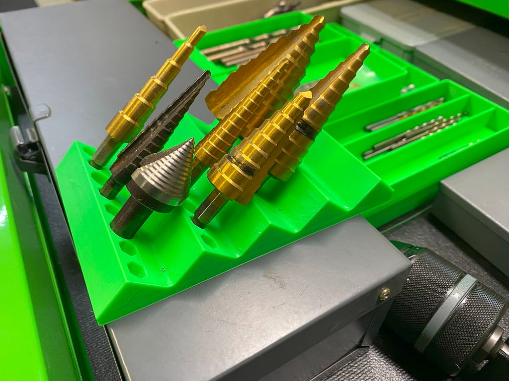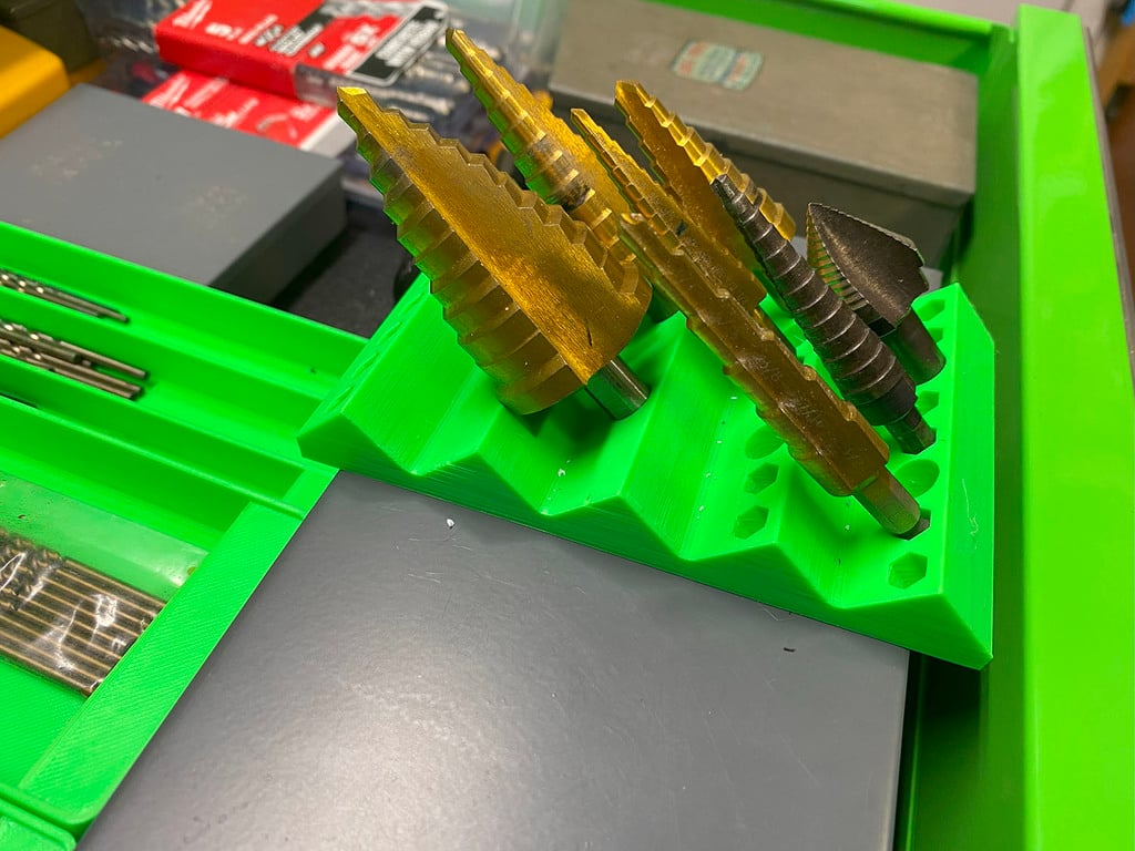 Deze gereedschapsorganizer is ontworpen om een overzichtelijke opslagoplossing te bieden voor uw verzinkboren en trapboren. Het helpt om uw gereedschap bij elkaar te houden en gemakkelijk toegankelijk te maken, waardoor verspilde tijd en frustratie op de werkvloer worden geminimaliseerd. Of u nu een ervaren vakman bent of een toegewijde hobbyist, deze houder kan bijdragen aan een meer georganiseerde en efficiënte workflow. Omdat veel boren verschillende afmetingen hebben, is deze organiserende oplossing bedoeld als een flexibel startpunt dat kan worden aangepast aan individuele behoeften en specifieke boorsets. Krijg een beter overzicht en creëer orde in uw gereedschapskast met dit praktische opslagapparaat.