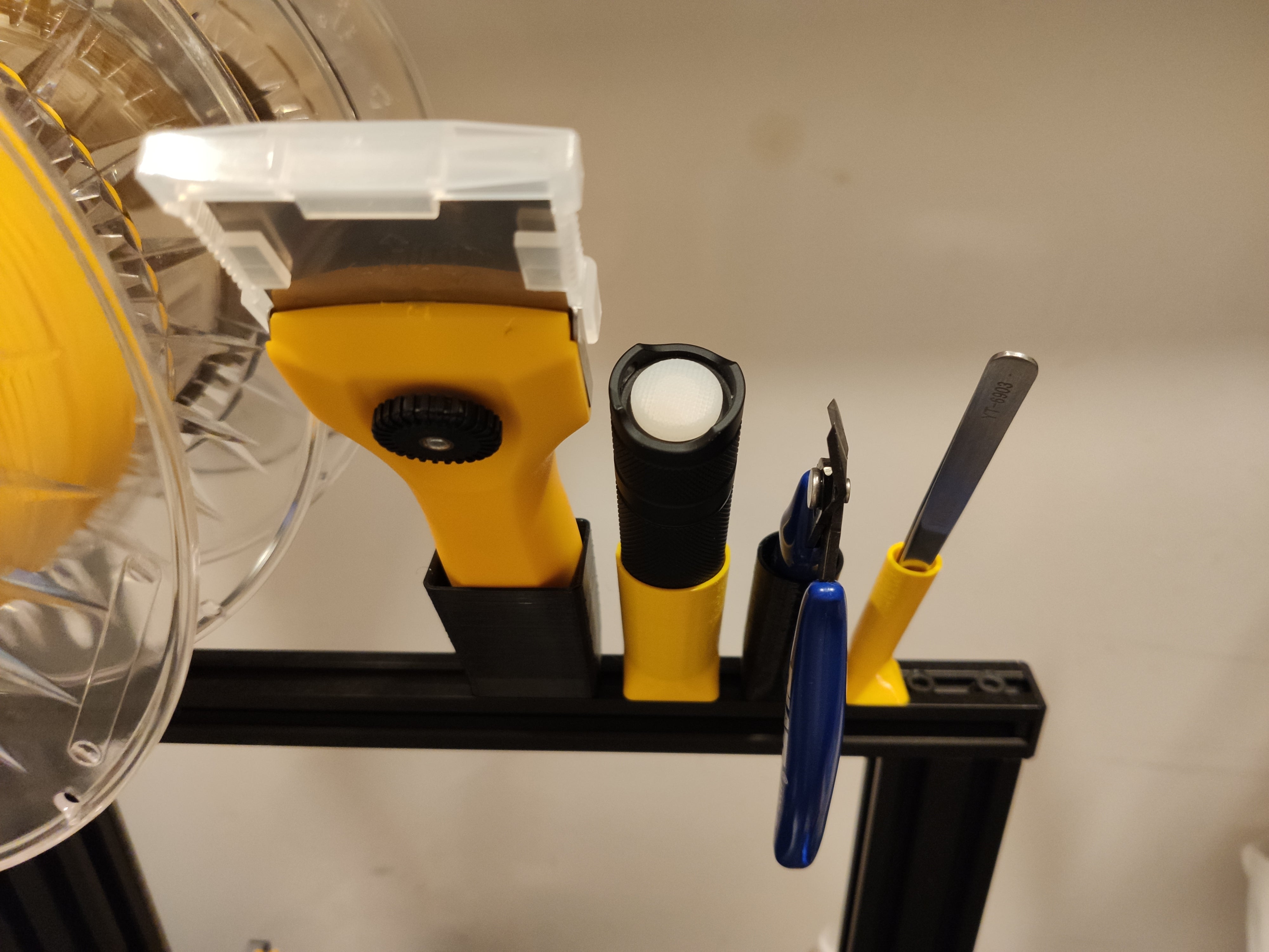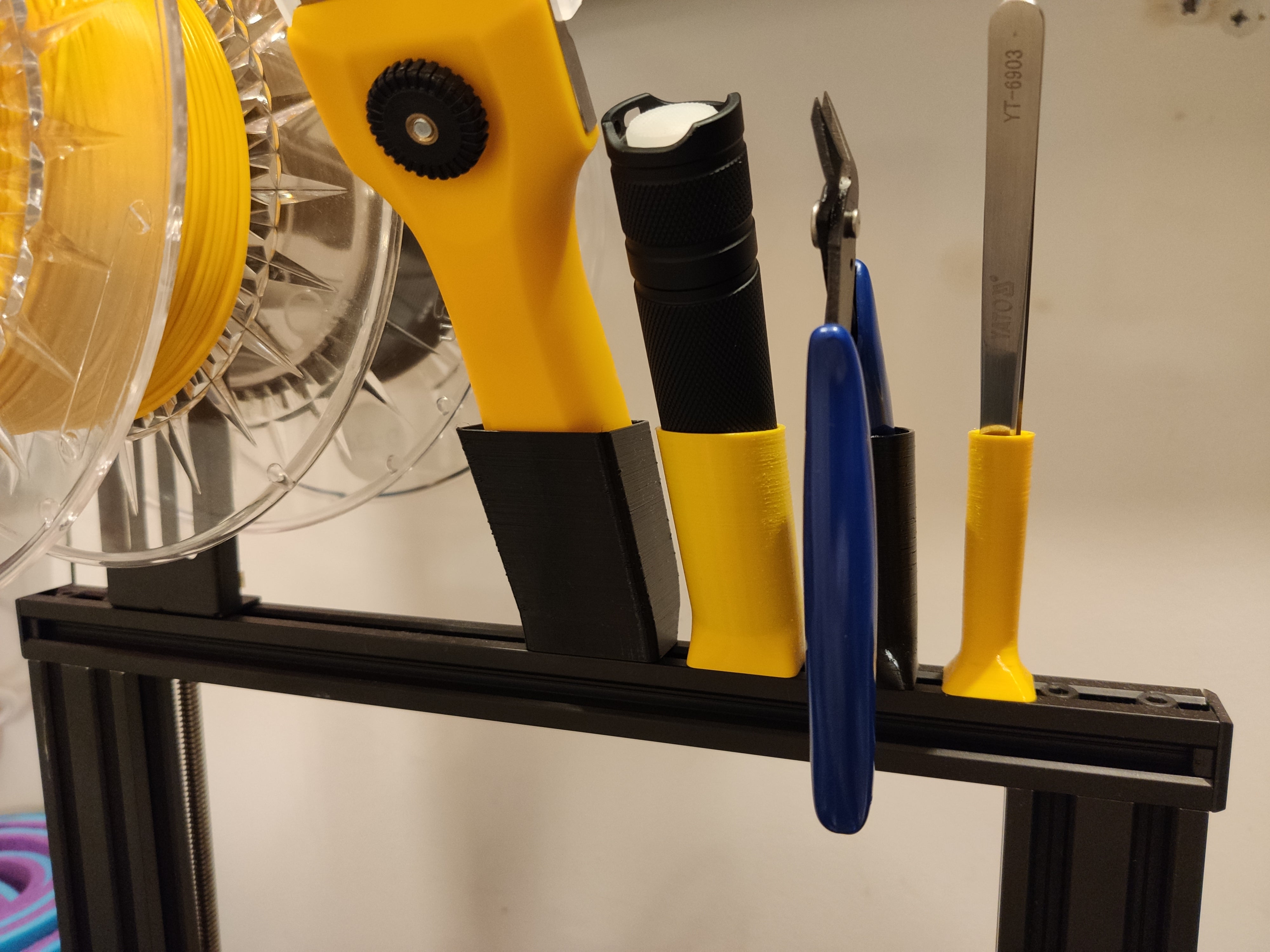 Elke houder wordt afzonderlijk aan de extrusie bevestigd met een enkele T-moer en een M4-schroef, wat zorgt voor een stabiele en betrouwbare montage. Dit systeem helpt bij het onderhouden van een opgeruimd en functioneel werkstation, waar essentiële gereedschappen systematisch zijn georganiseerd en gemakkelijk te vinden zijn, waardoor uw werkproces wordt verbeterd.