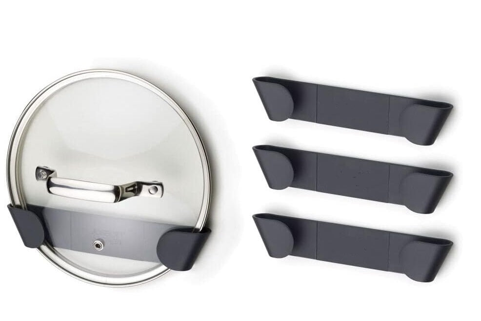 Deze praktische kastdeur organizer is ontworpen om orde te scheppen in uw potdeksels en ze gemakkelijk toegankelijk te houden. Door gebruik te maken van de vaak over het hoofd geziene ruimte aan de binnenkant van uw kastdeuren, kunt u waardevolle plankruimte in uw keukenkasten vrijmaken. Het systeem helpt voorkomen dat de deksels rondslingeren of onnodig veel ruimte innemen. Het zorgt ervoor dat uw potdeksels veilig worden opgeborgen en direct bij de hand zijn wanneer u ze nodig heeft. Een simpele oplossing voor een meer georganiseerde keukenomgeving.