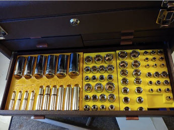 Deze modulaire doporganizer is ontworpen om orde in uw werkplaats te brengen en ervoor te zorgen dat uw doppen altijd gemakkelijk toegankelijk zijn. Het systeem biedt plaats aan een complete set doppen in zowel metrische als SAE-maten en ondersteunt aandrijfmaten van 1/4", 3/8" en 1/2". Hij is op maat gemaakt om perfect in de laden van een Kennedy gereedschapskist te passen, waardoor de ruimte wordt gemaximaliseerd en een duidelijk overzicht van uw gereedschap wordt geboden.