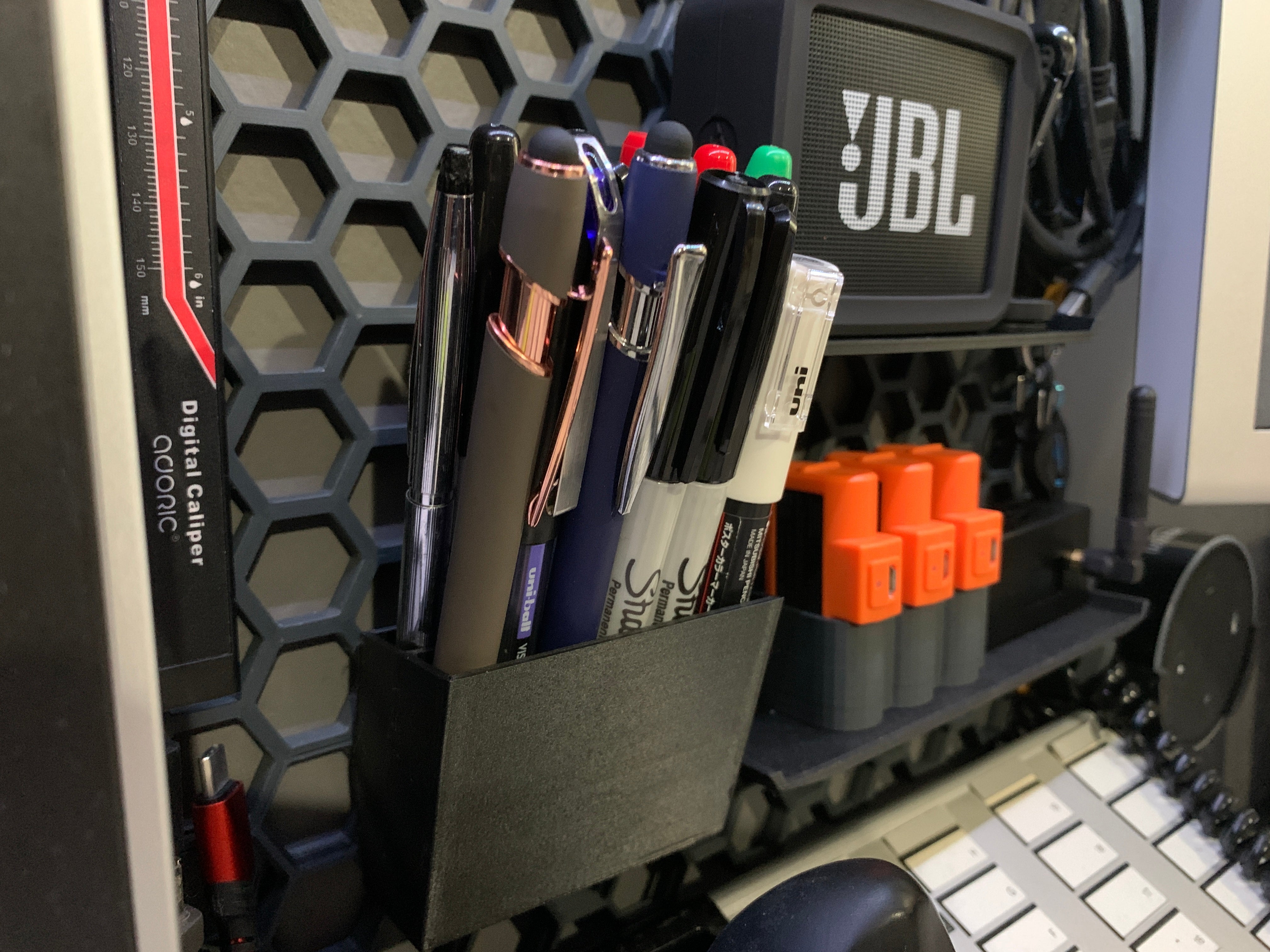 Deze veelzijdige organizer is ontworpen om naadloos te integreren met uw honingraat opbergwand en biedt een praktische oplossing om uw spullen georganiseerd te houden. Het is ideaal voor het opbergen van pennen, potloden, markers en kleinere items zoals afstandsbedieningen.