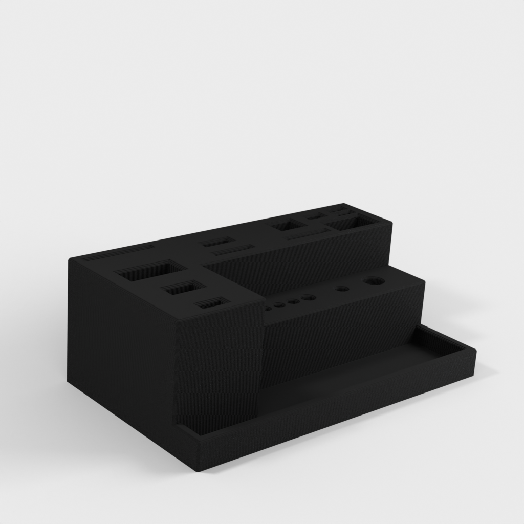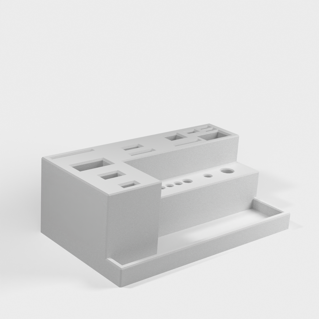 De gereedschapshouder is uitgerust met een praktische bak aan de voorkant, die ideaal is voor het opbergen van kleinere onderdelen zoals schroeven of sproeiers, zodat deze vaak gebruikte items direct bij de hand zijn. Het product is ontworpen om te worden vervaardigd uit robuuste materialen zoals PLA of PETG, wat een duurzame oplossing biedt voor dagelijks gebruik in uw 3D-printomgeving.