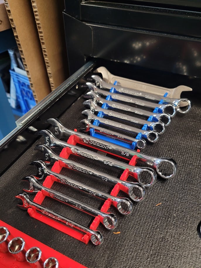 De standaardversie biedt plaats aan maximaal 6 sleutels, terwijl een uitgebreide versie ruimte biedt aan 7. Met een hoogte van slechts 22,25 mm (zonder sleutels) past deze gereedschapsorganizer gemakkelijk in de meeste laden en gereedschapskisten. Kleine, ingebouwde magneten langs de horizontale stangen zorgen ervoor dat uw sleutels veilig op hun plaats blijven en niet verschuiven tijdens transport of opslag.