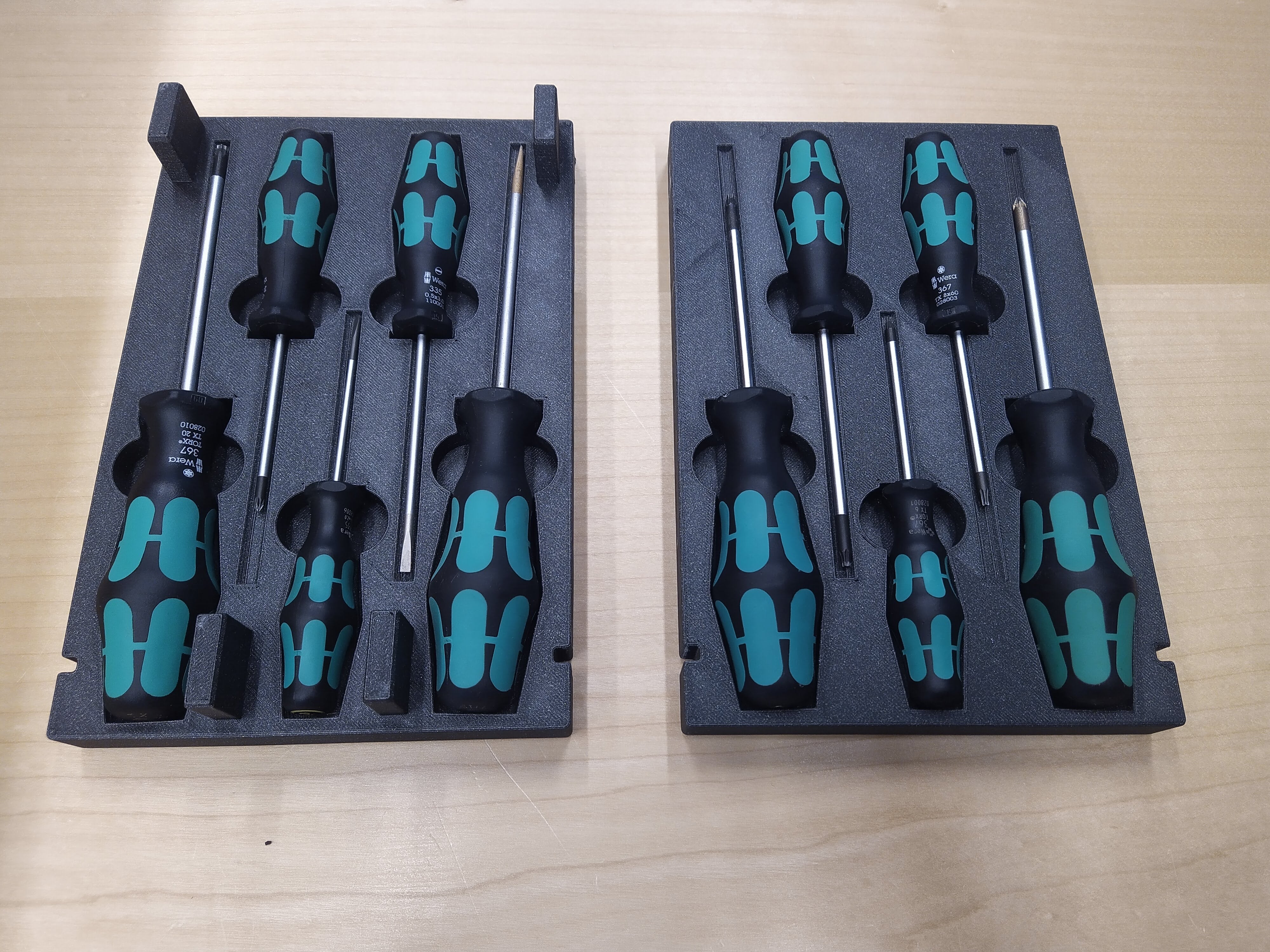 Deze stapelbare bak is ontworpen om uw schroevendraaiers efficiënt te organiseren. Hij is specifiek aangepast om de drie primaire maten WERA handgrepen en klinglengtes te bevatten. Elke bak kan 2 grote (kling 100 mm, handgreep 98 mm), 2 middelgrote (kling 80 mm, handgreep 81 mm) en 1 kleine schroevendraaier (kling 60 mm, handgreep 70 mm) bevatten.