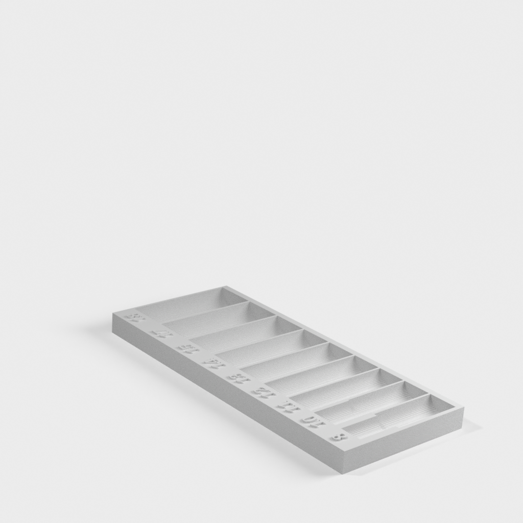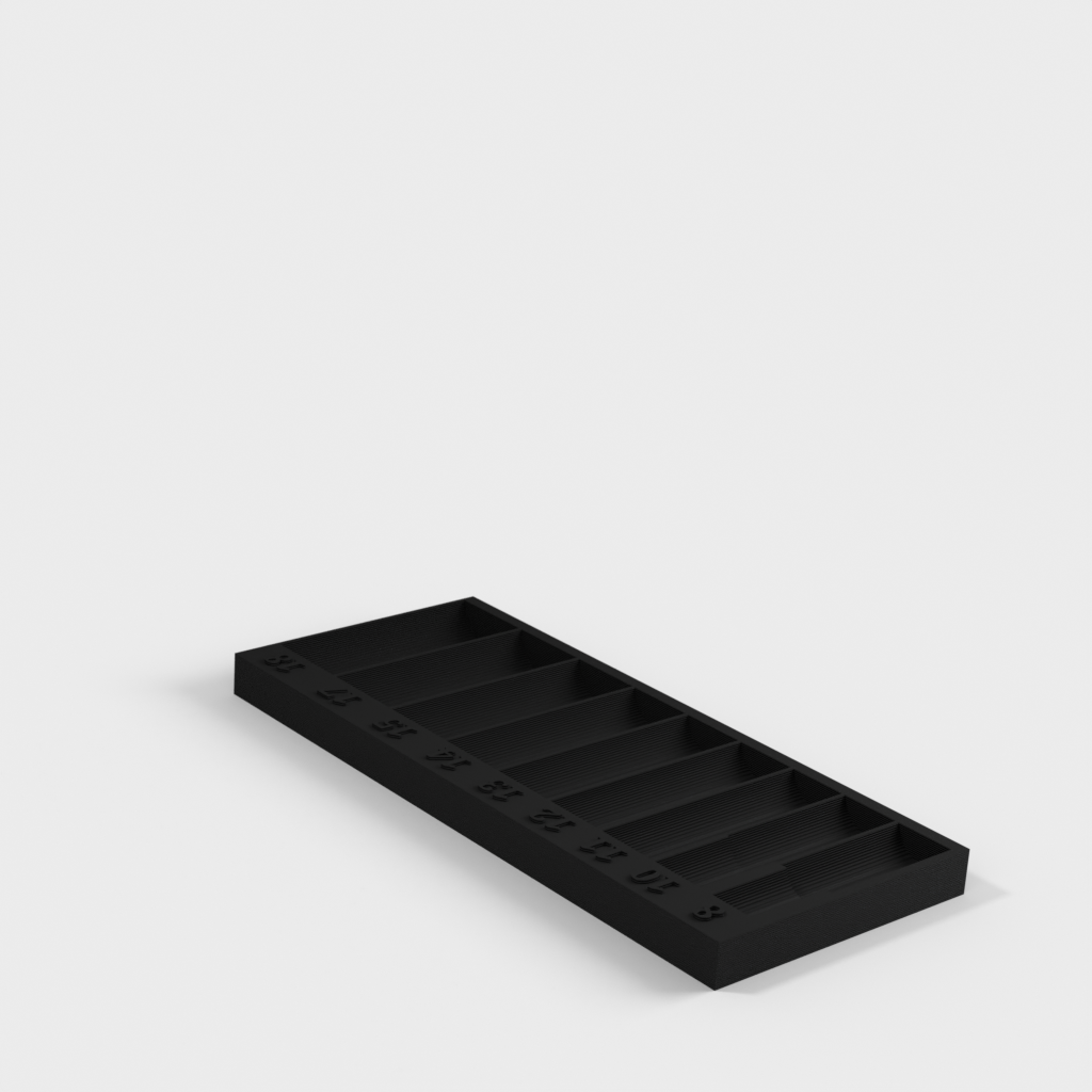 Deze praktische dopsleutel organizer is ontwikkeld om je diepe doppen en hulzen te systematiseren. Met ruimte voor acht 3/8" diepe doppen helpt het om je gereedschap netjes bij elkaar te houden en voorkomt dat ze los in lades of op werkbladen liggen.