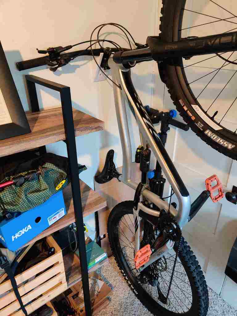 Wandmontage voor een 2020 Ibis Ripmo AF mountainbike. Deze beugel is zo ontworpen dat de fiets dicht tegen de muur rust, terwijl het achterwiel op de grond rust. Het is een robuust stuk uitrusting dat gemakkelijk het gewicht van je fiets kan dragen. Kan worden gemonteerd met behulp van de zijbeugels. Compatibel met de Ripmo AF-modellen.