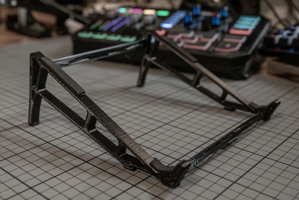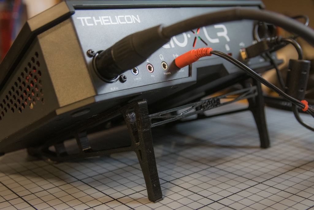 GoXLR-audio-interfacemogelijkheid om alles een beetje toegankelijker te maken. Het kantelt de interface ca. 25° tot een nieuwe totale hoogte van 14 cm, de voorkant is ongeveer 1,5 cm verhoogd zodat overtollige hoofdtelefoon- of toetsenbordkabel eronder kan worden opgeborgen. U moet beide delen tweemaal afdrukken. Zie ook v2 van de standaard die ook de miniversie ondersteunt.
