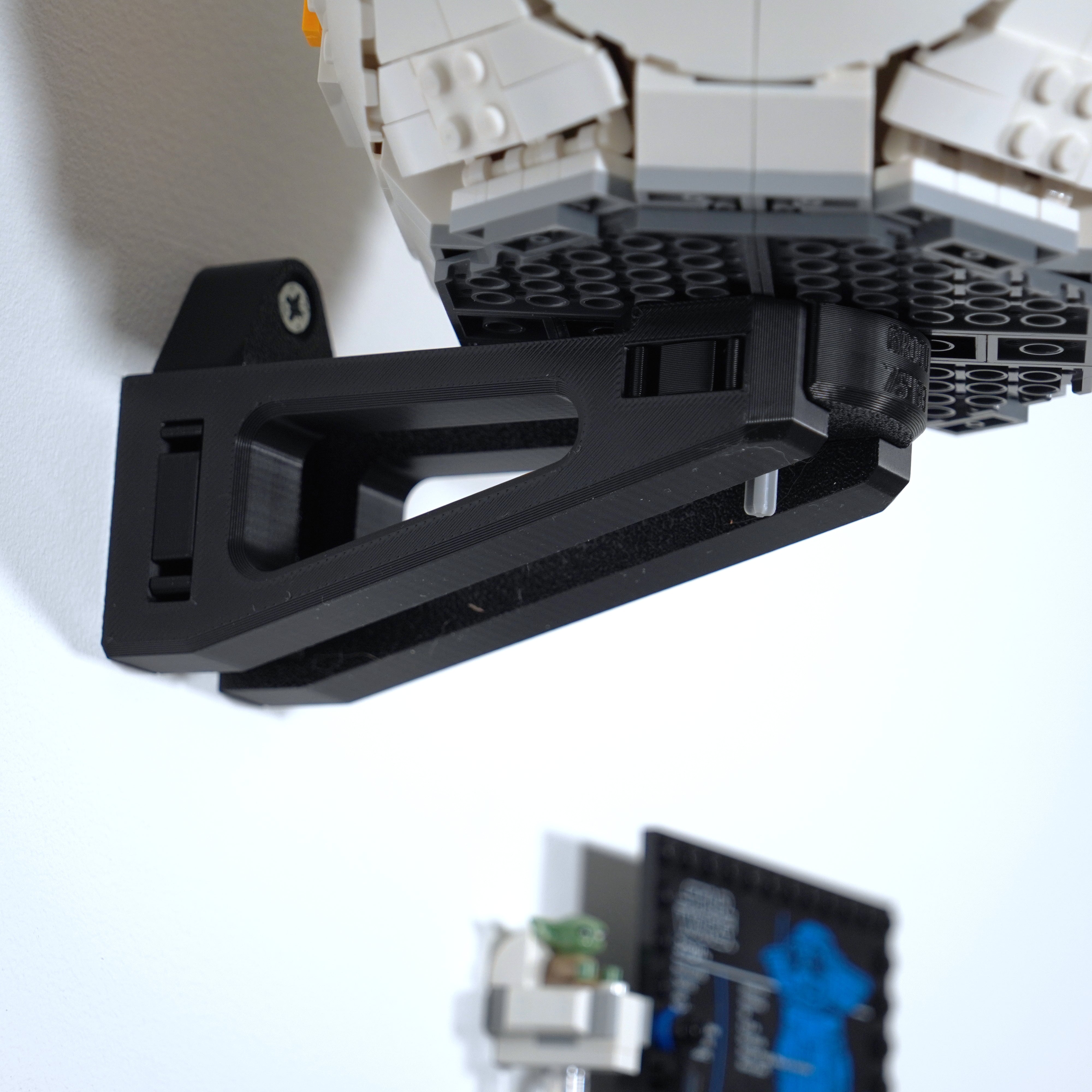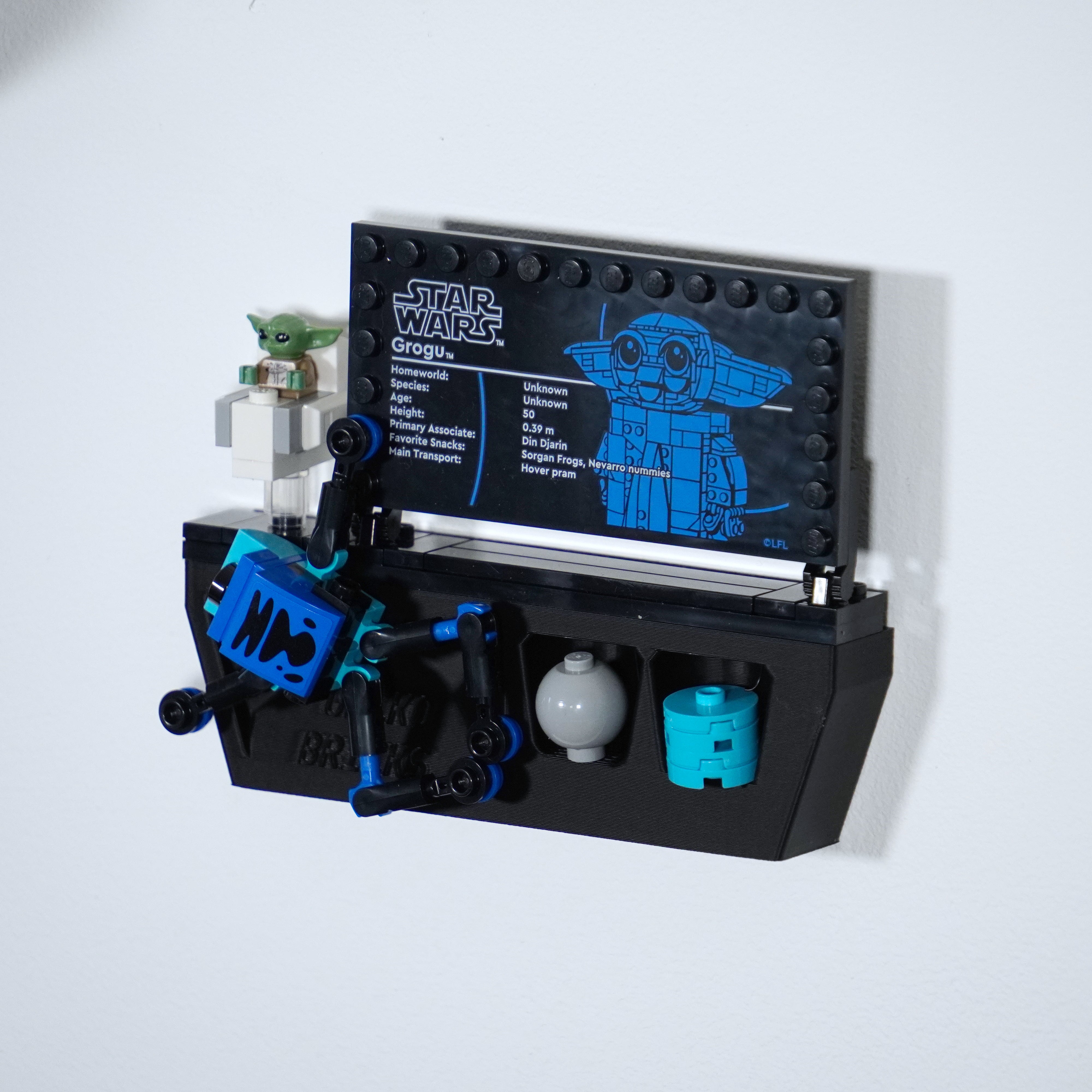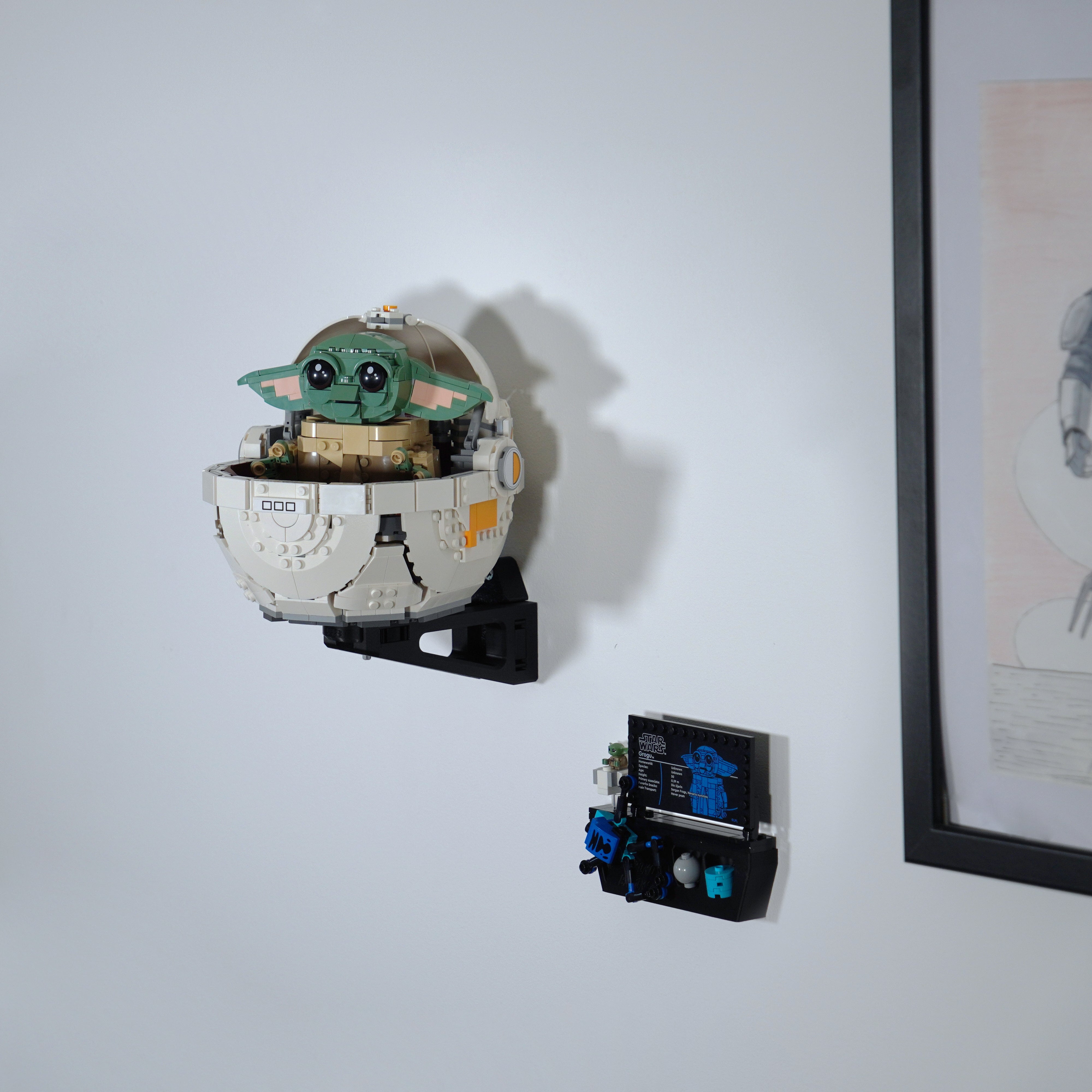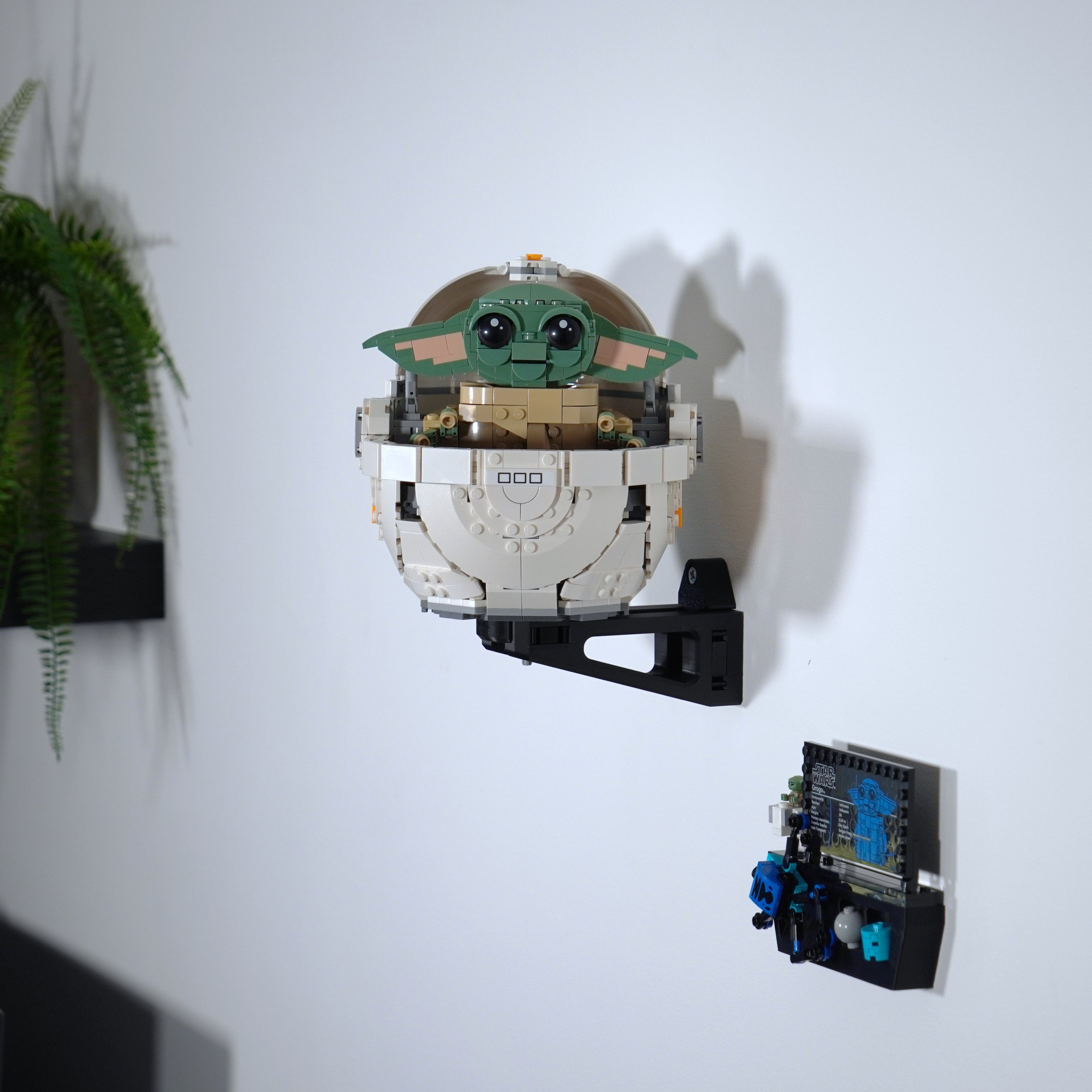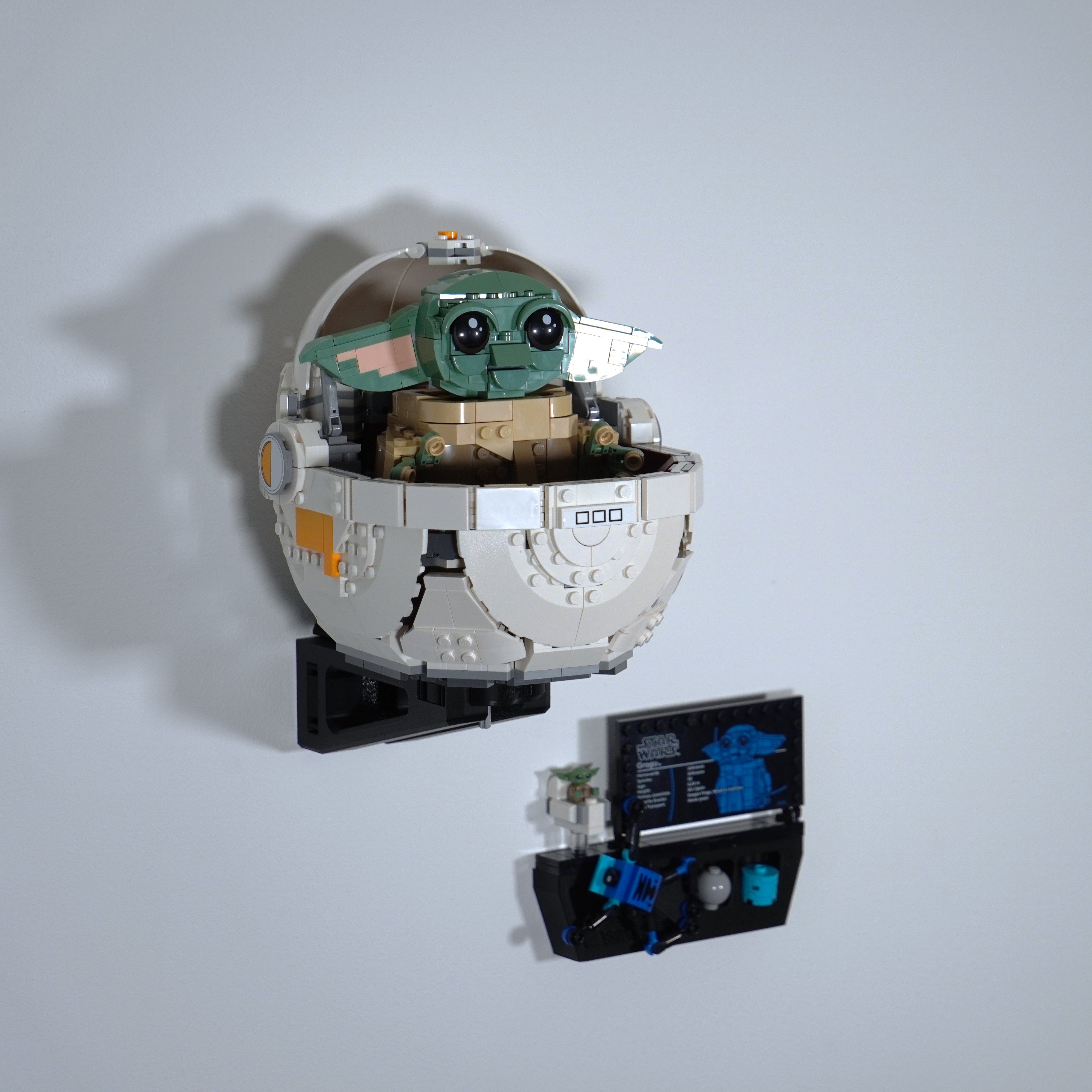 Breng uw verzameling onder controle met deze wandhouder, speciaal ontworpen voor de LEGO Star Wars set met Grogu. De beugel wordt eenvoudig met één schroef gemonteerd en zorgt ervoor dat het model stabiel hangt. Er is ook ruimte voor zowel de informatieplaat als de accessoires, zodat alles op één plek wordt bewaard.