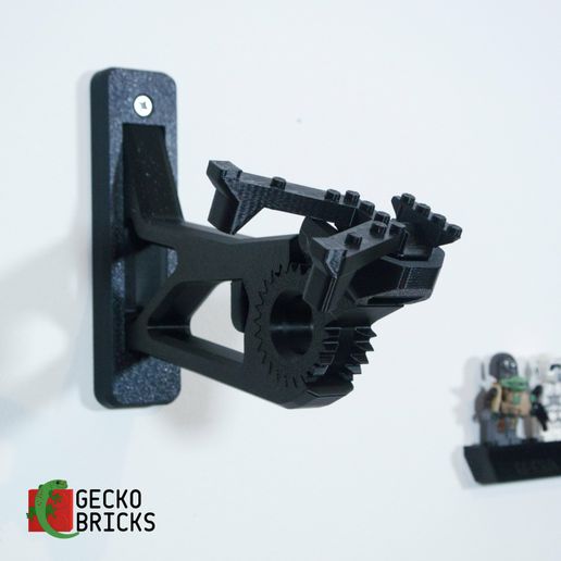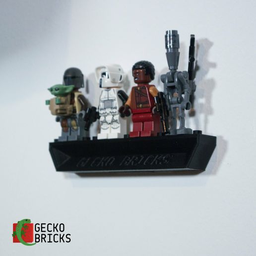 - Der medfølger en separat vægmonteret stander til minifigurer, som kan fastgøres uden brug af skruer ved hjælp af en klæbestrip.