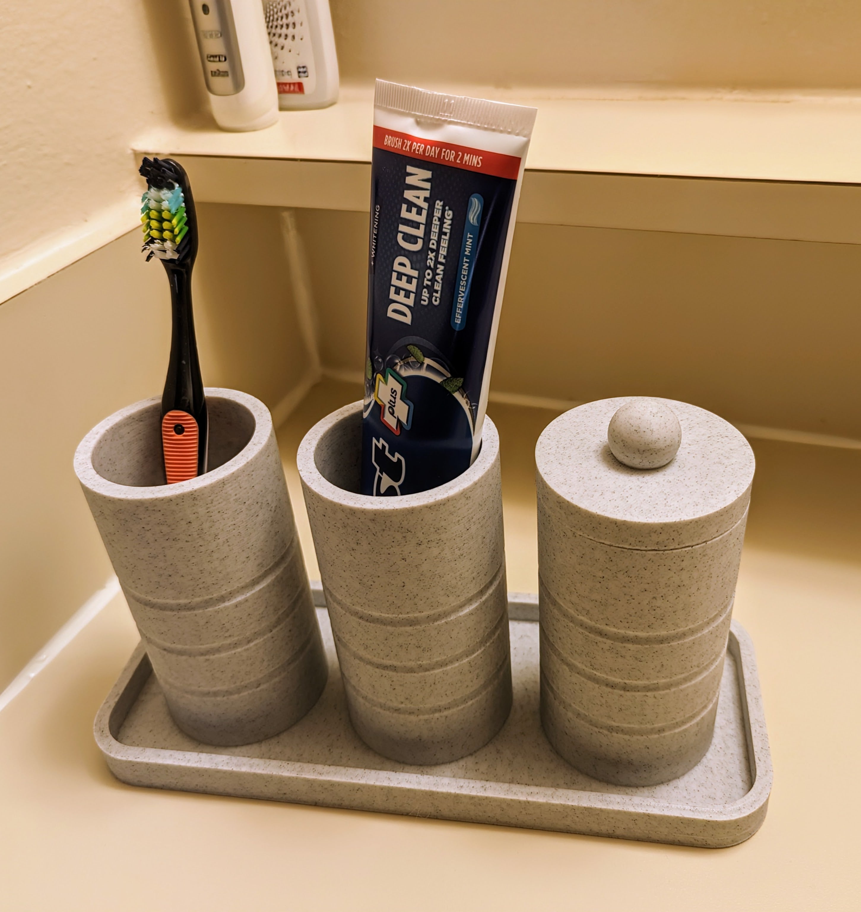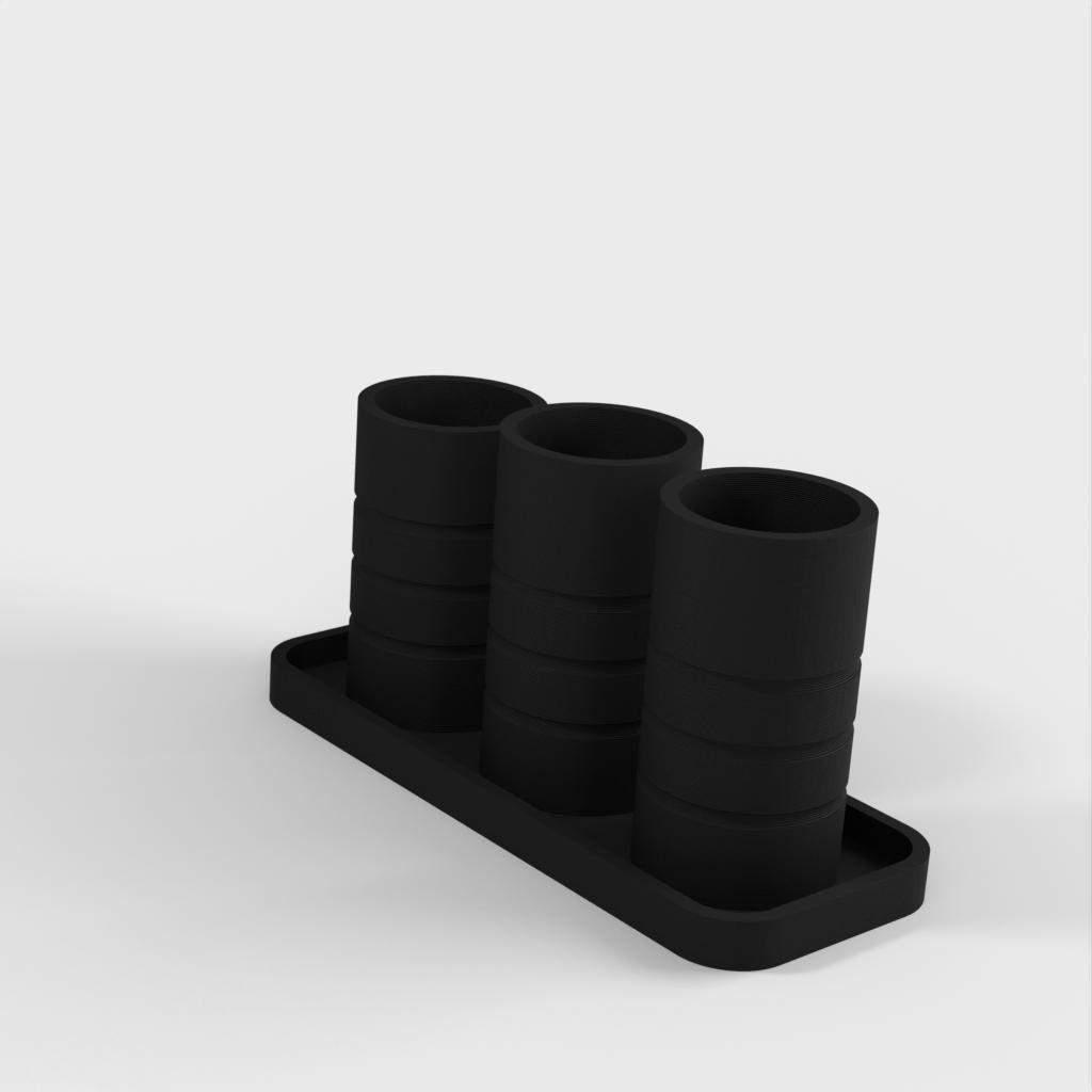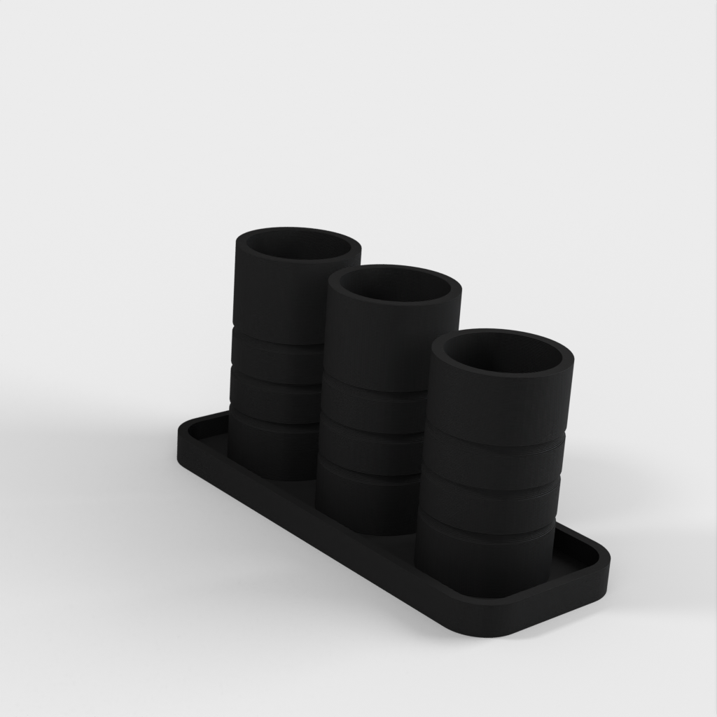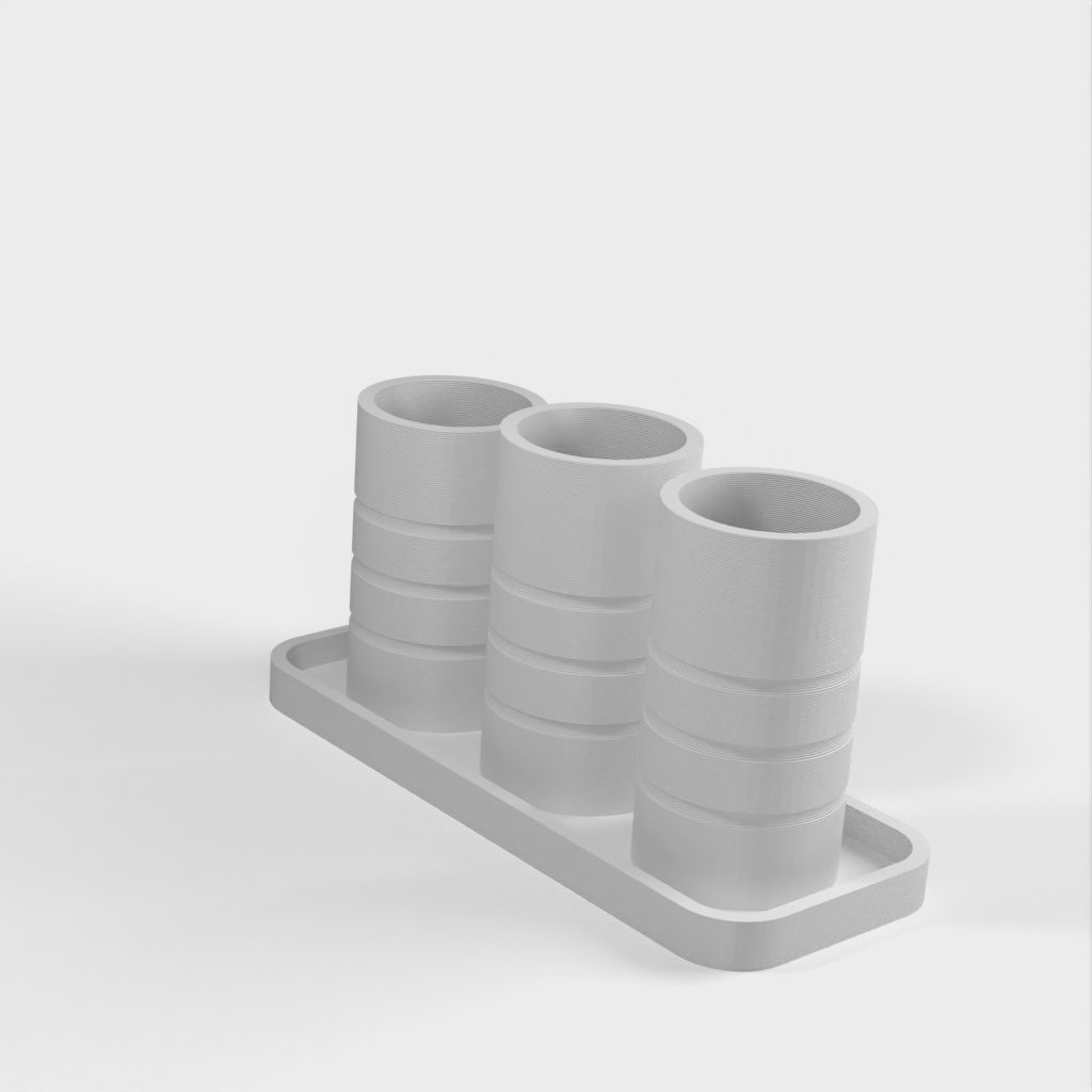 Een eenvoudige badkamer organizer met twee houders voor tandenborstels en een derde voor q-tips of andere spullen. Helpt je badkamer netjes en georganiseerd te houden.