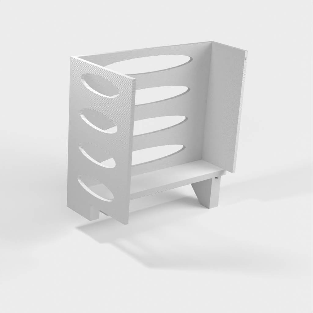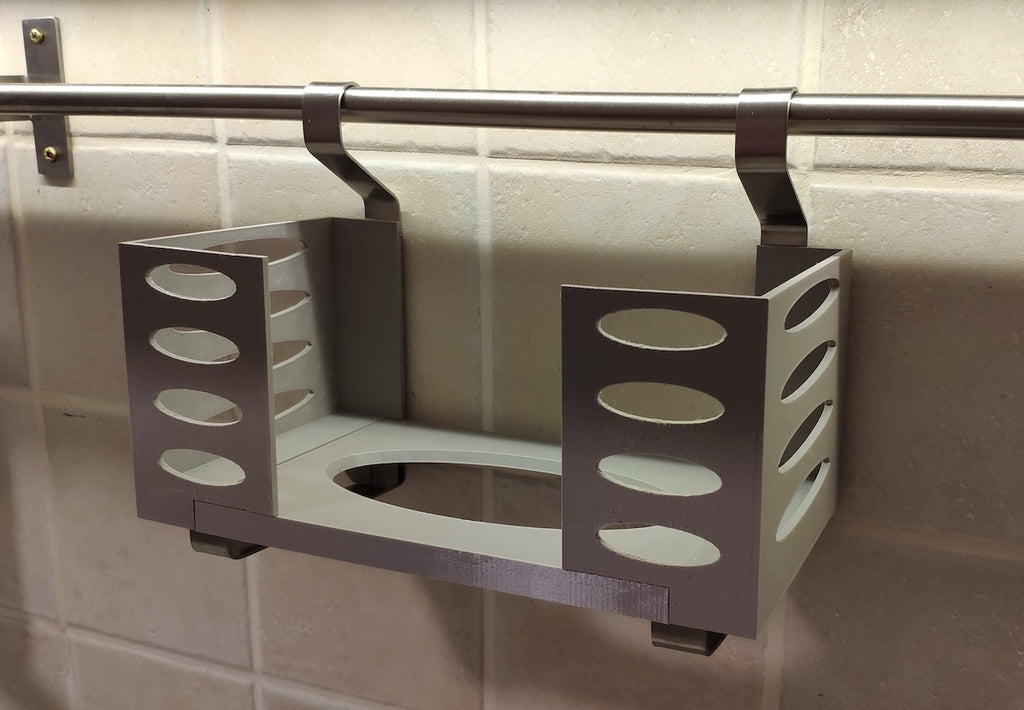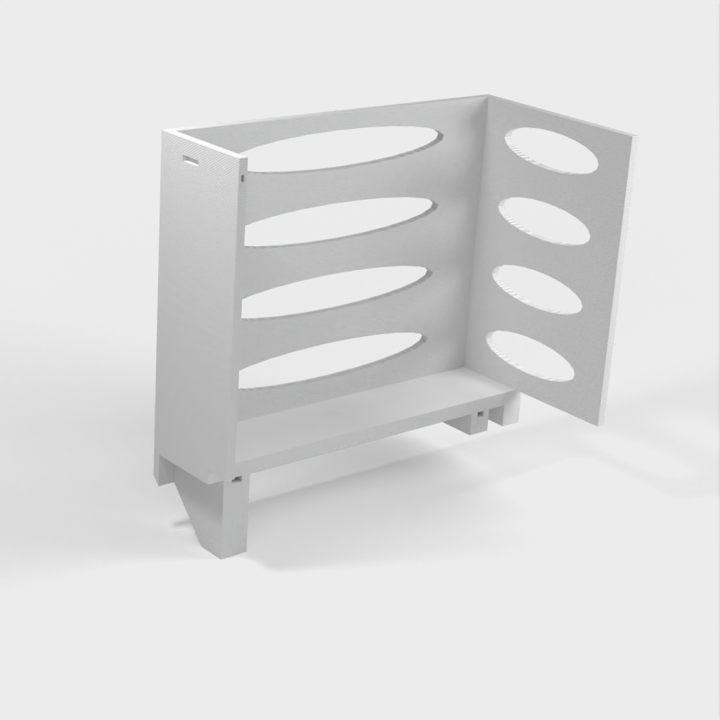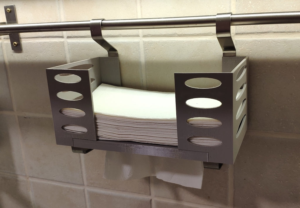 Deze papieren handdoekdispenser kan op een Ikea Grundtal plankbeugel worden gemonteerd. Verwijder gewoon de lade en plaats de afgedrukte items op de consoles. Het product heeft kleinere openingen aan de onderkant die gebruikt kunnen worden om de items met een dunne draad aan elkaar vast te maken. Ook aan de achterkant zitten openingen voor montage. De binnenafmetingen zijn 130x 254 mm.