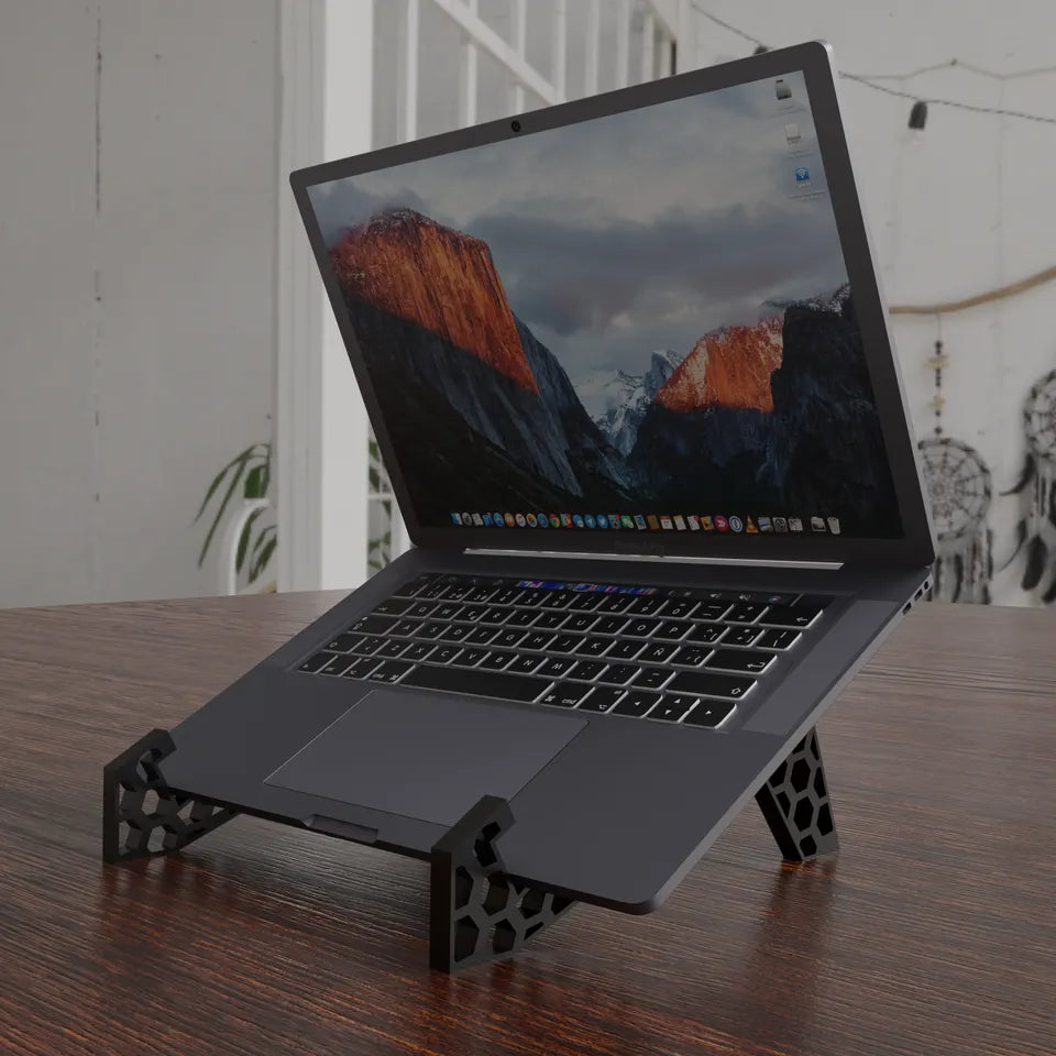 Eenvoudige laptop/draagbare standaard die op de meeste laptops past. Hij past zowel op MacBook pro's als MacBook Air. Hij is gemaakt in een zogenaamd honingraat design en de 4 delen klikken makkelijk in elkaar zonder gebruik te maken van schroeven of iets anders.