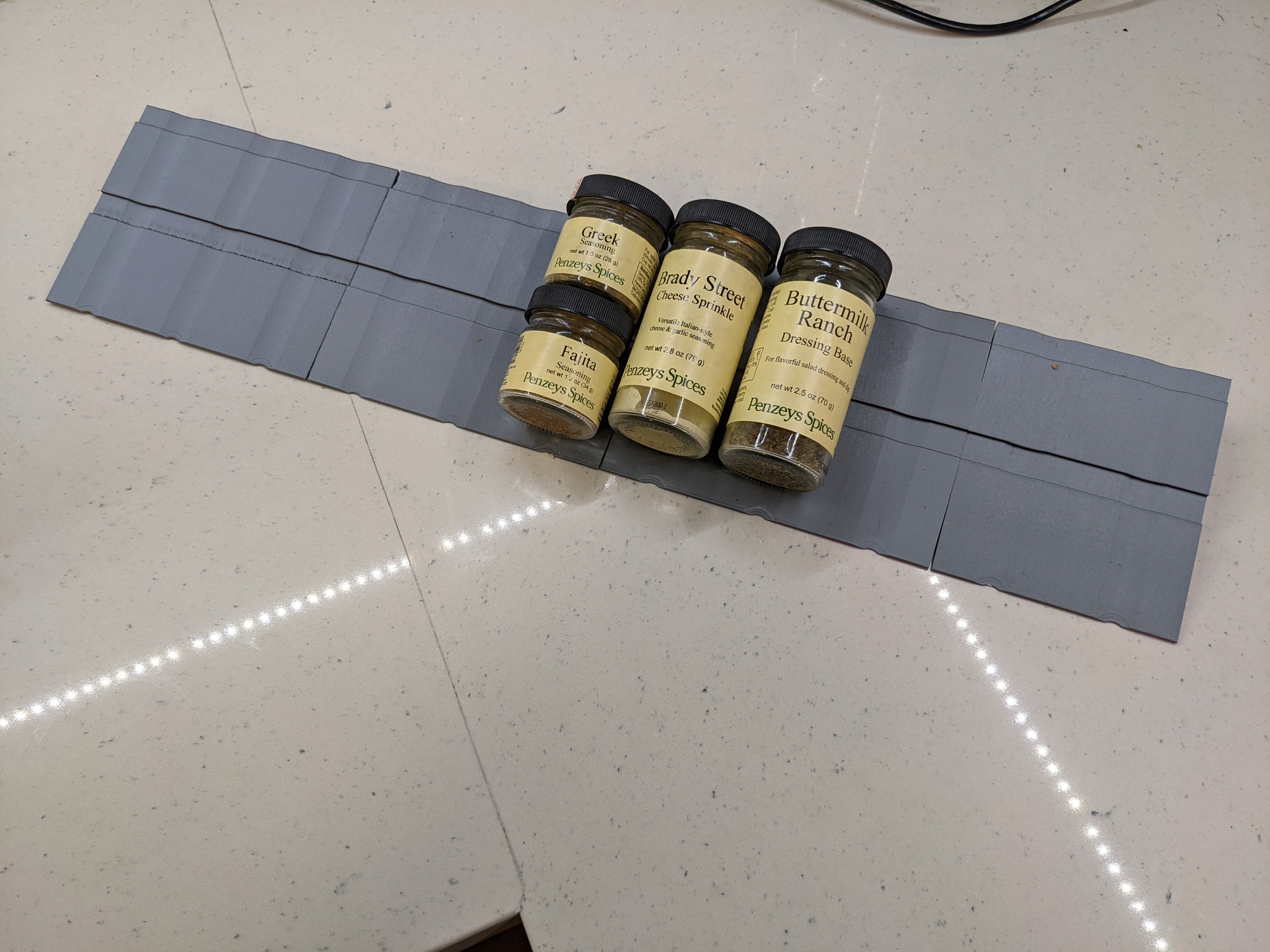 Dit is een ladevormig kruidenrek van Penzys dat is ontworpen voor twee 1/4 cup of één 1/2 cup Penzys kruidenpotjes. Het onderste deel van de stukken heeft een DIN-rail waarmee meerdere bedrukkingen kunnen worden samengevoegd met een stevig frame.