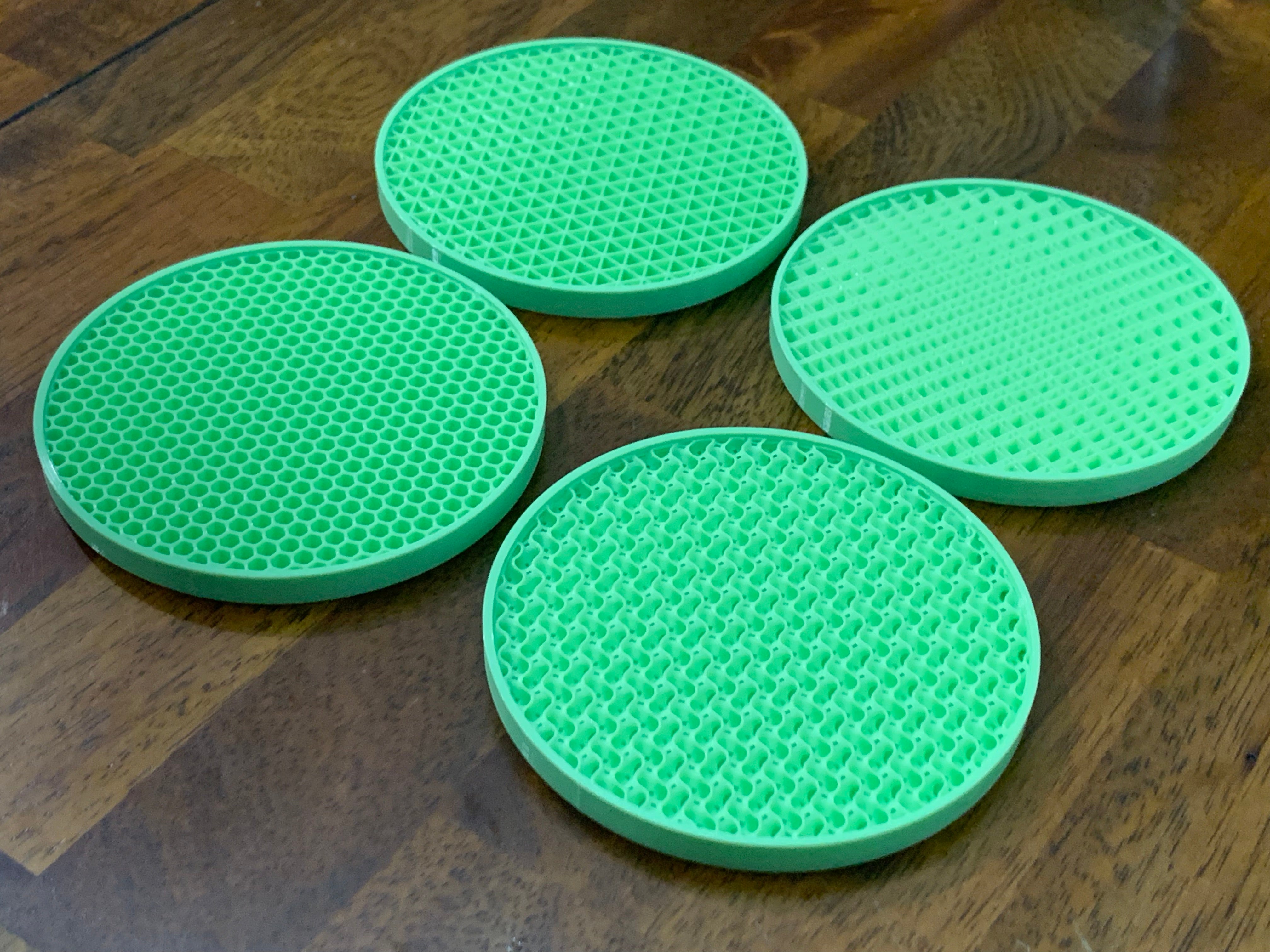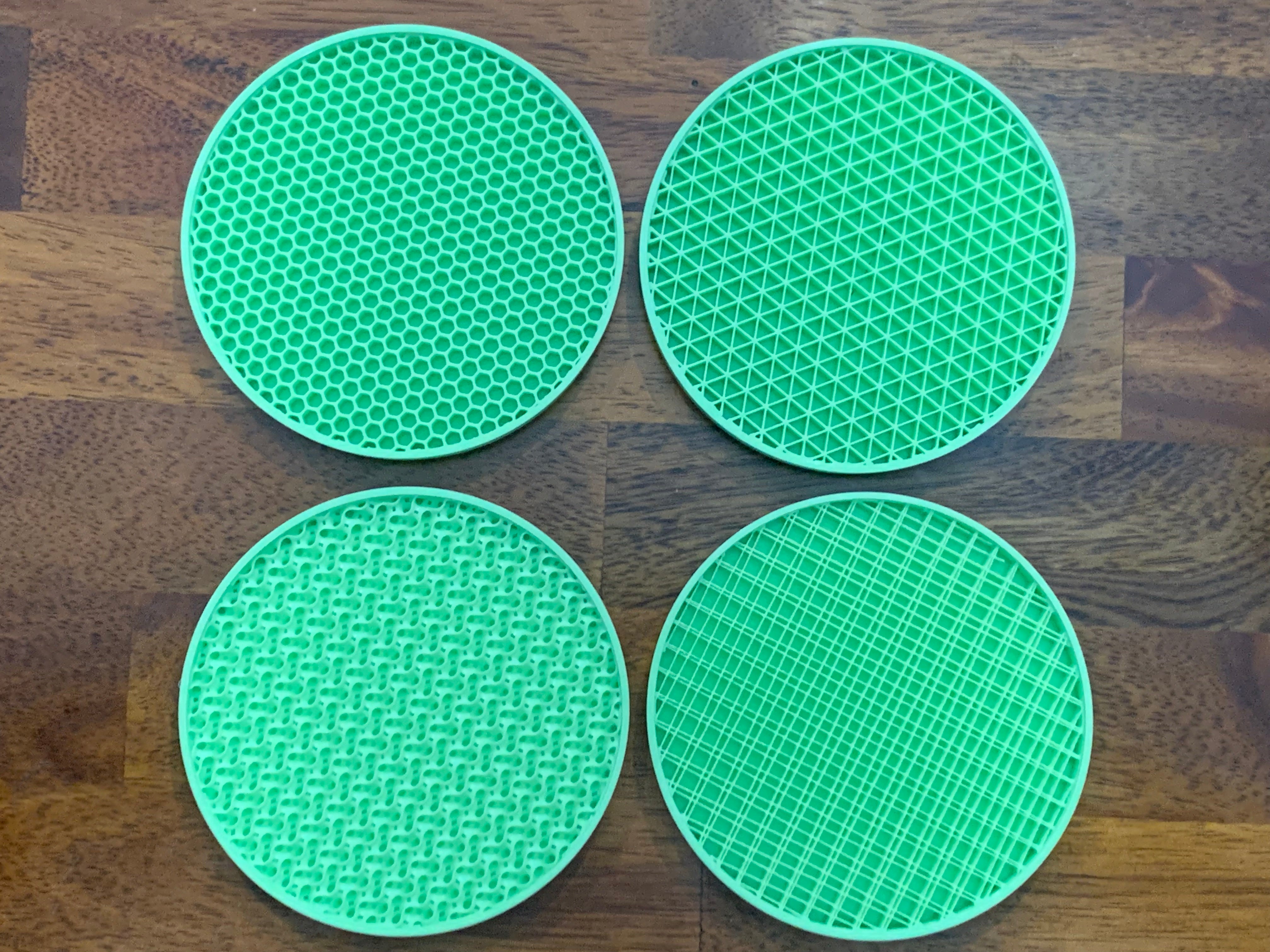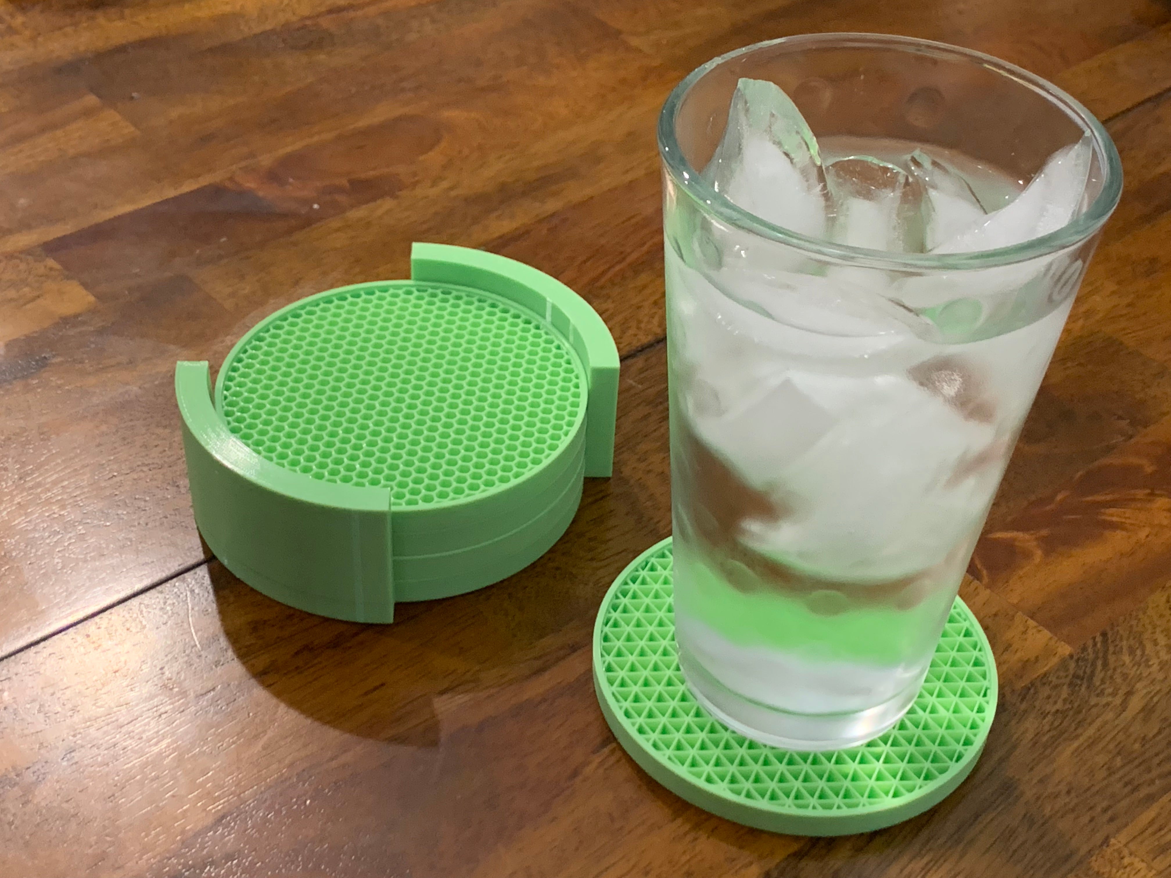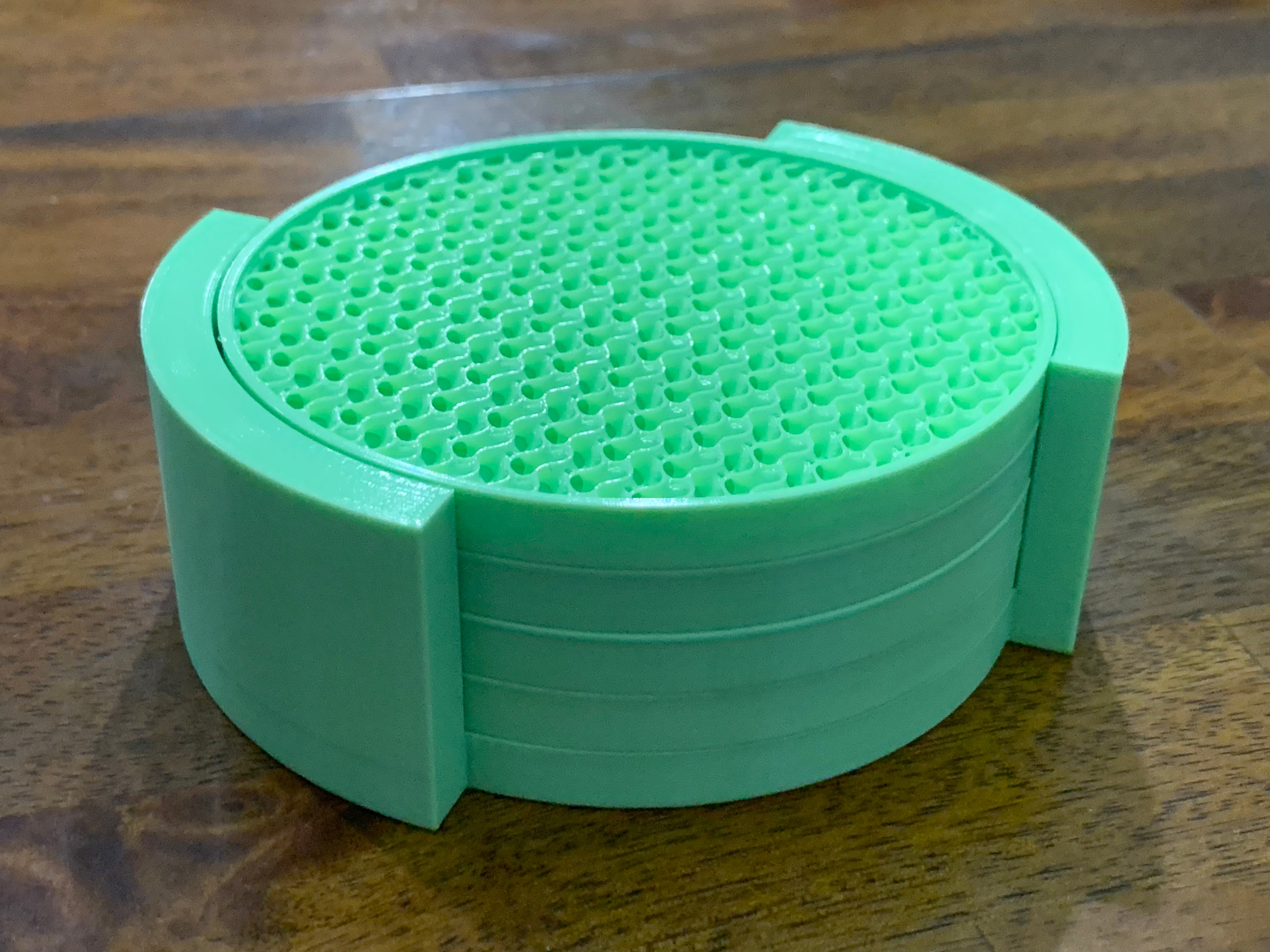 Deze set bestaat uit onderzetters en een houder voor onderzetters. De onderzetters zijn ontworpen om houten tafels te beschermen tegen condens van koude glazen. Elke onderzetter is bedrukt met een uniek invulpatroon zodat je verschillende ontwerpen kunt weergeven. De onderzetters worden ook geleverd met een houder voor eenvoudige opslag en presentatie op tafel. Het product bevat vier exemplaren van de onderzetters zodat je genoeg hebt om de houder te vullen.