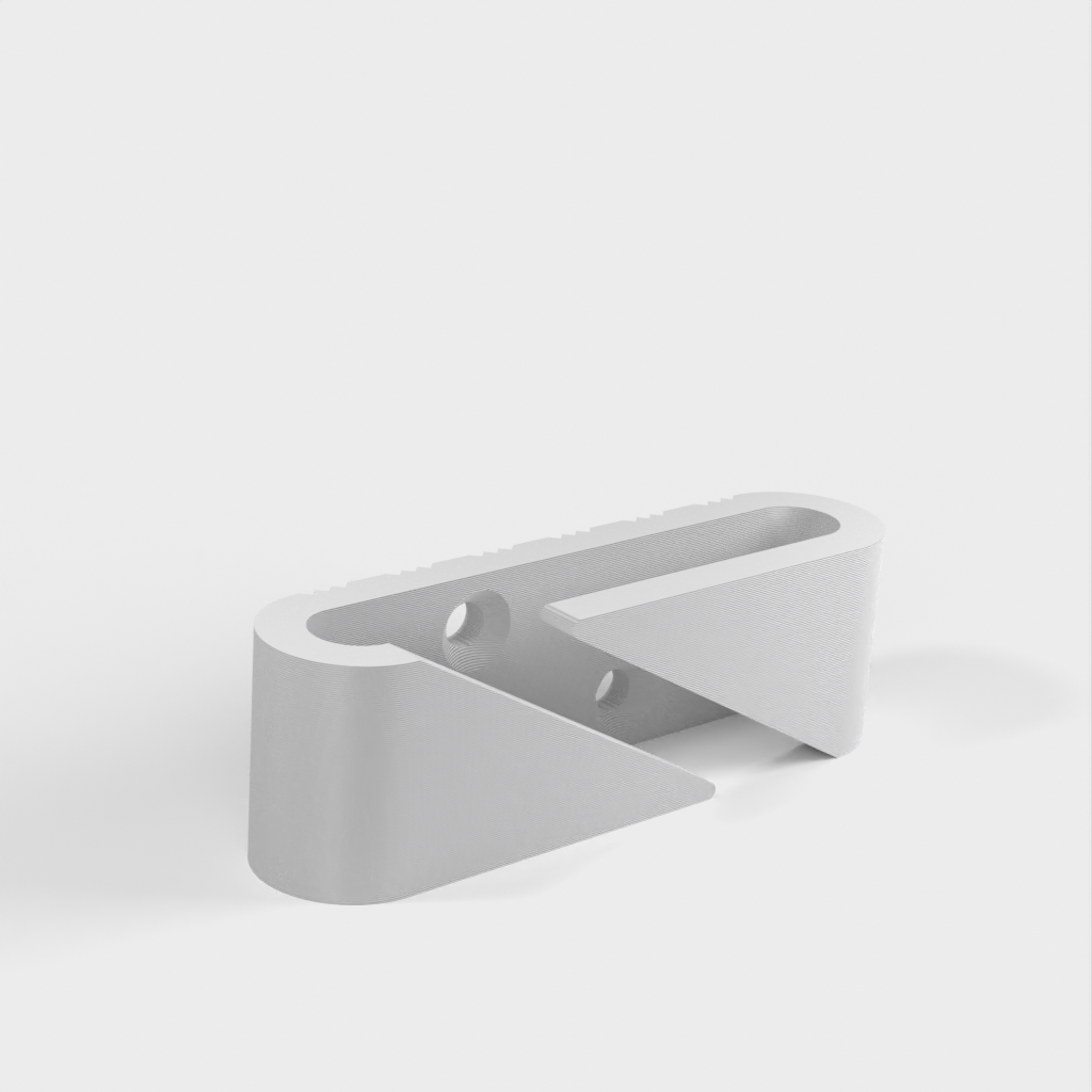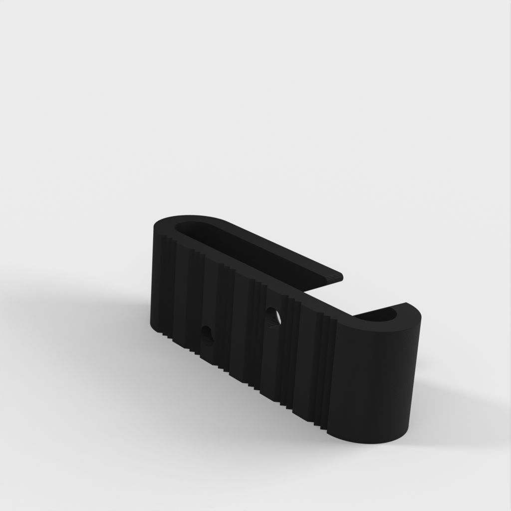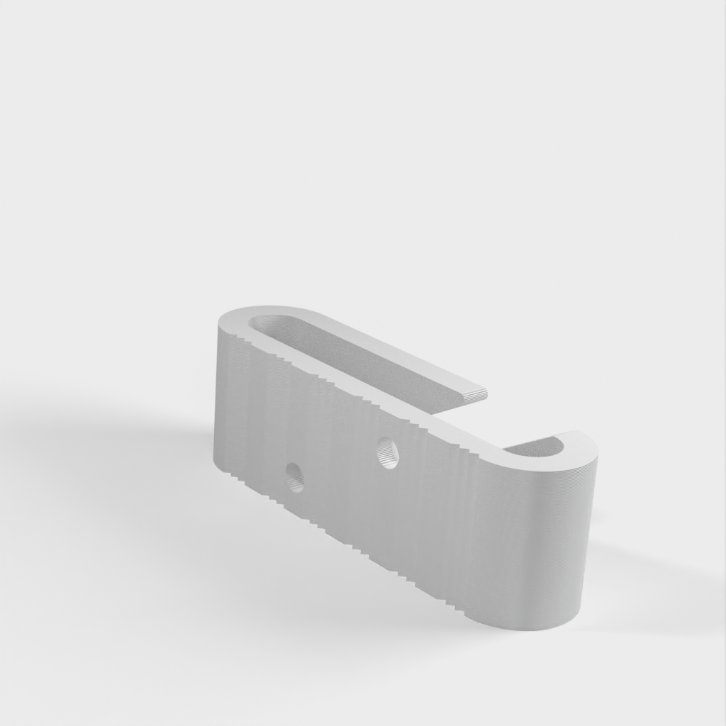 Een kabelhouder die met schroeven aan een oppervlak kan worden bevestigd via de verzonken gaten of zelfs met hete lijm vanwege de groeven.
