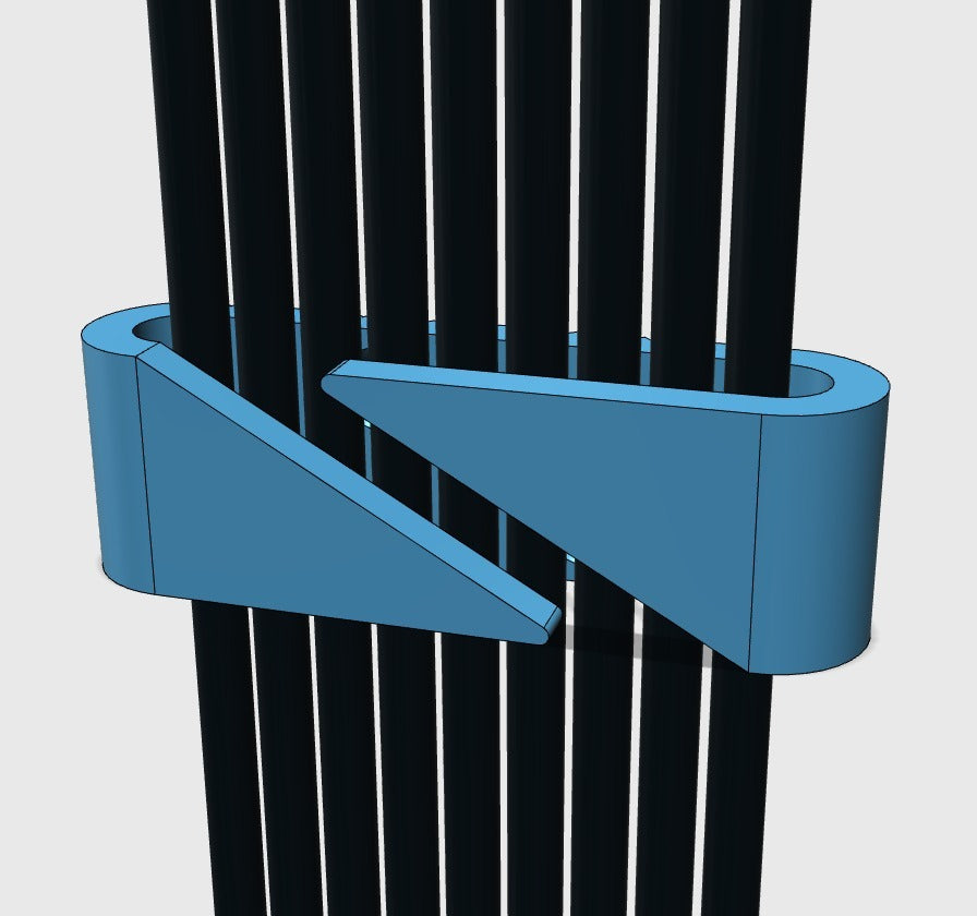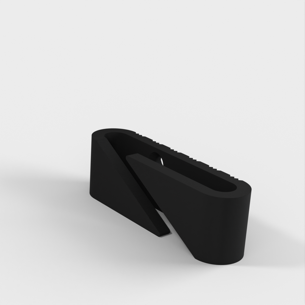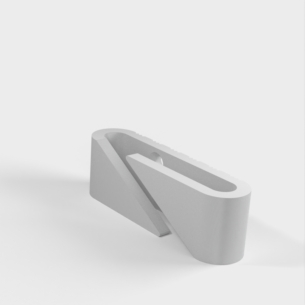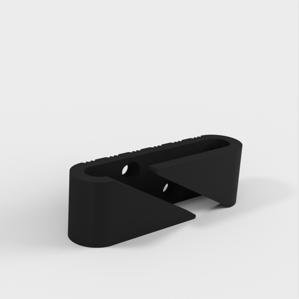 Een kabelhouder die met schroeven aan een oppervlak kan worden bevestigd via de verzonken gaten of zelfs met hete lijm vanwege de groeven.