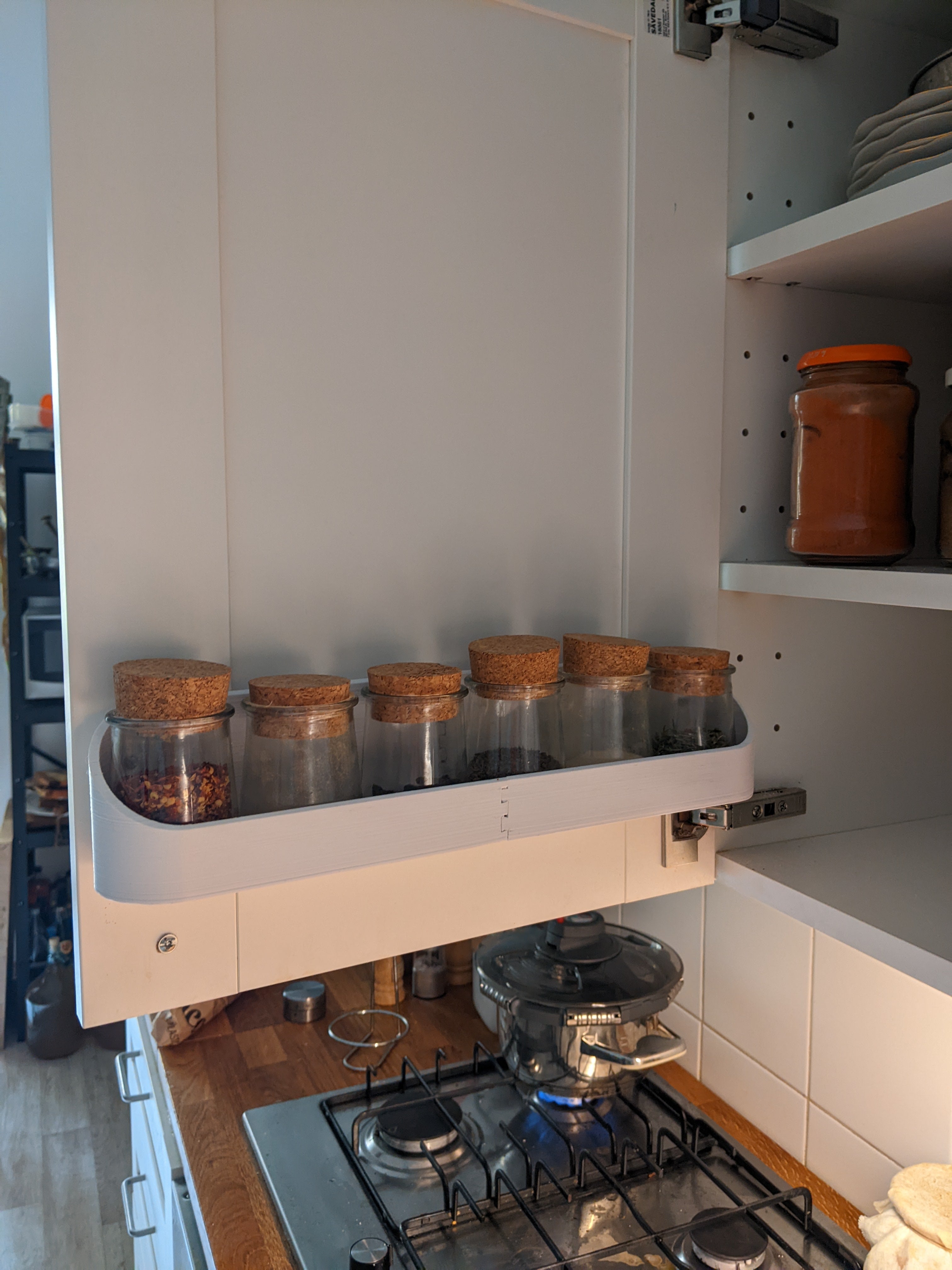 Deze praktische kruidenplank is ontworpen om orde te scheppen in uw keuken. Het is ideaal om uw kruiden georganiseerd en gemakkelijk toegankelijk te bewaren, waardoor koken efficiënter wordt. De kruidenplank is geschikt voor containers met een diameter tot 60 mm en het ontwerp zorgt ervoor dat hij naadloos in standaard IKEA-kasten past. Met deze kruidenopslagoplossing kunt u de ruimte in uw keuken maximaliseren en een opgeruimde en functionele werkruimte creëren. Het is een eenvoudige en effectieve manier om uw keukengerei en ingrediënten bij te houden.