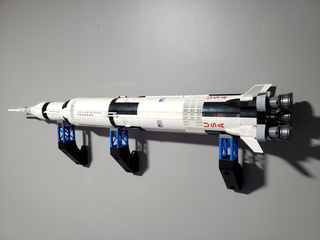 Aan de muur gemonteerde standaard voor het Lego Saturn V-model. Het heeft functies om de Lego-assen vast te houden die de blauwe standaard verbinden die bij het model wordt geleverd. Perfect om uw Lego Saturn V-model aan de muur te tonen.